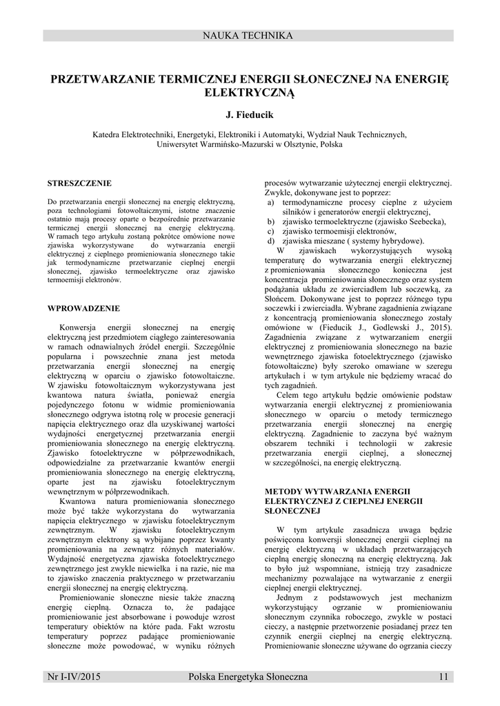 NAUKA TECHNIKA PRZETWARZANIE TERMICZNEJ ENERGII SŁONECZNEJ NA ENERGIĘ ELEKTRYCZNĄ J. Fieducik Katedra Elektrotechniki, Energetyki, Elektroniki i Automatyki, Wydział Nauk Technicznych, Uniwersytet Warmińsko-Mazurski w Olsztynie, Polska STRESZCZENIE Do przetwarzania energii słonecznej na energię elektryczną, poza technologiami fotowoltaicznymi, istotne znaczenie ostatnio mają procesy oparte o bezpośrednie przetwarzanie termicznej energii słonecznej na energię elektryczną. W ramach tego artykułu zostaną pokrótce omówione nowe zjawiska wykorzystywane do wytwarzania energii elektrycznej z cieplnego promieniowania słonecznego takie jak termodynamiczne przetwarzanie cieplnej energii słonecznej, zjawisko termoelektryczne oraz zjawisko termoemisji elektronów. WPROWADZENIE Konwersja energii słonecznej na energię elektryczną jest przedmiotem ciągłego zainteresowania w ramach odnawialnych źródeł energii. Szczególnie popularna i powszechnie znana jest metoda przetwarzania energii słonecznej na energię elektryczną w oparciu o zjawisko fotowoltaiczne. W zjawisku fotowoltaicznym wykorzystywana jest kwantowa natura światła, ponieważ energia pojedynczego fotonu w widmie promieniowania słonecznego odgrywa istotną rolę w procesie generacji napięcia elektrycznego oraz dla uzyskiwanej wartości wydajności energetycznej przetwarzania energii promieniowania słonecznego na energię elektryczną. Zjawisko fotoelektryczne w półprzewodnikach, odpowiedzialne za przetwarzanie kwantów energii promieniowania słonecznego na energię elektryczną, oparte jest na zjawisku fotoelektrycznym wewnętrznym w półprzewodnikach. Kwantowa natura promieniowania słonecznego może być także wykorzystana do wytwarzania napięcia elektrycznego w zjawisku fotoelektrycznym zewnętrznym. W zjawisku fotoelektrycznym zewnętrznym elektrony są wybijane poprzez kwanty promieniowania na zewnątrz różnych materiałów. Wydajność energetyczna zjawiska fotoelektrycznego zewnętrznego jest zwykle niewielka i na razie, nie ma to zjawisko znaczenia praktycznego w przetwarzaniu energii słonecznej na energię elektryczną. Promieniowanie słoneczne niesie także znaczną energię cieplną. Oznacza to, że padające promieniowanie jest absorbowane i powoduje wzrost temperatury obiektów na które pada. Fakt wzrostu temperatury poprzez padające promieniowanie słoneczne może powodować, w wyniku różnych Nr I-IV/2015 procesów wytwarzanie użytecznej energii elektrycznej. Zwykle, dokonywane jest to poprzez: a) termodynamiczne procesy cieplne z użyciem silników i generatorów energii elektrycznej, b) zjawisko termoelektryczne (zjawisko Seebecka), c) zjawisko termoemisji elektronów, d) zjawiska mieszane ( systemy hybrydowe). W zjawiskach wykorzystujących wysoką temperaturę do wytwarzania energii elektrycznej z promieniowania słonecznego konieczna jest koncentracja promieniowania słonecznego oraz system podążania układu ze zwierciadłem lub soczewką, za Słońcem. Dokonywane jest to poprzez różnego typu soczewki i zwierciadła. Wybrane zagadnienia związane z koncentracją promieniowania słonecznego zostały omówione w (Fieducik J., Godlewski J., 2015). Zagadnienia związane z wytwarzaniem energii elektrycznej z promieniowania słonecznego na bazie wewnętrznego zjawiska fotoelektrycznego (zjawisko fotowoltaiczne) były szeroko omawiane w szeregu artykułach i w tym artykule nie będziemy wracać do tych zagadnień. Celem tego artykułu będzie omówienie podstaw wytwarzania energii elektrycznej z promieniowania słonecznego w oparciu o metody termicznego przetwarzania energii słonecznej na energię elektryczną. Zagadnienie to zaczyna być ważnym obszarem techniki i technologii w zakresie przetwarzania energii cieplnej, a słonecznej w szczególności, na energię elektryczną. METODY WYTWARZANIA ENERGII ELEKTRYCZNEJ Z CIEPLNEJ ENERGII SŁONECZNEJ W tym artykule zasadnicza uwaga będzie poświęcona konwersji słonecznej energii cieplnej na energię elektryczną w układach przetwarzających cieplną energię słoneczną na energię elektryczną. Jak to było już wspomniane, istnieją trzy zasadnicze mechanizmy pozwalające na wytwarzanie z energii cieplnej energii elektrycznej. Jednym z podstawowych jest mechanizm wykorzystujący ogrzanie w promieniowaniu słonecznym czynnika roboczego, zwykle w postaci cieczy, a następnie przetworzenie posiadanej przez ten czynnik energii cieplnej na energię elektryczną. Promieniowanie słoneczne używane do ogrzania cieczy Polska Energetyka Słoneczna 11 NAUKA TECHNIKA roboczej jest najczęściej skoncentrowane, po to aby uzyskać możliwie wysoką temperaturę czynnika roboczego. Tak wiec, w wyniku skupienia promieniowania słonecznego uzyskujemy możliwie wysoką temperaturę cieczy, co daje możliwoś możliwość zamiany energii cieplnej na pracę, którą można wykorzystać do napędu klasycznego generatora wytwarzającego energię elektryczną. Ogólnie, urządzenia tego typu są określane jako źródła energii elektrycznej oparte o skoncentrowane promieniowanie słoneczne (CSP - Concentrated Solar Power). Typowe urządzenia tego typu do wytwarzania energii elektrycznej poprzez użycie, ogrzanej przez Słońce cieczy roboczej, to paraboliczne zwierciadła skupiające, zwierciadła liniowe oraz systemy wieżowe. Schematycznie, e, powyższe urządzenia są pokazane na rys. 1. Rys. 1. Schemat procesów prowadzących do ogrzania substancji roboczej poprzez promieniowanie słoneczne; a) zwierciadło paraboloidalne, b) liniowe zwierciadło paraboliczne, c) systemy heliostatów koncentrujących promieniowanie słoneczne na wieży Ostatnio, wdrażane są także do praktycznego użycia inne metody wytwarzania energii elektry elektrycznej z cieplnej energii słonecznej oparte o zjawisko termoelektryczne ( zjawisko Seebecka, odkryte w 1821roku) oraz o zjawisko termoemisji elektronów. Możliwość wykorzystania tych zjawisk do komercyjnego w
