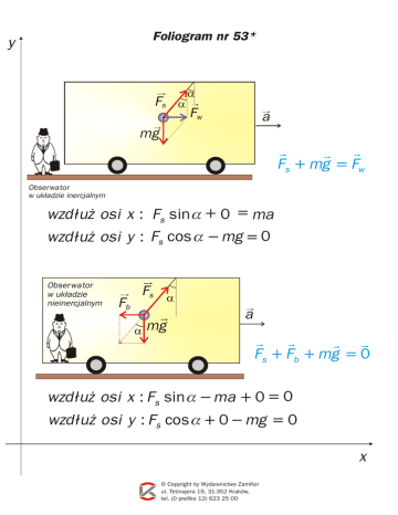 Foliogram nr 53* y Fs a D a Fw a mg r r r Fs + mg = Fw Obserwator w uk³adzie inercjalnym wzd ³ u¿ osi x : Fs sin a + 0 = ma wzd ³ u¿ osi y : Fs cos a - mg = 0 Obserwator w uk³adzie nieinercjalnym D Fb Fs a a mg a r r r r Fs + Fb + mg = 0 wzd ³ u¿ osi x : Fs sin a - ma + 0 = 0 wzd ³ u¿ osi y : Fs cos a + 0 - mg = 0 x © Copyright by Wydawnictwo ZamKor ul. Tetmajera 19, 31-352 Kraków, tel. (0 prefiks 12) 623 25 00