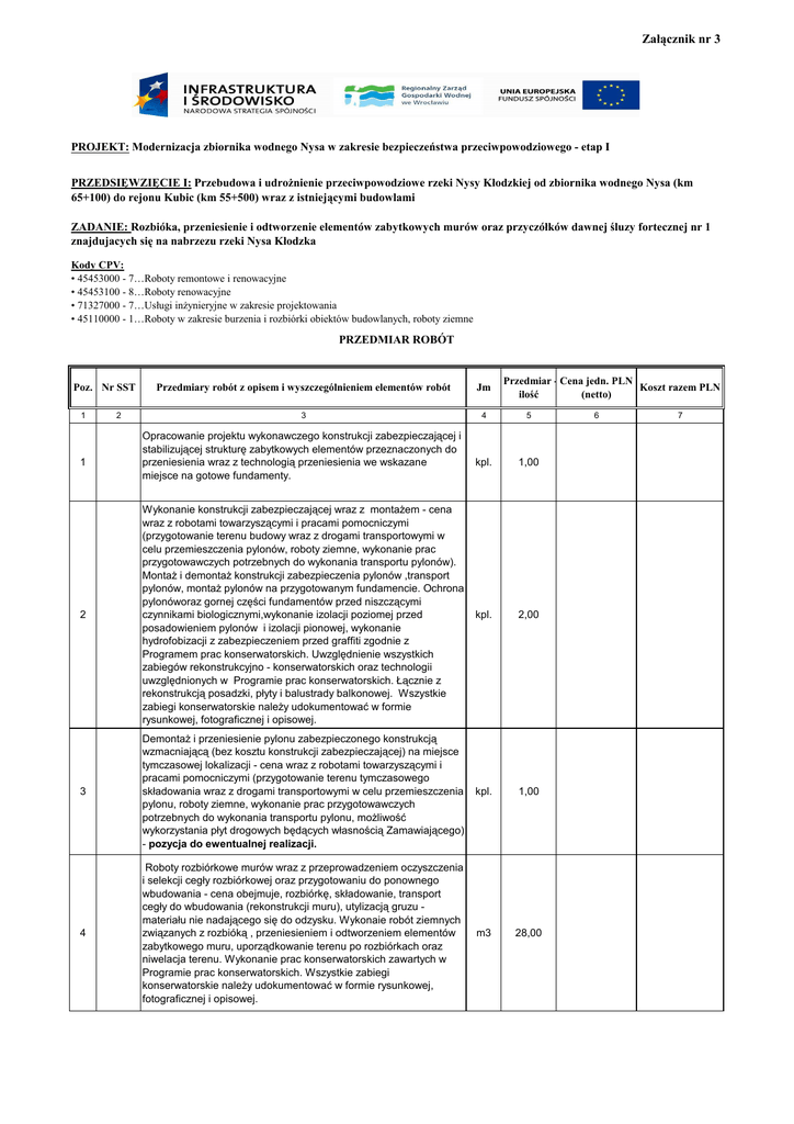 Załącznik nr 3 PROJEKT: Modernizacja zbiornika wodnego Nysa w zakresie bezpieczeństwa przeciwpowodziowego - etap I PRZEDSIĘWZIĘCIE I: Przebudowa i udrożnienie przeciwpowodziowe rzeki Nysy Kłodzkiej od zbiornika wodnego Nysa (km 65+100) do rejonu Kubic (km 55+500) wraz z istniejącymi budowlami ZADANIE: Rozbióka, przeniesienie i odtworzenie elementów zabytkowych murów oraz przyczółków dawnej śluzy fortecznej nr 1 znajdujacych się na nabrzezu rzeki Nysa Kłodzka Kody CPV: • 45453000 - 7…Roboty remontowe i renowacyjne • 45453100 - 8…Roboty renowacyjne • 71327000 - 7…Usługi inżynieryjne w zakresie projektowania • 45110000 - 1…Roboty w zakresie burzenia i rozbiórki obiektów budowlanych, roboty ziemne PRZEDMIAR ROBÓT Poz. Nr SST Przedmiar - Cena jedn. PLN Koszt razem PLN ilość (netto) Przedmiary robót z opisem i wyszczególnieniem elementów robót Jm 3 4 5 kpl. 1,00 2 Wykonanie konstrukcji zabezpieczającej wraz z montażem - cena wraz z robotami towarzyszącymi i pracami pomocniczymi (przygotowanie terenu budowy wraz z drogami transportowymi w celu przemieszczenia pylonów, roboty ziemne, wykonanie prac przygotowawczych potrzebnych do wykonania transportu pylonów). Montaż i demontaż konstrukcji zabezpieczenia pylonów ,transport pylonów, montaż pylonów na przygotowanym fundamencie. Ochrona pylonóworaz gornej części fundamentów przed niszczącymi czynnikami biologicznymi,wykonanie izolacji poziomej przed posadowieniem pylonów i izolacji pionowej, wykonanie hydrofobizacji z zabezpieczeniem przed graffiti zgodnie z Programem prac konserwatorskich. Uwzględnienie wszystkich zabiegów rekonstrukcyjno - konserwatorskich oraz technologii uwzględnionych w Programie prac konserwatorskich. Łącznie z rekonstrukcją posadzki, płyty i balustrady balkonowej. Wszystkie zabiegi konserwatorskie należy udokumentować w formie rysunkowej, fotograficznej i opisowej. kpl. 2,00 3 Demontaż i przeniesienie pylonu zabezpieczonego konstrukcją wzmacniającą (bez kosztu konstrukcji zabezpieczającej) na miejsce tymczasowej lokalizacji - cena wraz z robotami towarzyszącymi i pracami pomocniczymi (przygotowanie terenu tymczasowego składowania wraz z drogami transportowymi w celu przemieszczenia pylonu, roboty ziemne, wykonanie prac przygotowawczych potrzebnych do wykonania transportu pylonu, możliwość wykorzystania płyt drogowych będących własnością Zamawiającego) - pozycja do ewentualnej realizacji. kpl. 1,00 4 Roboty rozbiórkowe murów wraz z przeprowadzeniem oczyszczenia i selekcji cegły rozbiórkowej oraz przygotowaniu do ponownego wbudowania - cena obejmuje, rozbiórkę, składowanie, transport cegły do wbudowania (rekonstrukcji muru), utylizacją gruzu materiału nie nadającego się do odzysku. Wykonaie robót ziemnych związanych z rozbióką , przeniesieniem i odtworzeniem elementów zabytkowego muru, uporządkowanie terenu po rozbiórkach oraz niwelacja terenu. Wykonanie prac konserwatorskich zawartych w Programie prac konserwatorskich. Wszystkie zabiegi konserwatorskie należy udokumentować w formie rysunkowej, fotograficznej i opisowej. m3 28,00 1 1 2 Opracowanie projektu wykonawczego konstrukcji zabezpieczającej i stabilizującej strukturę zabytkowych elementów przeznaczonych do przeniesienia wraz z technologią przeniesienia we wskazane miejsce na gotowe fundamenty. 6 7 Załącznik nr 3 Poz. Nr SST 1 Przedmiary robót z opisem i wyszczególnieniem elementów robót Jm 2 Przedmiar - Cena jedn. PLN Koszt razem PLN ilość (netto) 3 4 5 5 Mechaniczne roboty rozbiórkowe muru nie nadającego się do odzysku - cena obejmuje , rozbiórkę elementów z cegły, kamienia, betonowych oraz innych elementów zabytkowego muru wraz z utylizacją gruzu - materiał nie nadający się do odzysku,Należy uwzględnić koszty wywozu oraz opłaty za wysypisko. Wykonaie robót ziemnych związanych z rozbióką, uporządkowaniem terenu po rozbiórkach oraz niwelacja terenu. m3 35,00 6 Wykonaie rekonstrukcji fragmentów ceglanych murów krenelażowych przylegajacych do pylonu nadbrzeża lewego na przygotowanym oczepie żelbetowym z wykonaniem izolacji poziomej i pionowej, maksymalnym wykorzystaniem cegły z robiórki i uzupełnienim brakujacych elementów nowymi kształtkami ceramicznymi o analogicznych wymiarach i zgodnej kolorystyce, zgodnie z Programem prac konserwatorskich. Wraz z ochroną murów przed niszczącymi czynnikami biologicznymi, hydrofobizacją i zabezpieczeniem przed graffiti zgodnie z Programem prac konserwatorskich. Wszystkie zabiegi konserwatorskie należy udokumentować w formie rysunkowej, fotograficznej i opisowej. m3 10,60 7 Odtworzenie fragmentu muru oporowego, grubości 25 cm, z cegły zabytkowej do uzupełnienia (lico muru oporowego) przylegajacego do pylonu nadbrzeża lewego i prawego na przygotowanym murze oporowym z grodzic i betonu, z wykonaniem izolacji poziomej i pionowej z maksymalnym wykorzystaniem cegły z robiórki i uzupełnieniem brakujacych elementów nowymi kształtkami ceramicznymi o analogicznych wymiarach i zgodnej kolorystyce, zgodnie z Programem prac konserwatorskich. Wraz z ochroną murów przed niszczącymi czynnikami biologicznymi, hydrofobizacją i zabezpieczeniem przed graffiti zgodnie z Programem prac konserwatorskich. Wszystkie zabiegi konserwatorskie należy udokumentować w formie rysunkowej, fotograficznej i opisowej. m3 17,40 6 7 RAZEM WARTOŚĆ NETTO: PODATEK VAT 23%: RAZEM WARTOŚĆ BRUTTO: Data: …………………... Podpis Wykonawcy: ………………………….…………