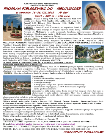 P.H.U.”PIOTREX” BIURO PIELGRZYMKOWO – TURYSTYCZNE PIOTR-TRAVEL PROGRAM PIELGRZYMKI DO MEDJUGORIE w terminie: 18-26.VII.2015 /9 dni/ koszt : 500 zł + 180 euro 1 DZIEŃ – Wyjazd z Białej Podl. 3.30, z Międzyrzeca Podl. 4.00 zbiórka przy Banku PKO, Siedlce 4.30, Lublin 6.00, Msza Św., Zamość 8.00, Biłgoraj 9.00, Rzeszów 11.00, Dukla 13.00. Przejazd przez Słowację i Węgry. 2 DZIEŃ – Przejazd przez Chorwację na terytorium Bośni i Hercegowiny- gdzie znajduje się miejsce objawień Matki Bożej. Przyjazd do Medjugorie w godz. porannych. Śniadanie, zakwaterowanie. Odpoczynek. Zwiedzanie Obiadokolacja. Udział w Modlitwach wieczornych, Międzynarodowa Msza Św. w kościele Św. Jakuba w Medjugorie. Nocleg. OD 3 – 7 DNIA - Wspólny udział w Międzynarodowej Mszy św. i różańcu w parafialnym kościele św. Jakuba; Droga Krzyżowa na GÓRZE KRIŻEVAC; wejście na GÓRĘ OBJAWIEŃ–PODBRDO i wspólny różaniec. Spotkanie w OAZIE CENACOLO–WIECZERNIKU z młodzieżą ze Wspólnoty Cenacolo, którzy opowiadają jak poprzez wiarę i pracę uwolnili się z różnego typu uzależnień i nałogów. Spotkanie ze Wspólnotą Błogosławieństw poświęcone zawierzeniu swojego życia Matce Bożej. Spotkanie w zamku z Patrickiem i Nancy byłymi kanadyjskimi multimilionerami, którzy pod wpływem Matki Boskiej Medjugorskiej doznali nawrócenia. Nawiedzenie Kaplicy Dzieciątka Jezus. Spotkania z osobami widzącymi Matkę Bożą, zakonnikami pracującymi w Sanktuarium Królowej Pokoju – spotkania uzależniamy od dyspozycyjności tych osób. Wyjazd do MOSTARU. Wyjazd nad Wodospady KRAVICE W czasie pobytu w Medjugorie Msza Św. w słynnym Chorwackim Lourdes i odpoczynek na pobliskiej plaży w Makarskiej. 8 DZIEŃ – po śniadaniu wyjazd w drogę powrotną. Msza św. w Tihalinie gdzie jest figurka Matki Bożej, która wg. widzących najbardziej przypomina Matkę Bożą. Nawiedzenie Sanktuarium Marija Bistrica, w Chorwacji, które określane bywa przez samych Chorwatów „chorwacką Częstochową”. Obiadokolacja i nocleg w Ludbregu. 9 DZIEŃ – Msza św. w Sanktuariu Krwi Chrystusa w Ludbregu Powrót do Polski w godz. wieczornych. Świadczenia : - transport autokarem klasy turystycznej - 6 noclegów w Medjugorie - 1 nocleg w Ludbergu - w Medjugorie każdego dnia 2 posiłki: śniadania i obiadokolacje - ubezpieczenie obejmujący KL i NNW /koszt leczenia za granicą/ - opieka pilota i duszpasterza Zabieramy ze sobą m.in.: ważny dowód osobisty lub paszport, telefon lub radio ze słuchawkami w celu odbioru tłumaczenia Mszy św. i Adoracji Najświętszego Sakramentu na język polski, lekarstwa - które przyjmujemy, wygodne obuwie, nakrycie głowy, odpowiednie obówie do wody, strój kąpielowy Wyżywienie we własnym zakresie na terenie Polski. Miejsca zbiórek pielgrzymów: Lublin - Dworzec PKS, Biłgoraj, Zamość, Rzeszów, Warszawa-Dworzec Zach, Częstochowa, Katowice - dworzec PKP; Dęblin, Puławy, Radom, Kielce, Kraków-Łagiewniki, Toruń, Łódź, Wrocław. Istnieje możliwość zorganizowania wyjazdu z każdej miejscowości w kraju. Przyjmujemy zamówienia na wyjazdy grupowe i organizowane przez parafie. Organizator zastrzega sobie prawo wprowadzenia zmian w programie w przypadku zaistnienia sytuacji od organizatora niezależnych. Szczegóły ustala pilot w porozumieniu z kierownikiem grupy. Rezerwację potwierdza wpłata zaliczki. Pełną kwotę w złotówkach należy dokonać miesiąc przez wyjazdem. Opłaty w Euro dokonujemy dla pilota grupy – w autokarze lub na konto Biura. Informacje i zapisy: Międzyrzec Podlaski, ul. Brzeska 23 Tel./fax: 83/3716831 w godz.9.00 – 17.00, kom. 604464878 w godz. do 22.00 lub 604464877. E-mail: [email protected] lub [email protected], www.piotrtravel.pl Nr.konta: P.H.U.”PIOTREX”Eksport-Import Piotr Łosicki ul. Brzeska 23, 21-560 Międzyrzec Podl. PKO BP: PLN: 41 1020 1260 0000 0202 0053 9171, EURO: 72 1020 1260 0000 0102 0063 1200 SERDECZNIE ZAPRASZAMY