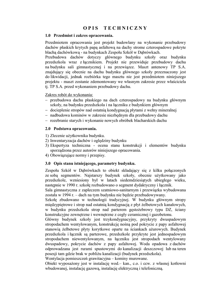 OPIS TECHNICZNY 1.0 Przedmiot i zakres opracowania. Przedmiotem opracowania jest projekt budowlany na wykonanie przebudowy dachów płaskich krytych papą asfaltową na dachy strome czterospadowe pokryte blachą dachówkową - na budynkach Zespołu Szkół w Dąbrówkach. Przebudowa dachów dotyczy głównego budynku szkoły oraz budynku przedszkola wraz z łącznikiem. Projekt nie przewiduje przebudowy dachu na budynku sali gimnastycznej i na przewiązce. Maszt antenowy TP S.A. znajdujący się obecnie na dachu budynku głównego szkoły przeznaczony jest do likwidacji, jednak rozbiórka tego masztu nie jest przedmiotem niniejszego projektu - maszt zostanie zdemontowany we własnym zakresie przez właściciela tj. TP S.A. przed wykonaniem przebudowy dachu. Zakres robót do wykonania: − przebudowa dachu płaskiego na dach czterospadowy na budynku głównym szkoły, na budynku przedszkola i na łączniku z budynkiem głównym − docieplenie stropów nad ostatnią kondygnacją płytami z wełny mineralnej − nadbudowa kominów w zakresie niezbędnym dla przebudowy dachu − rozebranie starych i wykonanie nowych obróbek blacharskich dachu 2.0 Podstawa opracowania. 1) Zlecenie uŜytkownika budynku. 2) Inwentaryzacja dachów i oględziny budynku 3) Ekspertyza techniczna - ocena stanu konstrukcji i elementów budynku sporządzona przez autorów niniejszego opracowania. 4) Obowiązujące normy i przepisy. 3.0 Opis stanu istniejącego, parametry budynku. Zespołu Szkół w Dąbrówkach to obiekt składający się z kilku połączonych ze sobą segmentów. Najstarszy budynek szkoły, obecnie uŜytkowany jako przedszkole, wzniesiony był w latach siedemdziesiątych ubiegłego wieku, następnie w 1990 r. szkołę rozbudowano o segment dydaktyczny i łącznik. Sala gimnastyczna z zapleczem szatniowo-sanitarnym i przewiązka wybudowana została w 1994 r. – dach na tym budynku nie będzie przebudowywany. Szkołę zbudowano w technologii tradycyjnej. W budynku głównym stropy międzypiętrowe i strop nad ostatnią kondygnacją z płyt Ŝelbetowych kanałowych, w budynku przedszkola strop nad parterem gęstoŜebrowy typu DZ, ściany konstrukcyjne zewnętrzne i wewnętrzne z cegły ceramicznej i gazobetonu. Główny budynek szkoły jest trzykondygnacyjny, przykryty dwuspadowym stropodachem wentylowanym, konstrukcję nośną pod pokrycie z papy asfaltowej stanowią Ŝelbetowe płyty korytkowe oparte na ściankach aŜurowych. Budynek przedszkola i łącznik są parterowe, przedszkole przykryte jest jednospadowym stropodachem niewentylowanym, na łączniku jest stropodach wentylowany dwuspadowy, pokrycie dachów z papy asfaltowej. Woda opadowa z dachów odprowadzana jest rurami spustowymi do kanalizacji deszczowej lub na teren posesji tam gdzie brak w pobliŜu kanalizacji (budynek przedszkola). Wentylacja pomieszczeń grawitacyjna – kominy murowane. Obiekt wyposaŜony jest w instalację wod.– kan., c.o. i ccw. z własnej kotłowni wbudowanej, instalację gazową, instalację elektryczną i telefoniczną. 2 Parametry budynku: stan istniejący stan projektowany 2 2 680,5 m2 - powierzchnia uŜytkowa - 2 680,5 m - powierzchnia zabudowy - 1 594,0 m2 1 594,0 m2 - kubatura budynku - 12 603,1 m3 14 133,4 m3 Projektowana przebudowa dachu ma na celu wyłącznie wykonanie konstrukcji pod pokrycie z blachy dachówkowej, nie przewiduje się przystosowania powierzchni pod pokryciem na cele uŜytkowe – budynek po wykonaniu przebudowy dachów będzie miał tyle samo kondygnacji uŜytkowych. 4.0 Opis robót do wykonania. - przebudowa dachu na budynku głównym szkoły Projektowana przebudowa dachu ma na celu wykonanie czterospadowej konstrukcji drewnianej pod pokrycie z blachy dachówkowej - projekt przewiduje pozostawienie istniejącego Ŝelbetowego stropu z płyt kanałowych nad ostatnią kondygnacją, docieplenie go od góry płytami z wełny mineralnej i wykonanie podniesionej konstrukcji drewnianej pod pokrycie z blachy dachówkowej. Rozebrać naleŜy wszystkie obróbki blacharskie dachu, rynny dachowe, górne odcinki rur spustowych oraz czapki kominowe. Rozebrać pokrycie z papy asfaltowej oraz rozkuć wylewkę cementową na złączach płyt korytkowych. Zdemontować dźwigiem dachowe płyty korytkowe oraz rozebrać ścianki aŜurowe i ogniomury z cegły. Do usuwania gruzu z dachu uŜywać dźwigu i pojemnika lub systemowych spustów z tworzywa albo rynien drewnianych. Gruz z rozbiórki wywieźć na wskazane przez inwestora miejsce, teren posesji uporządkować. Na zewnętrznych wieńcach stropu zamontować dookoła budynku murłaty i wykonać drewnianą konstrukcję dachową pod pokrycie z blachodachówki. Zaprojektowano czterospadowy drewniany dach płatwiowo-kleszczowy. Konstrukcję dachową wykonać z drewna klasy C27 – wg rysunków konstrukcyjnych. Drewno zaimpregnować naleŜy ciśnieniowo preparatem ogniochronnym np. Fobos M4 (dla uzyskania niepalności drewna i NRO), zgodnie z zaleceniami producenta preparatu. Nadmurować kominy wentylacyjne z cegły ceramicznej pełnej do wysokości zapewniającej prawidłowy ciąg, uzupełnić tynk ponad dachem i wykonać na kominach Ŝelbetowe czapki kominowe. Projekt przewiduje zmianę usytuowania wyłazu dachowego. W tym celu konieczne jest wycięcie otworu 88x88cm w płytach stropowych nad ostatnią kondygnacją. Otwór naleŜy wykonać w płycie kanałowej o szer. minimum 1,20m, tak aby dwa skrajne Ŝebra płyty pozostały nienaruszone. Dla przeniesienia obciąŜeń z przeciętej płyty stropowej zaprojektowano podparcie z belek stalowych - wykonać naleŜy podwieszenie przeciętych płyt na belkach 2xC120 ułoŜonych na stropie nad piętrem – wg rysunku konstrukcyjnego. Roboty rozpocząć naleŜy od skucia tynku na suficie w miejscu projektowanego otworu. Po oczyszczeniu powierzchni płyt stropowych przebić naleŜy w płytach otwory w kanałach dla zamontowania od spodu wieszaków z pręta ø 16 wygiętych w kształcie litery U (giętych na gorąco).