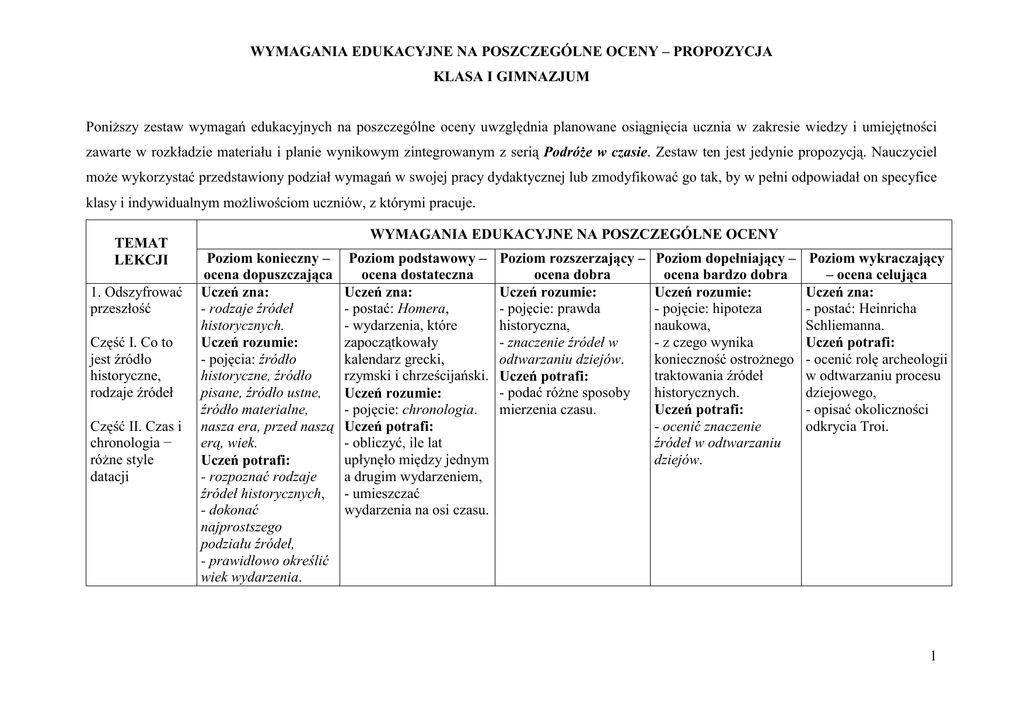 WYMAGANIA EDUKACYJNE NA POSZCZEGÓLNE OCENY – PROPOZYCJA KLASA I GIMNAZJUM Poniższy zestaw wymagań edukacyjnych na poszczególne oceny uwzględnia planowane osiągnięcia ucznia w zakresie wiedzy i umiejętności zawarte w rozkładzie materiału i planie wynikowym zintegrowanym z serią Podróże w czasie. Zestaw ten jest jedynie propozycją. Nauczyciel może wykorzystać przedstawiony podział wymagań w swojej pracy dydaktycznej lub zmodyfikować go tak, by w pełni odpowiadał on specyfice klasy i indywidualnym możliwościom uczniów, z którymi pracuje. TEMAT LEKCJI 1. Odszyfrować przeszłość Część I. Co to jest źródło historyczne, rodzaje źródeł Część II. Czas i chronologia − różne style datacji WYMAGANIA EDUKACYJNE NA POSZCZEGÓLNE OCENY Poziom konieczny – ocena dopuszczająca Uczeń zna: - rodzaje źródeł historycznych. Uczeń rozumie: - pojęcia: źródło historyczne, źródło pisane, źródło ustne, źródło materialne, nasza era, przed naszą erą, wiek. Uczeń potrafi: - rozpoznać rodzaje źródeł historycznych, - dokonać najprostszego podziału źródeł, - prawidłowo określić wiek wydarzenia. Poziom podstawowy – ocena dostateczna Uczeń zna: - postać: Homera, - wydarzenia, które zapoczątkowały kalendarz grecki, rzymski i chrześcijański. Uczeń rozumie: - pojęcie: chronologia. Uczeń potrafi: - obliczyć, ile lat upłynęło między jednym a drugim wydarzeniem, - umieszczać wydarzenia na osi czasu. Poziom rozszerzający – ocena dobra Uczeń rozumie: - pojęcie: prawda historyczna, - znaczenie źródeł w odtwarzaniu dziejów. Uczeń potrafi: - podać różne sposoby mierzenia czasu. Poziom dopełniający – ocena bardzo dobra Uczeń rozumie: - pojęcie: hipoteza naukowa, - z czego wynika konieczność ostrożnego traktowania źródeł historycznych. Uczeń potrafi: - ocenić znaczenie źródeł w odtwarzaniu dziejów. Poziom wykraczający – ocena celująca Uczeń zna: - postać: Heinricha Schliemanna. Uczeń potrafi: - ocenić rolę archeologii w odtwarzaniu procesu dziejowego, - opisać okoliczności odkrycia Troi. 1 2. Pierwsi ludzie Uczeń zna: - cechy, które Część I. Zanim odróżniają człowieka pojawił się od małp człowiek człekokształtnych. Uczeń rozumie: Część II. Ludzie - pojęcia: prehistoria, epoki paleolitu paleolit (starsza epoka kamienna), człowiek rozumny współczesny. Uczeń potrafi: - wskazać na mapie kontynent uznawany za kolebkę ludzkości, - dokonać periodyzacji historii. 3. O pierwszych Uczeń zna: rolnikach - podstawowe zajęcia ludności epoki neolitu. Uczeń rozumie: - pojęcia: neolit (młodsza epoka kamienna), rewolucja neolityczna. Uczeń potrafi: - wskazać na mapie obszar Bliskiego Wschodu, - wyjaśnić, dlaczego zmiany w sposobie życia ludzi neolitu nazwano rewolucją, - porównać koczowniczy tryb życia z osiadłym. Uczeń zna: - ramy chronologiczne epoki paleolitu. Uczeń potrafi: - scharakteryzować epokę paleolitu. Uczeń zna: - ramy chronologiczne epoki neolitu. Uczeń potrafi: - przedstawić czynniki, które miały wpływ na zmianę trybu życia ludzi epoki neolitu, - opisać skutki przyjęcia przez człowieka osiadłego trybu życia. Uczeń rozumie: - pojęcia: lądolód, gromada, - znaczenie uzyskania umiejętności rozpalania ognia dla rozwoju cywilizacyjnego człowieka pierwotnego. Uczeń potrafi: - opowiedzieć o życiu ludzi epoki paleolitu, - wyjaśnić zależności pomiędzy środowiskiem geograficznym a warunkami życia człowieka. Uczeń potrafi: - opowiedzieć o życiu ludzi epoki neolitu. Uczeń rozumie: - związek między wynalezieniem pisma a początkiem historii człowieka. Uczeń potrafi: - scharakteryzować system wierzeń ludzi paleolitu. Uczeń potrafi: - opisać okoliczności odkrycia jaskini w Lascaux. Uczeń potrafi: - opisać sposób wytwarzania kamiennych narzędzi i wyrobów z gliny w epoce neolitu. Uczeń potrafi: - ocenić wpływ postępu technicznego na polepszenie warunków życia człowieka. 2 4. O Żyznym Półksiężycu 5. W państwie faraona Część I. Jak powstał Egipt Część II. Pod władzą faraona Uczeń zna: - postać: Hammurabiego. Uczeń rozumie: - pojęcia: cywilizacja, Żyzny Półksiężyc, Mezopotamia (Międzyrzecze), Sumerowie, politeizm (wielobóstwo), pismo klinowe. Uczeń potrafi: - lokalizować na mapie Żyzny Półksiężyc, Mezopotamię, Babilonię, Eufrat i Tygrys, - przedstawić osiągnięcia cywilizacji sumeryjskiej i babilońskiej. Uczeń zna: - najważniejsze osiągnięcia cywilizacji egipskiej. Uczeń rozumie: - pojęcia: państwo, faraon, monarchia despotyczna. Uczeń potrafi: - lokalizować w czasie i przestrzeni cywilizację egipską, - określić zakres Uczeń zna: - wybrane przepisy zawarte w Kodeksie Hammurabiego. Uczeń rozumie: - pojęcia: system irygacyjny, handel wymienny, miastopaństwo. Uczeń potrafi: - omówić warunki naturalne panujące na terenie Mezopotamii, - wyjaśnić znaczenie pisma i prawa w procesie powstawania państwa. Uczeń zna: - kształt pisma klinowego. Uczeń rozumie: - pojęcia: zikkurat, brąz, kodeks. Uczeń potrafi: - opisać wpływ środowiska naturalnego na życie ludzi cywilizacji nadrzecznych. Uczeń rozumie: - pojęcie: podział pracy. Uczeń potrafi: - opisać wygląd sumeryjskiego miastapaństwa, - określić, kiedy na terenie Mezopotamii pojawiła się cywilizacja Sumerów. Uczeń potrafi: - dostrzec przejawy świadomej ingerencji człowieka w środowisko naturalne, - wskazać różnice między starożytnymi a współczesnymi przepisami prawa. Uczeń zna: - grupy społeczne wchodzące w skład społeczeństwa egipskiego. Uczeń rozumie: - pojęcia: hieroglify, papirus. Uczeń potrafi: - omówić warunki naturalne panujące na terenie Egiptu, - opisać wpływ Uczeń rozumie: - pojęcia: pismo „ludowe”, geometria. Uczeń potrafi: - scharakteryzować poszczególne grupy społeczeństwa egipskiego i ich rolę w państwie, - opisać życie codzienne mieszkańców 