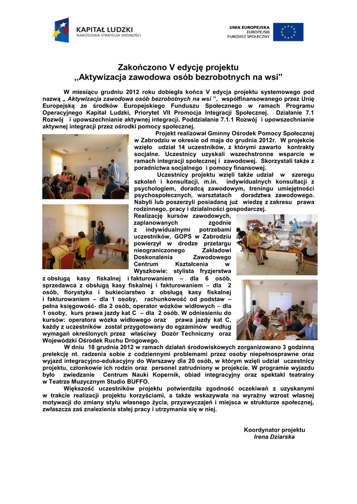 Zakończono V edycję projektu ,,Aktywizacja zawodowa osób bezrobotnych na wsi” W miesiącu grudniu 2012 roku dobiegła końca V edycja projektu systemowego pod nazwą „ Aktywizacja zawodowa osób bezrobotnych na wsi ”, współfinansowanego przez Unię Europejską ze środków Europejskiego Funduszu Społecznego w ramach Programu Operacyjnego Kapitał Ludzki, Priorytet VII Promocja Integracji Społecznej. Działanie 7.1 Rozwój i upowszechnianie aktywnej integracji. Poddziałanie 7.1.1 Rozwój i upowszechnianie aktywnej integracji przez ośrodki pomocy społecznej. Projekt realizował Gminny Ośrodek Pomocy Społecznej w Zabrodziu w okresie od maja do grudnia 2012r. W projekcie wzięło udział 14 uczestników, z którymi zawarto kontrakty socjalne. Uczestnicy uzyskali wszechstronne wsparcie w ramach integracji społecznej i zawodowej. Skorzystali także z poradnictwa socjalnego i pomocy finansowej. Uczestnicy projektu wzięli także udział w szeregu szkoleń i konsultacji, m.in. indywidualnych konsultacji z psychologiem, doradcą zawodowym, treningu umiejętności psychospołecznych, warsztatach doradztwa zawodowego. Nabyli lub poszerzyli posiadaną już wiedzę z zakresu prawa rodzinnego, pracy i działalności gospodarczej. Realizację kursów zawodowych, zaplanowanych zgodnie z indywidualnymi potrzebami uczestników, GOPS w Zabrodziu powierzył w drodze przetargu nieograniczonego Zakładowi Doskonalenia Zawodowego Centrum Kształcenia w Wyszkowie: stylista fryzjerstwa z obsługą kasy fiskalnej i fakturowaniem – dla 6 osób, sprzedawca z obsługą kasy fiskalnej i fakturowaniem – dla 2 osób, florystyka i bukieciarstwo z obsługą kasy fiskalnej i fakturowaniem – dla 1 osoby, rachunkowość od podstaw – pełna księgowość- dla 2 osób, operator wózków widłowych – dla 1 osoby, kurs prawa jazdy kat C – dla 2 osób. W odniesieniu do kursów: operatora wózka widłowego oraz prawa jazdy kat C, każdy z uczestników został przygotowany do egzaminów według wymagań określonych przez właściwy Dozór Techniczny oraz Wojewódzki Ośrodek Ruchu Drogowego. W dniu 18 grudnia 2012 w ramach działań środowiskowych zorganizowano 3 godzinną prelekcję nt. radzenia sobie z codziennymi problemami przez osoby niepełnosprawne oraz wyjazd integracyjno-edukacyjny do Warszawy dla 20 osób, w którym wzięli udział uczestnicy projektu, członkowie ich rodzin oraz personel zatrudniony w projekcie. W programie wyjazdu było zwiedzanie Centrum Nauki Kopernik, obiad integracyjny oraz spektakl teatralny w Teatrze Muzycznym Studio BUFFO. Większość uczestników projektu potwierdziła zgodność oczekiwań z uzyskanymi w trakcie realizacji projektu korzyściami, a także wskazywała na wyraźny wzrost własnej motywacji do zmiany stylu własnego życia, przyzwyczajeń i miejsca w strukturze społecznej, zwłaszcza zaś znalezienia stałej pracy i utrzymania się w niej. Koordynator projektu Irena Dziarska