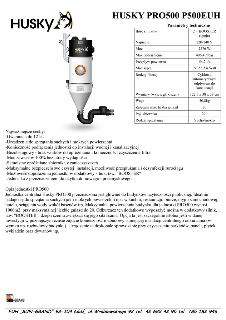 HUSKY PRO500 P500EUH Parametry techniczne Ilość silników Napięcie Moc Max podciśnienie Przepływ powietrza 2 + BOOSTER (opcja) 220-240 V 2576 W 406,4 mbar 54,2 l/s Moc ssąca 2x355 Air Watt Rodzaj filtracji Cyklon z automatycznym odpływem do kanalizacji Wymiary (wys. x gł. x szer.) Waga 122,5 x 38 x 38 cm 30,8kg Zalecana max liczba gniazd 20 Poj. zbiornika 29 l Rodzaj sprzątania Sucho/mokro Najważniejsze cechy: -Gwarancja do 12 lat -Urządzenie do sprzątania suchych i mokrych powierzchni -Konieczność podłączenia jednostki do instalacji wodnej i kanalizacyjnej -Bezobsługowy - brak worków do opróżniania i konieczności czyszczenia filtra -Moc zawsze w 100% bez utraty wydajności -Samoistne opróżniane zbiornika z zanieczyszczeń -Maksymalne bezpieczeństwo czystej instalacji, możliwość przepłukania i dezynfekcji rurociągu -Możliwość doposażenia jednostki w dodatkowy silnik, tzw. "BOOSTER" -Jednostka z przeznaczeniem do użytku domowego i przemysłowego Opis jednostki PRO500 Jednostka centralna Husky PRO500 przeznaczona jest głównie do budynków użyteczności publicznej. Idealnie nadaje się do sprzątania suchych jak i mokrych powierzchni np.: w kuchni, restauracji, biurze, myjni samochodowej, hotelu, ściągania wody wokół basenów itp. Maksymalna powierzchnia budynku dla jednostki PRO500 wynosi 1000m2, przy maksymalnej liczbie gniazd do 20. Odkurzacz ten dodatkowo wyposażyć można w dodatkowy silnik, tzw. "BOOSTER", dzięki czemu zwiększa się jego siła ssania. Opcja ta jest szczególnie istotna jeśli w danej inwestycji w późniejszym czasie zajdzie konieczność rozbudowy istniejącej instalacji centralnego odkurzania (w wyniku np. rozbudowy budynku). Urządzenie te doskonale sprawdzi się przy czyszczeniu parkietów, paneli, płytek, wykładzin oraz dywanów itp. FUH „SUN-GRAND” 93-104 Łódź, ul.Wróblewskiego 92 tel. 42 682 42 95 tel. 785 182 946