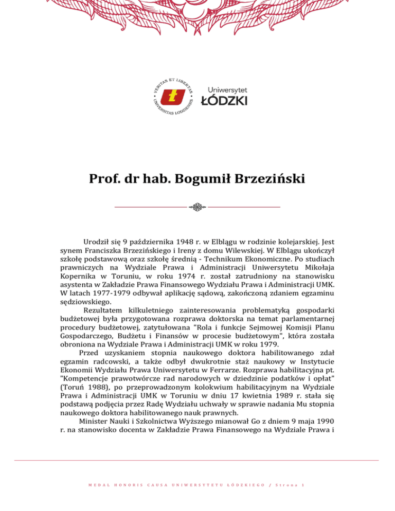 Prof. dr hab. Bogumił Brzeziński Urodził się 9 października 1948 r. w Elblągu w rodzinie kolejarskiej. Jest synem Franciszka Brzezińskiego i Ireny z domu Wilewskiej. W Elblągu ukończył szkołę podstawową oraz szkołę średnią - Technikum Ekonomiczne. Po studiach prawniczych na Wydziale Prawa i Administracji Uniwersytetu Mikołaja Kopernika w Toruniu, w roku 1974 r. został zatrudniony na stanowisku asystenta w Zakładzie Prawa Finansowego Wydziału Prawa i Administracji UMK. W latach 1977-1979 odbywał aplikację sądową, zakończoną zdaniem egzaminu sędziowskiego. Rezultatem kilkuletniego zainteresowania problematyką gospodarki budżetowej była przygotowana rozprawa doktorska na temat parlamentarnej procedury budżetowej, zatytułowana "Rola i funkcje Sejmowej Komisji Planu Gospodarczego, Budżetu i Finansów w procesie budżetowym", która została obroniona na Wydziale Prawa i Administracji UMK w roku 1979. Przed uzyskaniem stopnia naukowego doktora habilitowanego zdał egzamin radcowski, a także odbył dwukrotnie staż naukowy w Instytucie Ekonomii Wydziału Prawa Uniwersytetu w Ferrarze. Rozprawa habilitacyjna pt. "Kompetencje prawotwórcze rad narodowych w dziedzinie podatków i opłat" (Toruń 1988), po przeprowadzonym kolokwium habilitacyjnym na Wydziale Prawa i Administracji UMK w Toruniu w dniu 17 kwietnia 1989 r. stała się podstawą podjęcia przez Radę Wydziału uchwały w sprawie nadania Mu stopnia naukowego doktora habilitowanego nauk prawnych. Minister Nauki i Szkolnictwa Wyższego mianował Go z dniem 9 maja 1990 r. na stanowisko docenta w Zakładzie Prawa Finansowego na Wydziale Prawa i M E D A L H O N O R I S C A U S A U N I W E R S Y T E T U Ł Ó D Z K I E G O / S t r o n a 1 M E D A L H O N O R I S C A U S A U N I W E R S Y T E T U Ł Ó D Z K I E G O Administracji UMK. Niedługo potem, z dniem 29 listopada 1990 r. został mianowany przez Rektora UMK na stanowisko profesora nadzwyczajnego. W roku 1997 otrzymał tytuł naukowy profesora, a w 1998 r. został mianowany na stanowisko profesora zwyczajnego na Uniwersytecie Mikołaja Kopernika. Zainteresowania naukowe Bogumiła Brzezińskiego koncentrują się obecnie bez reszty na problematyce prawa podatkowego, a zwłaszcza zasad jego stosowania oraz wykładni. Jego dorobek naukowy sięga 500 opracowań. Mieści się w nim kilkadziesiąt monografii (autorstwo i współautorstwo), podobna liczba komentarzy do ustaw, około 100 artykułów oraz 150 glos do wyroków sądów w sprawach podatkowych. Dla potrzeb prowadzonych zajęć dydaktycznych napisał samodzielnie, bądź we współautorstwie kilkanaście podręczników oraz skryptów uniwersyteckich. Od szeregu lat prowadzi także seminaria doktoranckie w zakresie prawa podatkowego na Uniwersytecie Mikołaja Kopernika i Uniwersytecie Jagiellońskim. Był promotorem 18 prac doktorskich, a także recenzentem w 31 przewodach doktorskich i 7 habilitacyjnych. W roku 1991 powierzono mu funkcję kierownika Katedry Prawa Finansów Publicznych na Wydziale Prawa i Administracji UMK. Funkcję tę pełni do dnia dzisiejszego. Na tymże Wydziale pełnił rozmaite funkcje organizacyjne, m.in. przez dwie kadencje - w latach 1990-1996 - funkcję prodziekana Wydziału. Niezależnie od pracy na Wydziale Prawa i Administracji UMK, prowadził też działalność naukową i dydaktyczną na innych polskich uniwersytetach. Od roku 1994 jest profesorem kontraktowym Uniwersytetu Jagiellońskiego, gdzie pełni obecnie funkcję kierownika Zakładu Prawa Finansowego. W latach 1997-2005 był także – z krótkimi przerwami - profesorem kontraktowym Uniwersytetu Łódzkiego. Ma stałe kontakty naukowe z Centrum Dokumentacji i Studiów Podatkowych Uniwersytetu Łódzkiego oraz z Międzynarodowym Biurem Dokumentacji Podatkowej w Amsterdamie. W latach osiemdziesiątych XX w. kierował Podyplomowym Studium Administracji. Był też autorem koncepcji, a następnie organizatorem Podyplomowego Studium Prawa Podatkowego na Wydziale Prawa i Administracji Uniwersytetu Mikołaja Kopernika. Natomiast w 1996 r. zorganizował na tej uczelni Podyplomowe Studium Skarbowości, którym kierował przez kilka lat. Współpracował wiele lat z samorządem radców prawnych, prowadząc szkolenia dla aplikantów radcowskich z zakresu prawa podatkowego oraz wykłady dla radców prawnych w ramach systemu doskonalenia zawodowego. Ma podobne kontakty z samorządem doradców podatkowych, przez który został uhonorowany odznaką Za Szczególne Zasługi dla Krajowej Rady Doradców M E D A L H O N O R I S C A U S A U N I W E R S Y T E T U Ł Ó D Z K I E G O / S t r o n a 2 M E D A L H O N O R I S C A U S A U N I W E R S Y T E T U Ł Ó D Z K I E G O Podatkowych. Prowadzi też zajęcia szkoleniowe i bierze udział w konferencjach szkoleniowych dla pracowników aparatu skarbowego, firm audytorskich itp. Jest zaangażowany w działalność wydawniczą o charakterze naukowym. Rozpoczął w 1992 r. wydawanie czasopisma (kwartalnika, a obecnie dwumiesięcznika) Przegląd Orzecznictwa Podatkowego, gdzie pełni funkcję przewodniczącego Komitetu Redakcyjnego oraz przewodniczącego Rady Programowej. Jest także redaktorem naczelnym Kwartalnika Prawa Podatkowego, założycielem i przewodniczącym Rady Programowej eczasopisma Toruński Rocznik Podatkowy oraz członkiem Rady Programowej miesięcznika Monitor Podatkowy i miesięcznika Prawo i Podatki. Był redaktorem, bądź członkiem komitetów redakcyjnych szeregu opracowań książkowych. Jest członkiem Miedzynarodowego Stowarzyszenia Podatkowego (International Fiscal Association) oraz Europejskiego Stowarzyszenia Profesorów Prawa Podatkowego (European Association of Tax Law Professors), a także Towarzystwa Naukowego w Toruniu. Jest członkiem Rady Programowej Centrum Dokumentacji i Studiów Podatkowych oraz Rady Fundacji tegoż Centrum, a także członkiem Centrum Informacji i Organizacji Badań Finansów Publicznych i Prawa Podatkowego Krajów Europy Środkowej