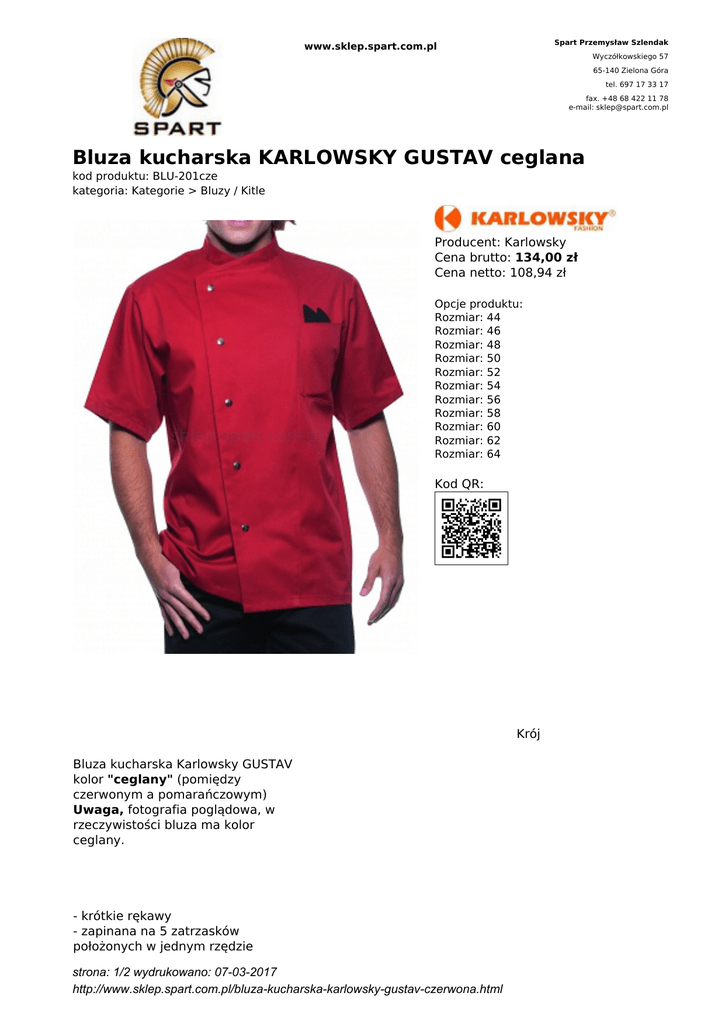 Spart Przemysław Szlendak www.sklep.spart.com.pl Wyczółkowskiego 57 65-140 Zielona Góra tel. 697 17 33 17 fax. +48 68 422 11 78 e-mail: [email protected] Bluza kucharska KARLOWSKY GUSTAV ceglana kod produktu: BLU-201cze kategoria: Kategorie > Bluzy / Kitle Producent: Karlowsky Cena brutto: 134,00 zł Cena netto: 108,94 zł Opcje produktu: Rozmiar: 44 Rozmiar: 46 Rozmiar: 48 Rozmiar: 50 Rozmiar: 52 Rozmiar: 54 Rozmiar: 56 Rozmiar: 58 Rozmiar: 60 Rozmiar: 62 Rozmiar: 64 Kod QR: Krój Bluza kucharska Karlowsky GUSTAV kolor "ceglany" (pomiędzy czerwonym a pomarańczowym) Uwaga, fotografia poglądowa, w rzeczywistości bluza ma kolor ceglany. - krótkie rękawy - zapinana na 5 zatrzasków położonych w jednym rzędzie strona: 1/2 wydrukowano: 07-03-2017 http://www.sklep.spart.com.pl/bluza-kucharska-karlowsky-gustav-czerwona.html - ukośna kieszeń na lewej piersi - klasyczny kołnierzyk - materiał uszlachetniony, łatwy w prasowaniu i wykurczony, specjalnie wybarwiony przez co nie traci koloru po praniu. dostepne kolory: bialy, niebieski, grafitowy, kremowy, brązowy, czerwony, zieony (oliwkowy) Skład materiału: Właściwości materiału: Użytkowanie: Dobierz szybko swój rozmiar: Ile cm masz w klatce piersiowe M L XL Rozmiar S EU Rozmiaró 44 46 48 wka "niemieck a" Obwód w 88 cm 92 cm 96 cm klatce piersiowe j Jeśli chcesz dopasować Rzeczywiste bluzę do swojej wymiary dotychczasowej odzieży bluzy 44 zmierz ją i porównaj z 46 rzeczywistymi 48 wymiarami w tabeli po 50 prawej. tolerancja = +/- 1cm 52 54 56 58 60 62 50 52 54 56 58 100 cm 104 cm 108 cm 112 cm 116 cm 49 51 53 55 58 60 63 65 67 68 strona: 2/2 wydrukowano: 07-03-2017 http://www.sklep.spart.com.pl/bluza-kucharska-karlowsky-gustav-czerwona.html 83 83 83 84 84 85 85 85 85 85 12