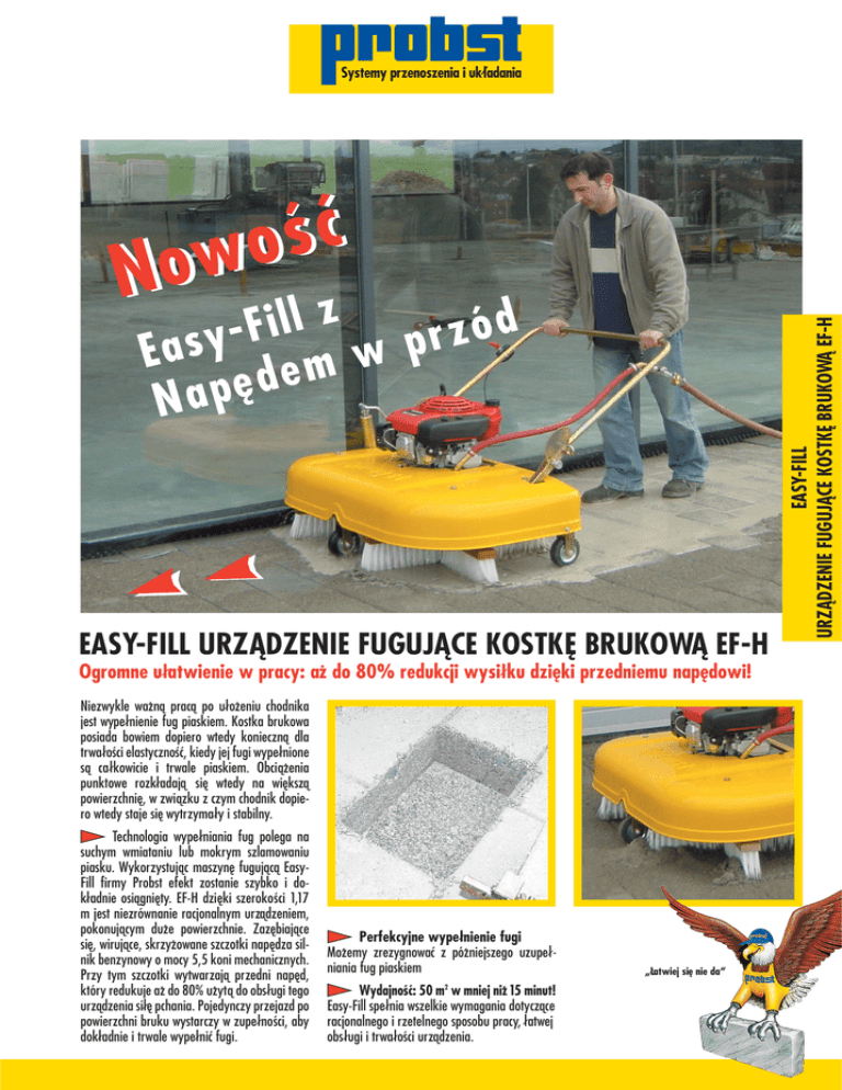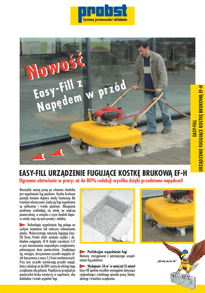 Systemy przenoszenia i ukl/adania z l l d i ó F z r y p Eas w m e d ˛ e Nap EASY-FILL URZADZENIE ˛ FUGUJACE ˛ KOSTK˛E BRUKOWA˛ EF-H Ogromne u latwienie w pracy: aż do 80% redukcji wysi l ku dzi˛eki przedniemu nap˛edowi! / / Niezwykle ważna˛ praca˛ po ul ożeniu chodnika jest wypel nienie fug piaskiem. Kostka brukowa posiada bowiem dopiero wtedy konieczna˛ dla trwal ości elastyczność, kiedy jej fugi wypel nione sa˛ cal kowicie i trwale piaskiem. Obcia˛żenia punktowe rozkl adaja˛ sie˛ wtedy na wi˛eksza˛ powierzchni˛e, w zwiazku ˛ z czym chodnik dopiero wtedy staje si˛e wytrzymal y i stabilny. / / / / / / / Technologia wypel niania fug polega na suchym wmiataniu lub mokrym szlamowaniu piasku. Wykorzystujac˛ maszyn˛e fugujac˛ a˛ EasyFill firmy Probst efekt zostanie szybko i dokl adnie osiagni˛ ˛ ety. EF-H dzie˛ki szerokości 1,17 m jest niezrównanie racjonalnym urzadzeniem, ˛ pokonujacym ˛ duże powierzchnie. Zaz˛ebiajace ˛ si˛e, wirujace, ˛ skrzyżowane szczotki nape˛dza silnik benzynowy o mocy 5,5 koni mechanicznych. Przy tym szczotki wytwarzaja˛ przedni nap˛ed, który redukuje aż do 80% użyta˛ do obsl ugi tego urzadzenia ˛ sile˛ pchania. Pojedynczy przejazd po powierzchni bruku wystarczy w zupel ności, aby dokl adnie i trwale wypel nić fugi. / / / / / / / Perfekcyjne wypelnienie fugi Możemy zrezygnować z póżniejszego uzupel niania fug piaskiem / /- Wydajność: 50 m2 w mniej niż 15 minut! Easy-Fill spel nia wszelkie wymagania dotyczace ˛ racjonalnego i rzetelnego sposobu pracy, l atwej obsl ugi i trwal ości urzadzenia. ˛ / / / / „Latwiej si˛e nie da“ / EASY-FILL URZADZENIE ˛ FUGUJACE ˛ KOSTK˛E BRUKOWA˛ EF-H ć ś o w o N : e n i l n o e j c Informa b s t - g m b h . d e Systemy przenoszenia i ukl/adania w w w. p r o Porównajcie Państwo: Nie znajda˛ Państwo nic lepszego nad Easy-Fill – nawet pod inna˛ nazwa˛ Wytrzymaly i latwy w obsludze Woda do dziela, ale z wyczuciem! Racjonalnie i skutecznie Aby podczas szlamowania osiagn ˛ a㞠t˛e sama˛ pr˛edkość wypel niania fug jak podczas dzial ania suchym piaskiem, należy stworzyć optymalna˛ konsystencj˛e mieszanki wody z piaskiem poprzez dobrze zdozowana˛ ilość wody. Sl uży temu wbudowany w EF-H firmy Probst seryjny kran wody. Dzi˛eki niemu dopl yw wody można dozować w zależności od potrzeby. Dzi˛eki innowacyjnemu Easy-Fill piaskowanie fug można przeprowadzić sprawnie, latwo i bez wysilku. / / / / / / / / / / Easy-Fill jest produktem solidnej konstrukcji nastawionym na niezawodne dzial anie, trwal ość i racjonalna˛, wydajna˛ obsl ug˛e. Nap˛ed przedni zmniejsza wysil ek potrzebny do pchania urzadzenia ˛ aż do 80%. Raczk˛ ˛ e można szybko przestawić dostosowujac˛ jej wysokość do ˛ urzadzenie. ˛ Obudowa z wzrostu obsl ugujacego przodu jest zaokraglona ˛ w celu umożliwienia dotarcia do trudno dost˛epnych powierzchni chodnika. / / / / ch, aczenia przy zl io n . d p e it r ch Bezpoś e˛żnika h, kraw ścianac / / ➔ Dzie˛ki patentowi trzpienia można w l atwy sposób stopniowo ustawić idealna˛ wysokość szczotek, co znaczaco ˛ minimalizuje ich zużycie. / Kurek ten ma jeszcze inna˛ zalet˛e: dopl yw wody można zamkna㞠bezpośrednio przy maszynie. Podczas przerw w pracy czy też innych postojach pracownik nie musi każdorazowo biec do „żródl a”, aby zakr˛ecić kran. Oszcz˛edza to czas pracy i uniemożliwia ucia˛żliwe zalania woda.˛ / / Pojedyncze szczotki posiadaja˛ rezerw˛e ścieralności do 50 mm. Oznacza to dluga˛ trwalość szczotek i dzi˛eki temu także obniżenie kosztów eksploatacji urzadzenia. ˛ / / Ochrona przed przecia˛żeniem zaoszcz˛edza klopotów / Nie zawsze można unikna㞠zblokowania przez obce cial o – np. kamień – ruchu szczotek. W celu unikni˛ecia uszkodzeń szczotek i ich mechanizmu nap˛edowego, EF-H dysponuje seryjna˛ ochrona˛ przed przecia˛żeniem. Wielokrotne korzystanie W mgnieniu oka można wymienić specjalne szczotki EF-H na szczotki stalowe. Dzi˛eki temu usuwa si˛e skutecznie mech i brud ze starszych powierzchni brukowych. Szczotkowanie szczotkowaniu nie równe przed wypel nianiem fug należy najpierw rozprowadzić z grubsza piasek na powierzchni bruku. Jeśli piasek rozprowadzimy zbyt niedokl adnie wówczas nie wszystkie szczotki od razu zadzial aja˛ poprawnie. Ale nie szczotki EFH. Probst poświ˛ecil wiele uwagi zachowaniu optymalnych proporcji mi˛edzy twardościa˛, elastycznościa˛ i wytrzymal ościa˛ w doborze szczotek. / / / / / Wykorzystanie szczególnej techniki użycia szczotek ma dla użytkownika szczególne znaczenie: Szczotki nie traca˛ nigdy kontaktu z powierzchnia˛ chodni˛ a˛ znakomita˛ skuteczność ka, co gwarantuje ciagl szczotkowania. / Dalszych informacji oraz prospekty otrzymaja˛ Pa ństwo u naszego kompetentnego przedstawiciela lub bezpośrednio u nas. Wyposażenie: silnik benzynowy Honda GXV 160 · 4 kW (5,5 PS) przy 3600 obrotów/min. Zasi˛eg szczotek: 1,170 mm Wysokość podczas pracy max.1.050 mm · Gle˛bokość 800 mm · Waga 89 kg Skl adana raczka ˛ ul atwiajaca ˛ transport (dl x szer x wys) 800 x 1,170 x 635 mm / / / / Probst Greiftechnik · Verlegesysteme GmbH • Gottlieb-Daimler-Str. 6 • D-71729 Erdmannhausen • Tel. (+49) 07144-3309-0 • Fax (+49) 07144-3309-50 eMail: [email protected] • Internet: www.probst-gmbh.de Technische Änderungen, die dem Fortschritt dienen, vorbehalten. 2902.0293/10604 polnisch /