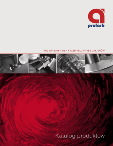ROZWIĄZANIA DLA PRZEMYSŁU FARB I LAKIERÓW Katalog produktów Firma PROFARB dostarcza maszyny, urządzenia i aparaturę stosowane w przemyśle chemicznym, a w szczególności w branży farb i lakierów od ponad 20 lat. Opracowujemy projekty techniczne, zapewniamy wykonawstwo i montaż zarówno kompletnych instalacji dla realizacji procesów i operacji chemicznych, jak i indywidualnych maszyn i urządzeń z uwzględnieniem systemów kontroli, sterowania i automatyzacji. Nasze rozwiązania „pod klucz” oferowane są dla Klientów na całym świecie. PROFARB specjalizuje się w następujących dziedzinach: • operacje i procesy produkcyjne farb i lakierów oraz innych materiałów z grupy pokryć, • magazynowanie surowców ciekłych i stałych, a także załadunek i rozładunek oraz transport surowców sypkich, • systemy dozowania grawimetrycznego i wolumetrycznego surowców, wyrobów i past pigmentowych, • mieszanie surowców ciekłych i dyspersji, • dyspergowanie i mokre mielenie materiałów, • synteza żywic organicznych, • ogrzewanie wysokotemperaturowymi nośnikami ciepła. PROFARB jest dostawcą pełnego zakresu wyposażenia do produkcji farb i lakierów oraz innych pokryć. Współpracujemy ze wszystkimi wiodącymi producentami farb i lakierów na świecie. Z dumą przedstawiamy Państwu nasz katalog produktów standardowych. 2 Spis treści I. Disolwery Disolwery laboratoryjne PLD Disolwery przyścienne PWD Disolwery kadziowe PMD Disolwery kadziowe specjalne PMD-DISPERMIX, PMD-BUTTERFLY Disolwery wielokadziowe PMM Disolwery stacjonarne PVD Disolwery trój-wałowe PVT 4 6 8 10 12 14 16 18 II. Mieszalniki Mieszadła przyczepne do kadzi, beczek i kontenerów PCM Mieszadła kadziowe PVM Mieszalniki stacjonarne PSM 20 22 24 26 III. Młyny Młyny z koszem obrotowym PRB Młyny poziome PS 28 30 32 IV. Stacje dozujące Stacje dozujące PDS 34 36 V. Instalacje do syntezy żywic Reaktory PRR 38 40 VI. Urządzenia dodatkowe Filtry powietrza PDC Prasy hydrauliczne / wywrotnice do kadzi PHP / PTU Zespoły pompująco-filtrujące / filtry cieczy PPF/PGF Kadzie PMV 42 44 46 48 50 3 Disolwery • Disolwery laboratoryjne PLD • Disolwery przyścienne PWD • Disolwery kadziowe PMD - Disolwery kadziowe specjalne PMD-DISPERMIX, PMD-BUTTERFLY • Disolwery wielokadziowe PMM • Disolwery stacjonarne PVD • Disolwery trój-wałowe PVT Disolwery laboratoryjne Disolwer PLD jest nowoczesnym urządzeniem umożliwiającym prowadzenie wszechstronnych badań procesu dyspergowania. Konstrukcja i rozwiązania techniczne disolwera PLD czerpią z najlepszych doświadczeń naszej firmy, będąc jednocześnie odzwierciedleniem potrzeb Klientów. PLD OPIS DZIAŁANIA: ZASTOSOWANIE: Disolwer stanowi zwarty, kompaktowy układ mechaniczny. Disolwer laboratoryjno - badawczy może być wykorzystywany do badania procesów dyspergowania w produkcji: • farb i lakierów, • emalii, • pigmentów, • barwników, • klejów i spoiw, • tynków i szpachli, • produktów mikrobiologicznych, • kosmetyków, • emulsji fotograficznych, • leków wymagających dyspersji, • czekolady, • dyspersyjnych powłok papierniczych, • powłok magnetycznych nośników pamięci, • dodatków do smarów, • wosków. Urządzenie zbudowane jest na stabilnej podstawie, pozwalającej na ustawienie maszyny bezpośrednio na podłodze, na stole laboratoryjnym, bądź odpowiednim postumencie. Disolwer posiada ramiona zaciskowe, służące do mocowania zbiorników roboczych o zróżnicowanych rozmiarach. Konstrukcja wału mieszadła umożliwia stosowanie wymiennych tarcz i mieszadeł o różnych średnicach i kształtach. Disolwer posiada wymagane zabezpieczenia, pozwalające na jego bezpieczne użytkowanie. Silnik disolwera sterowany jest poprzez komputer PC, z wykorzystaniem nowoczesnej przetwornicy częstotliwości i programu sterująco-archiwizującego PROFARB DISOLWER. Urządzenie kompaktowe. Doskonałe odwzorowanie rzeczywist ych warunków przemysłowych. 6 DANE TECHNICZNE: model moc silnika (kW) pojemność robocza kadzi (litry) prędkość obrotowa tarczy (obr/min) średnica tarczy disolwera (mm) dług. x szer. x wys. (mm) waga zespołu (kg) PLD-3F 3 1÷10 0÷5600 75 1300x610x1330 125 PLD-9F 9 2÷10 0÷12000 100 1300x610x1330 130 OPCJE: • pokrywa próżniowa PLD/VL, • agregat próżniowy PLD/VA, • wymienne kadzie (1...10 l.), • kadzie z płaszczami chłodzącymi/grzejnymi, • kadzie próżniowe, • pokrywy ze stali nierdzewnej i tworzywa sztucznego, • wymienne tarcze i mieszadła, • oprogramowanie PROFARB DISSOLVER SOFTWARE - kompleksowy system komputerowego magazynowania i analizy danych o procesie dyspergowania (dane fizyczne, chemiczne i o procesie - prędkość mieszadła, energia przekazywana do medium, czas pracy …), a także programowanie czasu pracy w zależności od prędkości obrotowej mieszadła i energii przekazywanej do medium, • nieruchomy skrobak do wyrobów charakteryzujących się wysoką lepkością, • certyfikaty CE oraz ROSSTEST. Disolwer przyścienny Disolwer przyścienny typ PWD to niewielkie przemysłowe urządzenie służące do dyspergowania cząstek ciała stałego w cieczy. Proces dyspergacji prowadzony jest w przejezdnych kadziach. Elektroniczna bezstopniowa regulacja prędkości obrotowej wału umożliwia szeroki zakres zastosowań urządzenia. PWD OPIS DZIAŁANIA: ZASTOSOWANIE: Zespół roboczy disolwera umocowany jest przesuwnie na dwóch kolumnach, które umieszczono na stojaku opartym na posadzce i przymocowanym do ściany. Dostępna jest także wersja urządzenia wolnostojąca. Zespół roboczy jest unoszony do góry i opuszczany w dół za pomocą siłownika hydraulicznego lub pneumatycznego . Mieszadła dyspergujące przyścienne mogą być wykorzystywane w produkcji: • farb i lakierów, • emalii, • klejów, spoiw i wosków, • dodatków do smarów, • środków ochrony roślin, • środków grzybobójczych, • produktów mikrobiologicznych, • 