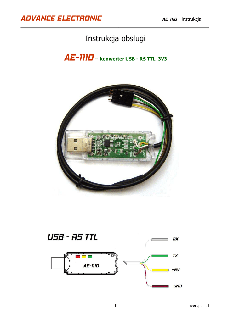 ADVANCE ELECTRONIC AE-1110 - instrukcja ___________________________________________________________________________ Instrukcja obsługi AE-1110 – konwerter USB - RS TTL 3V3 1 wersja 1.1 ADVANCE ELECTRONIC AE-1110 - instrukcja ___________________________________________________________________________ Opis i właściwości produktu. Moduł konwertera jest standardowym konwerterem magistrali USB na standard RS 232TTL. O poziomie logicznym 3V3 z tolerancją logiki 5V. Zbudowany jest w oparciu o specjalizowany układ scalony FT230 firmy FTDI. Transmisja danych odbywa się w trybie full-duplex, od strony komputera konwerter widziany jest i obsługiwany jako typowy port szeregowy. Moduł posiada trzy diody sygnalizacyjne LED ( rys.) - czerwona – wskazuje zasilanie modułu - żółta – wskazuje transmisję TX - miga w momencie nadawania. - zielona – wskazuje transmisję RX - miga w momencie odbioru. podczas poprawnej pracy modułu LED zielona i żółta migają potwierdzając przesyłanie pakietów danych. LED czerwona wskazuje poprawne zasilanie. opis wyprowadzeń : - brązowy - masa Gnd - żółty - +5V max 500mA - zielony - sygnał TX - biały - sygnał RX - długość przewodu około 40cm Do obsługi konwertera wymagane są sterowniki, można pobrać je ze strony producenta http://www.ftdichip.com lub z naszej strony www.advanceelectronic.pl z działu oprogramowania. Konwerter współpracuje z: Windows 7 32,64-bit Windows Vista and Vista 64-bit Windows XP and XP 64-bit Server 2003, XP and Server 2008 Windows XP Embedded Windows CE 4.2, 5.0 and 6.0 Mac OS-X Linux 3.2 and greater Android Po pobraniu sterowników należy je rozpakować i zainstalować. Instalacja przebiega samoczynnie. Po podłączeniu konwertera do portu USB system sam nada mu kolejny wolny numer wirtualnego portu RS, oraz dokona instalacji sterowników. Każde następne podłączenie konwertera jest wykrywane i konfigurowane automatycznie. Firma Advance Electronic udziela 12 miesięcznej gwarancji na konwerter typ AE-1110. Gwarancja nie pokrywa uszkodzeń powstałych z powodu niewłaściwego użytkowania, zużycia lub nieautoryzowanych zmian. Jeżeli produkt nie działa zgodnie z instrukcją, będzie naprawiony lub wymieniony w ciągu 14 dni roboczych na pełnosprawny pod warunkiem dostarczenia urządzenia do firmy Advance Electronic z opłaconym transportem i ubezpieczeniem. Dziękujemy Państwu za wybór i zakup naszego produktu. Advance Electronic – Krzysztof Greniuk ul. Kaprysowa 5/57 20-843 Lublin, POLSKA Tel : +48 81 47-98-523 kom: 515-141-783 www...............: www.advanceelectronic.pl e-mail ......... : [email protected] 2 wersja 1.1