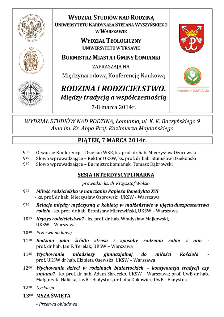 WYDZIAŁ STUDIÓW NAD RODZINĄ UNIWERSYTETU KARDYNAŁA STEFANA WYSZYŃSKIEGO W WARSZAWIE WYDZIAŁ TEOLOGICZNY UNIWERSYTETU W TRNAVIE BURMISTRZ MIASTA I GMINY ŁOMIANKI ZAPRASZAJĄ NA Międzynarodową Konferencję Naukową RODZINA i RODZICIELSTWO. Między tradycją a współczesnością 7-8 marca 2014r. WYDZIAŁ STUDIÓW NAD RODZINĄ, Łomianki, ul. K. K. Baczyńskiego 9 Aula im. Ks. Abpa Prof. Kazimierza Majdańskiego PIĄTEK, 7 MARCA 2014r. 900 910 920 Otwarcie Konferencji – Dziekan WSR, ks. prof. dr hab. Mieczysław Ozorowski Słowo wprowadzające – Rektor UKSW, ks. prof. dr hab. Stanisław Dziekoński Słowo wprowadzające – Burmistrz Łomianek, Tomasz Dąbrowski SESJA INTERDYSCYPLINARNA prowadzi: ks. dr Krzysztof Wolski 925 950 Miłość rodzicielska w nauczaniu Papieża Benedykta XVI - ks. prof. dr hab. Mieczysław Ozorowski, UKSW - Warszawa Relacje między mężczyzną a kobietą w małżeństwie w ujęciu duszpasterstwa rodzin - ks. prof. dr hab. Bronisław Mierzwiński, UKSW – Warszawa 1015 Kryzys rodzicielstwa? - ks. prof. dr hab. Władysław Majkowski, UKSW – Warszawa 1040 Przerwa na kawę 1110 Rodzina jako źródło stresu i sposoby prof. dr hab. Jan F. Terelak, UKSW – Warszawa radzenia sobie 1135 Wychowanie młodzieży gimnazjalnej do miłości prof. UKSW dr hab. Elżbieta Osewska, UKSW – Warszawa z nim Kościoła - 1200 Wychowanie dzieci w rodzinach białostockich – kontynuacja tradycji czy zmiana? - ks. prof. dr hab. Adam Skreczko, UKSW – Warszawa; prof. UwB dr hab. Małgorzata Halicka, UwB - Białystok, dr Lidia Dakowicz, UwB - Białystok 1230 Dyskusja 1300 MSZA ŚWIĘTA - Przerwa obiadowa POPOŁUDNIOWE SESJE PANELOWE PANEL TEOLOGICZNO - MORALNY prowadzi: ks. prof. dr hab. Mieczysław Ozorowski SALA BŁ. JANA PAWŁA II 1500 Początek i wzór ludzkiego rodzicielstwa - ks. dr Krzysztof Wolski, UKSW - Warszawa 1515 Macierzyństwo w hagiografii staropolskiej - dr hab. Bernadetta PuchalskaDąbrowska, UwB - Białystok 1530 Rodzicielstwo wzajemnym obdarzaniem człowieczeństwem a wyzwania współczesności - ks. dr Mirosław Brzeziński, KUL - Lublin 1545 Przerwa na kawę 1600 NaProTECHNOLOGY – budowaniem kultury miłości i życia – dr Bożena Bassa, UKSW – Warszawa 1615 Pastorácia rodín v Slovenskom kontexte – dr Jozef Žuffa, PhD, UT - Trnava Bratysława 1630 Teologiczny obraz ojcostwa w nauczaniu Ks. Kard. Stefana Wyszyńskiego ks. dr Zdzisław Struzik, USKW - Warszawa 1645 Dyskusja PANEL PSYCHOLOGICZNO - PEDAGOGICZNY prowadzi: prof. UKSW dr hab. Elżbieta Osewska SALA ŚW. MAKSYMILIANA 1500 Struktura rodziny a proces wychowania - ks. dr Grzegorz Pyźlak, KUL - Lublin 1515 Kryzys macierzyństwa i ojcostwa w dobie współczesności - ks. dr Władysław Kądziołka, UJPII – Kraków 1530 Wychowanie do życia w rodzinie wobec wyzwań współczesności w oparciu o program "Życie i Miłość" - mgr Wanda E. Papis 1545 Przerwa na kawę 1600 Vybrané teórie osobnosti z pohľadu filozofickej antropológie - dr Martin Šarkan, PhD, UT - Trnava - Bratysława 1615 Wychowanie domowe - historia i współczesność - dr Andrzej Mazan, UKSW Warszawa 1630 Rozwój systemu pieczy zastępczej nad dzieckiem jako wyraz trudności w realizacji funkcji opiekuńczo-wychowawczej współczesnych rodzin – dr Agnieszka Regulska, UKSW - Warszawa 1645 Wpływ ojca na relacje dorosłe córki w aspekcie stylów przywiązaniowych - dr Maria Jankowska, APS - Warszawa 1700 Dyskusja PANEL SPOŁECZNO - SOCJOLOGICZNY prowadzi: ks. prof. dr hab. Władysław Majkowski SALA Bł. MĘCZENNIKÓW (obok Auli) 1500 Rozwód i kohabitacja - dualny świat nowoczesnej rodziny – ks. dr Józef Młyński UKSW – Warszawa 1515 Uwarunkowania realizacji potrzeb macierzyńskich we społeczeństwie polskim – dr Urszula Bejma, UKSW-Warszawa 1530 Nowe rodzicielstwo wobec współczesnych dr Katarzyna Zielińska-Król, KUL – Lublin zmian współczesnym społecznych – 1545 Interdyscyplinarne ujęcia rodziny w historii myśli socjologicznej - mgr Teresa Mazan, UKSW - Warszawa 1600 Przerwa na kawę 1615 Rodzicielstwo w realno-wirtualnej przestrzeni- wyzwania i zagrożenia współczesnej rodziny - dr Anna Andrzejewska- Cioch, KUL- Lublin 1630 Rodzina w ujęciu polityki prorodzinnej w Polsce - mgr Barbara Wierzbicka, UKSW - Warszawa 1645 Modele rodziny we współczesnej Brazylii - ks. dr Bogusław Kieżel, AWSD Białystok 1700 Historyczne i współczesne modele rodziny w USA - ks. lic. Marek Kasperczuk, SD – Chicago 1715 Dyskusja SOBOTA, 8 MARCA 2014r. 800 MSZA ŚWIĘTA SESJA INTERDYSCYPLINARNA prowadzi: ks. prof. dr hab. Adam Skreczko 900 Mariage dans la Bible et modernite (Małżeństwo w Biblii i współczesność) - prof. Jacques Bernard, Katolicki Uniwersytet w Lille – Francja 925 Ideologiczne uwarunkowania zmian wobec rodziny i w rodzinie - ks. prof. dr hab. Leon Dyczewski, KUL - Lublin 950 Gender jako wyzwanie dla antropologii katolickiej - ks. prof. dr hab. Ireneusz Mroczkowski, UKSW - Warszawa 1015 Nové ideológie ohrozujúce hodnoty rodiny a aktivity pápeža Františka, ako výzva pre súčasný svet - doc. ph. dr. Mária Šmidová, PhD, UT - Trnava Bratysława 1040 Przerwa na kawę 1110 Dlaczego w polskich rodzinach nie rodzą dzieci? - dr Paweł Wosicki, Polska Federacja Ruchów Obrony Życia oraz Fundacja „Głos dla Życia” 1135 Dlaczego zrezygnowałem z in vitro? - dr n. med. Jacek Szulc, Szpital Specjalistyczny św. Zofii w Warszawie 1200 Wezwanie do odpowiedzialnego rodzicielstwa jako wyraz troski Jana Pawła II o fizyczne i moralne zdrowie człowieka, małżeństwa, rodziny - prof. dr hab. Urszula Dudziak, KUL - Lublin 1225 Wskazania pastoralne dotyczące przygotowania do małżeństwa sakramentalnego w świetle badań narzeczonych - ks. prof. dr hab. Jacek Goleń, KUL - Lublin – Dyskusja – Przerwa obiadowa 1400 Walne Zebranie Polskiego Stowarzyszenia Familiologicznego (Sala Konferencyjna WSR) zawarcia
