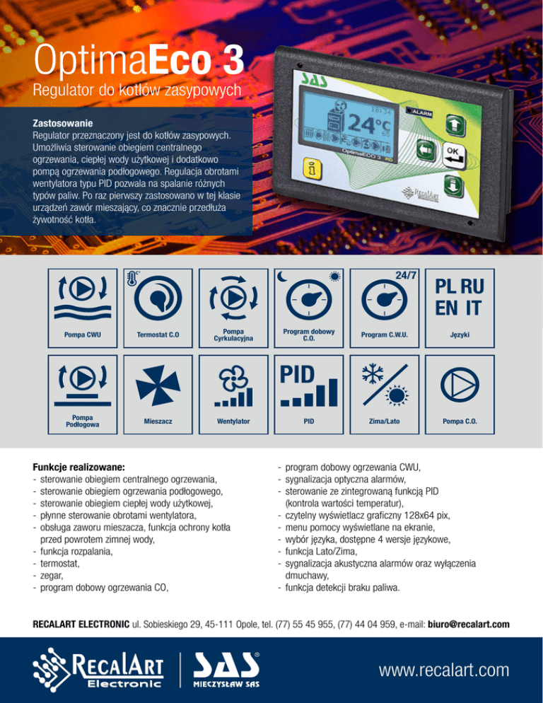 OptimaEco 3 Regulator do kotłów zasypowych Zastosowanie Regulator przeznaczony jest do kotłów zasypowych. Umożliwia sterowanie obiegiem centralnego ogrzewania, ciepłej wody użytkowej i dodatkowo pompą ogrzewania podłogowego. Regulacja obrotami wentylatora typu PID pozwala na spalanie różnych typów paliw. Po raz pierwszy zastosowano w tej klasie urządzeń zawór mieszający, co znacznie przedłuża żywotność kotła. 24/7 PL RU EN IT Pompa CWU Termostat C.O Pompa Cyrkulacyjna Program dobowy C.O. Program C.W.U. Języki Pompa Podłogowa Mieszacz Wentylator PID Zima/Lato Pompa C.O. Funkcje realizowane: - sterowanie obiegiem centralnego ogrzewania, - sterowanie obiegiem ogrzewania podłogowego, - sterowanie obiegiem ciepłej wody użytkowej, - płynne sterowanie obrotami wentylatora, - obsługa zaworu mieszacza, funkcja ochrony kotła przed powrotem zimnej wody, - funkcja rozpalania, -termostat, -zegar, - program dobowy ogrzewania CO, - program dobowy ogrzewania CWU, - sygnalizacja optyczna alarmów, - sterowanie ze zintegrowaną funkcją PID (kontrola wartości temperatur), - czytelny wyświetlacz graficzny 128x64 pix, - menu pomocy wyświetlane na ekranie, - wybór języka, dostępne 4 wersje językowe, - funkcja Lato/Zima, - sygnalizacja akustyczna alarmów oraz wyłączenia dmuchawy, - funkcja detekcji braku paliwa. RECALART ELECTRONIC ul. Sobieskiego 29, 45-111 Opole, tel. (77) 55 45 955, (77) 44 04 959, e-mail: [email protected] www.recalart.com OptimaEco 3 Regulator do kotłów zasypowych Oszczędności: Program dobowy (umożliwiający ustawienie czasowe obniżenie temperatury) Współpraca z każdym termostatem pokojowym o stykach zwiernych Tryb Lato (ogrzewanie tylko obiektu ciepłej wody) Znaczne wydłużenie czasu eksplotacji kotła - dodatkowa ochrona (sterowany zawór mieszający) Sterowanie PID Płynna regulacja nadmuchem, co znacznie poprawia spalanie paliwa Ekonomiczne spalanie różnych typów paliw: drewno, węgiel. Czujnik spalin w standardowym wyposażeniu - jeszcze lepsze sterowanie dmuchawą RECALART ELECTRONIC ul. Sobieskiego 29, 45-111 Opole, tel. (77) 55 45 955, (77) 44 04 959, e-mail: [email protected] Schemat hydrauliczny i dane techniczne TYP. OptimaEco3 ~230 V 1 3 2 4 RS485 producent: RECALART ELECTRONIC 45-111 Opole, ul.Sobieskiego 29 3,15 A B 1 A Maksymalna temperatura powierzchni montażowej Ts = 55oC zasilanie: 230VAC, 50Hz, max. 3,2 A WYJŚCIA : 6 x 1,2(0,6)A 230V~ Do kanalizacji 0 C.O. P2 P.d. P4 1 - brązowy (otwieranie) 2 - niebieski (N) 3 - czarny (zamykanie) PE - żółto-zielony M ZM Kc.P Pobór mocy sterownika przy odłączonych odbiornikach Dokładność pomiaru temperatur V230V/50HZ +/-10% <5 VA C.W.U. Kc.Z 2*C Temperatura otoczenia 0...50 Temperatura składowania 0...50 Stopień ochrony regulatora IP20,IP00 Wilgotność względna P3 11;12 Zasilanie P1 W 15-80 % bez kondensacji i pary wodnej minimalnie 32mm www.recalart.com