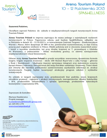 Szanowni Państwo, Chciałbym zaprosić Państwa do udziału w międzynarodowych targach turystycznych Arena Tourism Poland. Arena Tourism Poland to impreza aspirująca do miana jednego z największych wydarzeń turystycznych w Polsce. Tegoroczna edycja, pod hasłem Spa&Wellness, odbędzie się w Ostródzie w dniach 10 – 12.10.2013 r. w nowoczesnym Centrum Targowo – Konferencyjnym Warmii i Mazur, które dysponuje 20 000 m kw. powierzchni wystawienniczej, co daje trzecią pozycję pod względem wielkości w Polsce. Obiekt położony jest w otoczeniu mazurskich jezior i hoteli o wysokim standardzie, tuż przy drodze krajowej nr 7, prowadzącej z Gdańska do Warszawy, a jednocześnie - blisko wschodniej granicy, co ułatwia nawiązywanie międzynarodowych relacji biznesowych. Główne atuty Arena Tourism Poland to przede wszystkim: nowoczesna, dynamiczna formuła targów, bogate wsparcie branżowe - około 100 Hosted Buyer'sów z całej Europy – głównie z Rosji i Skandynawii – lokalizacja imprezy sprzyjająca integracji oraz malownicza sceneria łącząca biznes z rekreacją. Dwa pierwsze dni mają charakter zamknięty i branżowy. Trzeci dzień jest otwarty dla szerokiej publiczności zainteresowanej uzyskaniem informacji nt. atrakcji turystycznych. Targom będzie towarzyszył atrakcyjny program szkoleń i wykładów tematycznych. Do udziału w targach zapraszamy m.in. przedstawicieli biur podróży, miast, krajowych ośrodków promocji , regionów i atrakcji turystycznych, touroperatorów, obiekty hotelarskie i SPA, producentów infrastruktury i sprzętu sportowego, producentów naturalnych kosmetyków i wyposażenia SPA. Zapraszam do kontaktu Mariusz Stankiewicz Projekt manager [email protected] tel. 605 851 270 www.tourismpoland.pl