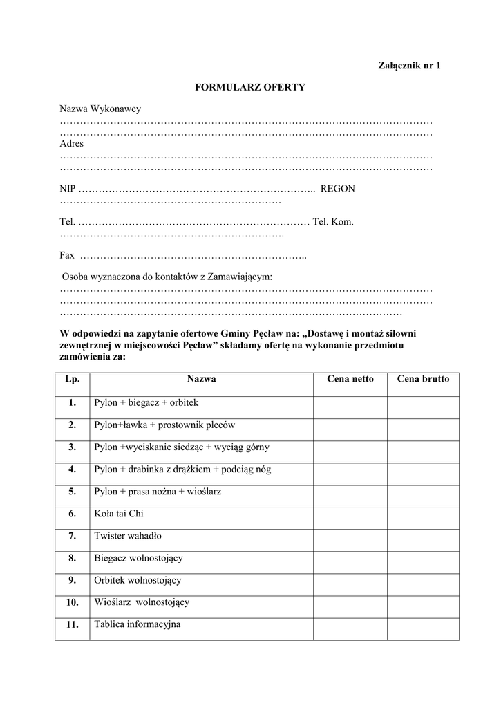 Załącznik nr 1 FORMULARZ OFERTY Nazwa Wykonawcy ………………………………………………………………………………………………… ………………………………………………………………………………………………… Adres ………………………………………………………………………………………………… ………………………………………………………………………………………………… NIP …………………………………………………………….. REGON ………………………………………………………… Tel. …………………………………………………………… Tel. Kom. …………………………………………………………. Fax ………………………………………………………….. Osoba wyznaczona do kontaktów z Zamawiającym: ………………………………………………………………………………………………… ………………………………………………………………………………………………… ………………………………………………………………………………………… W odpowiedzi na zapytanie ofertowe Gminy Pęcław na: „Dostawę i montaż siłowni zewnętrznej w miejscowości Pęcław” składamy ofertę na wykonanie przedmiotu zamówienia za: Lp. Nazwa 1. Pylon + biegacz + orbitek 2. Pylon+ławka + prostownik pleców 3. Pylon +wyciskanie siedząc + wyciąg górny 4. Pylon + drabinka z drążkiem + podciąg nóg 5. Pylon + prasa nożna + wioślarz 6. Koła tai Chi 7. Twister wahadło 8. Biegacz wolnostojący 9. Orbitek wolnostojący 10. Wioślarz wolnostojący 11. Tablica informacyjna Cena netto Cena brutto Cenę netto …………………………………………………………zł (słownie złotych) ………………………………………………………………………………………… ………………………………………………………………………………………… Podatek VAT ………………………………………………………zł (słownie złotych) ………………………………………………………………………………………… ………………………………………………………………………………………… Cenę brutto ……………………………………………………….zł (słownie złotych) ………………………………………………………………………………………… ………………………………………………………………………………………… Oświadczamy, że: - zapoznaliśmy się z opisem przedmiotu zamówienia i nie wnosimy do niego zastrzeżeń; - w przypadku udzielenia nam zamówienia zobowiązujemy się do zawarcia umowy w miejscu i terminie wskazanym przez Zamawiającego; - oświadczamy, że powyższa cena zawiera wszystkie koszty jakie ponosi Zamawiający w przypadku wyboru niniejszej oferty; - wyrażamy zgodę na warunki płatności określone w zapytaniu ofertowym; - oświadczamy, że oferujemy wykonanie w całości przedmiotu zamówienia w terminie do 17 lipca 2015r. - udzielimy 24 miesięcznej gwarancji na wykonanie przedmiotu zamówienia oraz zastosowane materiały. ……………………………………….. (podpis i pieczęć Wykonawcy) …………….............., dn. ……………………..2015 r.