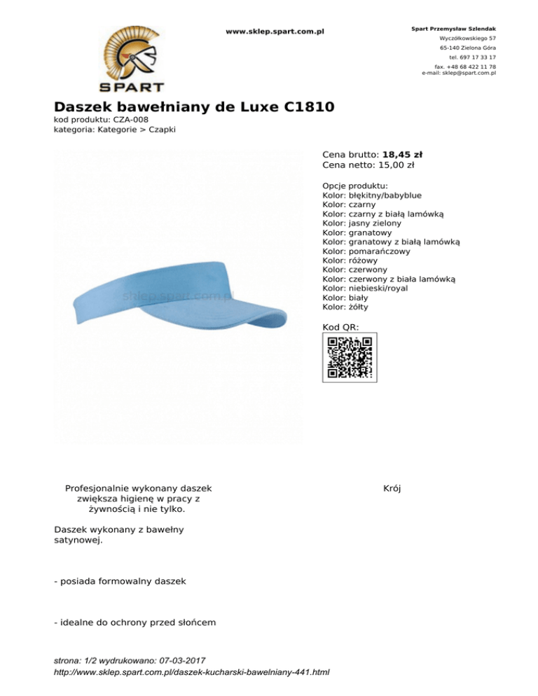 Spart Przemysław Szlendak www.sklep.spart.com.pl Wyczółkowskiego 57 65-140 Zielona Góra tel. 697 17 33 17 fax. +48 68 422 11 78 e-mail: [email protected] Daszek bawełniany de Luxe C1810 kod produktu: CZA-008 kategoria: Kategorie > Czapki Cena brutto: 18,45 zł Cena netto: 15,00 zł Opcje produktu: Kolor: błękitny/babyblue Kolor: czarny Kolor: czarny z białą lamówką Kolor: jasny zielony Kolor: granatowy Kolor: granatowy z białą lamówką Kolor: pomarańczowy Kolor: różowy Kolor: czerwony Kolor: czerwony z biała lamówką Kolor: niebieski/royal Kolor: biały Kolor: żółty Kod QR: Profesjonalnie wykonany daszek zwiększa higienę w pracy z żywnością i nie tylko. Daszek wykonany z bawełny satynowej. - posiada formowalny daszek - idealne do ochrony przed słońcem strona: 1/2 wydrukowano: 07-03-2017 http://www.sklep.spart.com.pl/daszek-kucharski-bawelniany-441.html Krój - zapięcie na rzep z tyłu głowy Właściwości materiału: 100% bawełna Rozmiar: strona: 2/2 wydrukowano: 07-03-2017 http://www.sklep.spart.com.pl/daszek-kucharski-bawelniany-441.html