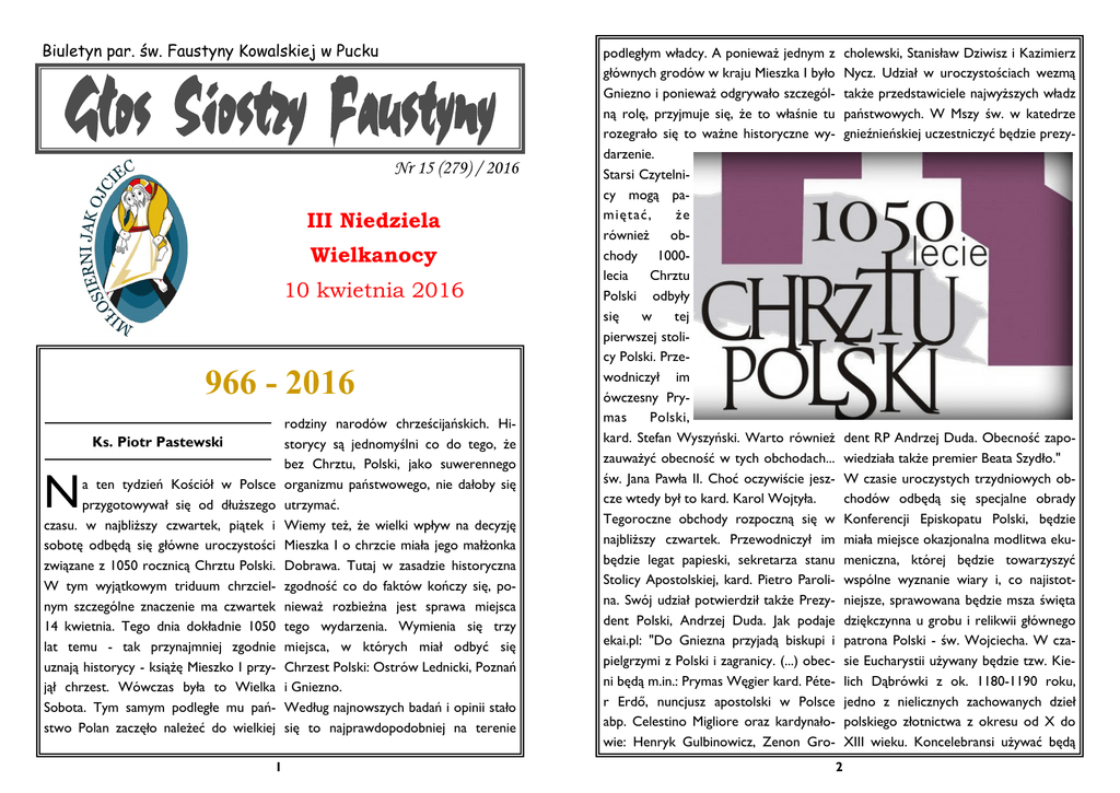 Biuletyn par. św. Faustyny Kowalskiej w Pucku Głos Siostry Faustyny Nr 15 (279) / 2016 III Niedziela Wielkanocy 10 kwietnia 2016 966 - 2016 Ks. Piotr Pastewski N a ten tydzień Kościół w Polsce przygotowywał się od dłuższego czasu. w najbliższy czwartek, piątek i sobotę odbędą się główne uroczystości związane z 1050 rocznicą Chrztu Polski. W tym wyjątkowym triduum chrzcielnym szczególne znaczenie ma czwartek 14 kwietnia. Tego dnia dokładnie 1050 lat temu - tak przynajmniej zgodnie uznają historycy - książę Mieszko I przyjął chrzest. Wówczas była to Wielka Sobota. Tym samym podległe mu państwo Polan zaczęło należeć do wielkiej 1 rodziny narodów chrześcijańskich. Historycy są jednomyślni co do tego, że bez Chrztu, Polski, jako suwerennego organizmu państwowego, nie dałoby się utrzymać. Wiemy też, że wielki wpływ na decyzję Mieszka I o chrzcie miała jego małżonka Dobrawa. Tutaj w zasadzie historyczna zgodność co do faktów kończy się, ponieważ rozbieżna jest sprawa miejsca tego wydarzenia. Wymienia się trzy miejsca, w których miał odbyć się Chrzest Polski: Ostrów Lednicki, Poznań i Gniezno. Według najnowszych badań i opinii stało się to najprawdopodobniej na terenie podległym władcy. A ponieważ jednym z głównych grodów w kraju Mieszka I było Gniezno i ponieważ odgrywało szczególną rolę, przyjmuje się, że to właśnie tu rozegrało się to ważne historyczne wydarzenie. Starsi Czytelnicy mogą pamiętać, że również obchody 1000lecia Chrztu Polski odbyły się w tej pierwszej stolicy Polski. Przewodniczył im ówczesny Prymas Polski, kard. Stefan Wyszyński. Warto również zauważyć obecność w tych obchodach... św. Jana Pawła II. Choć oczywiście jeszcze wtedy był to kard. Karol Wojtyła. Tegoroczne obchody rozpoczną się w najbliższy czwartek. Przewodniczył im będzie legat papieski, sekretarza stanu Stolicy Apostolskiej, kard. Pietro Parolina. Swój udział potwierdził także Prezydent Polski, Andrzej Duda. Jak podaje ekai.pl: "Do Gniezna przyjadą biskupi i pielgrzymi z Polski i zagranicy. (...) obecni będą m.in.: Prymas Węgier kard. Péter Erdő, nuncjusz apostolski w Polsce abp. Celestino Migliore oraz kardynałowie: Henryk Gulbinowicz, Zenon Gro- cholewski, Stanisław Dziwisz i Kazimierz Nycz. Udział w uroczystościach wezmą także przedstawiciele najwyższych władz państwowych. W Mszy św. w katedrze gnieźnieńskiej uczestniczyć będzie prezy- dent RP Andrzej Duda. Obecność zapowiedziała także premier Beata Szydło." W czasie uroczystych trzydniowych obchodów odbędą się specjalne obrady Konferencji Episkopatu Polski, będzie miała miejsce okazjonalna modlitwa ekumeniczna, której będzie towarzyszyć wspólne wyznanie wiary i, co najistotniejsze, sprawowana będzie msza święta dziękczynna u grobu i relikwii głównego patrona Polski - św. Wojciecha. W czasie Eucharystii używany będzie tzw. Kielich Dąbrówki z ok. 1180-1190 roku, jedno z nielicznych zachowanych dzieł polskiego złotnictwa z okresu od X do XIII wieku. Koncelebransi używać będą 2 specjalnie na tę uroczystość uszytych białych ornatów zaprojektowanych przez siostry karmelitanki bose z Gniezna. Msza św. będzie sprawowana częściowo po łacinie. W czasie liturgii Prymas Polski złoży białe róże na płycie upamiętniającej domniemany pochówek Dobrawy – Matki Chrzestnej Polski. Płyta znajduje się w posadzce prezbiterium, przed konfesją św. Wojciecha. Ważnym momentem dziękczynnej modlitwy będzie także odnowienie przyrzeczeń chrzcielnych. Można też będzie obejrzeć premierę filmu o Mieszku I i Chrzcie Polski. Rocznica obchodzona będzie nie tylko przez Kościół, ale także stronę Państwową. Odbędzie się specjalne posiedzenie Zgromadzenia Narodowego oraz okolicznościowe orędzie do rodaków wygłosi Prezydent Polski. I my, jako wspólnota Przystani Miłosierdzia, chcemy także włączyć się w te uroczyste obchody. Stąd też w niedzielę 17 kwietnia podczas każdej mszy świętej będzie miało miejsce uroczyste odnowienie przyrzeczeń chrzcielnych. Pismo Święte w życiu chrześcijanina - refleksje na Tydzień Biblijny „ nym, teologicznym, aksjologicznym. Jednak niezaprzeczalnie największe znaczenie Pismo Święte ma dla nas wierzących. Nasz Wielki Rodak Jan Paweł II nauczał „ Pismo Święte jest jak orzeźwiająca woda i jak pożywienie, którym karmi się człowiek wierzący”. Dla nas wierzących jest księgą świętą, zawierającą słowa Boga, spisane przez Jego uczniów pod natchnieniem Ducha Świętego. W tym kontekście Pismo Święte jest zbiorem prawd objawionych i przykazań. To skarbnica wartości i wskazówek, jak żyć, tu, na ziemi, i w zaświatach. Ta Helena Oksiuta Nieznajomość Pisma Świętego jest nieznajomością Chrystusa”. Niniejsze słowa św. Hieronima stanowią motyw przewodni naszej kolejnej refleksji. Pismo Święte od lat wzbudza ciekawość i kontrowersje. Są nią zainteresowani ludzie wszystkich wyznań i narodowości. Sięgają po nią ci, dla których istnienie Boga jest ważne i oczywiste, ale i ci, którzy nie wierzą podobno w nic. Analizuje się Ją pod kątem literackim, historiozoficznym, archeologicz3 wyjątkowa księga ukazuje określoną wizję rzeczywistości i domaga się określonych przekonań, postaw i czynów, budzi w związku z tym różne reakcje ludzkie. Zatem Pismo Święte to nieoceniony zbiór mądrości życiowej, która nierzadko ujęta jest w piękną formę przypowieści, symboli, przykładów. To przewodnik właściwego postępowania moralnego, już tu i teraz, w życiu doczesnym. Jednak w tej księdze życie człowieka zostaje przedstawione w wymiarze wieczności, wykraczającym daleko poza dany nam tu na ziemi czas. Św. Jan Paweł II mówił „(…) Kto nie zna Pisma Świętego, nie zna Chrystusa. Nie przestawajmy obcować z Ewangelią, słowem Boga Żywego, z Pismem Świętym, abyśmy