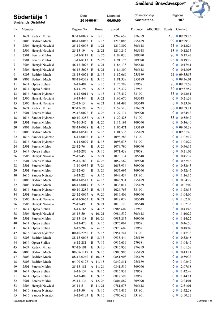 Småland Brevduvesport Södertälje 1 Smålands Distriktet Date Liberated Championship Pigeons 2014-06-01 06:00:00 Kortdistans 107 Plc Member Pigeon No 1 2 3 4 5 6 7 8 9 10 11 12 13 14 15 16 17 18 19 20 21 22 23 24 25 26 27 28 29 30 31 32 33 34 35 36 37 38 39 40 41 42 43 44 45 46 47 48 49 50 51 52 53 54 55 1624 8803 2506 2506 2501 2501 2506 2506 8803 8803 1614 1614 1616 2506 2506 1624 2501 1616 2501 8803 8803 1616 1616 2501 1614 2506 2501 2501 2501 1616 8803 8803 1616 2501 2506 2506 1614 2506 2501 1614 1614 1616 8803 1614 1624 8803 8803 8803 2501 1614 1614 2501 2506 1616 1616 87-11-0079 88-13-0062 25-12-0008 25-13-19 13-11-8117 13-11-8113 46-13-5076 46-13-5078 88-13-0021 88-11-0578 16-13-484 16-11-194 16-12-0014 16-13-444 25-13-15 87-12-190 25-12-0072 00-10-2258 76-10-342 88-13-0038 88-11-0510 16-13-0002 16-11-0099 25-12-76 16-12-283 25-12-45 25-13-180 13-10-0937 25-12-63 16-13-22 88-11-0543 88-13-0017 00-10-2287 25-12-0067 42-11-9663 25-12-49 16-11-165 25-13-50 25-13-138 16-13-470 16-12-282 00-10-2256 88-13-0008 16-12-281 87-12-191 88-09-1119 88-12-0260 04-09-0128 25-13-181 16-11-154 16-13-480 25-11-134 25-11-5 16-13-50 16-12-0103 Kadric Mirza Bedrich Mach Henryk Nowicki Henryk Nowicki Ferens Miklos Ferens Miklos Henryk Nowicki Henryk Nowicki Bedrich Mach Bedrich Mach Oprea Stelian Oprea Stelian Sandor Nyisztor Henryk Nowicki Henryk Nowicki Kadric Mirza Ferens Miklos Sandor Nyisztor Ferens Miklos Bedrich Mach Bedrich Mach Sandor Nyisztor Sandor Nyisztor Ferens Miklos Oprea Stelian Henryk Nowicki Ferens Miklos Ferens Miklos Ferens Miklos Sandor Nyisztor Bedrich Mach Bedrich Mach Sandor Nyisztor Ferens Miklos Henryk Nowicki Henryk Nowicki Oprea Stelian Henryk Nowicki Ferens Miklos Oprea Stelian Oprea Stelian Sandor Nyisztor Bedrich Mach Oprea Stelian Kadric Mirza Bedrich Mach Bedrich Mach Bedrich Mach Ferens Miklos Oprea Stelian Oprea Stelian Ferens Miklos Henryk Nowicki Sandor Nyisztor Sandor Nyisztor Smålands Distriktet Home A E E A E E E E E E A A A E A A E A E E E E E E A A E E E A E E E A E E A A E E A E E E E E E A A A E A E A E 1 / 10 1 / 15 1 / 21 2 / 21 1 / 26 2 / 26 3 / 21 4 / 21 2 / 15 3 / 15 1 / 15 2 / 15 1 / 15 5 / 21 6 / 21 2 / 10 3 / 26 2 / 15 4 / 26 4 / 15 5 / 15 3 / 15 4 / 15 5 / 26 3 / 15 7 / 21 6 / 26 7 / 26 8 / 26 5 / 15 6 / 15 7 / 15 6 / 15 9 / 26 8 / 21 9 / 21 4 / 15 10 / 21 10 / 26 5 / 15 6 / 15 7 / 15 8 / 15 7 / 15 3 / 10 9 / 15 10 / 15 11 / 15 11 / 26 8 / 15 9 / 15 12 / 26 11 / 21 8 / 15 9 / 15 Speed 1262,659 1218,086 1210,807 1210,247 1199,030 1191,175 1186,138 1184,300 1182,069 1181,339 1175,789 1175,377 1173,417 1166,670 1161,497 1157,518 1127,174 1122,425 1117,193 1106,471 1101,535 1098,283 1093,638 1079,790 1071,438 1070,134 1057,562 1055,936 1055,695 1049,434 1043,931 1033,014 1026,763 1016,409 1012,079 1010,128 0985,602 0984,532 0983,215 0975,064 0970,609 0954,744 0935,444 0917,639 0916,853 0900,985 0851,908 0842,811 0841,519 0815,833 0812,593 0804,887 0781,675 0717,417 0705,622 Sida 1 Distance 276859 255189 305648 305648 309090 309090 305648 305648 255189 255189 279681 279681 331901 305648 305648 276859 309090 331901 309090 255189 255189 331901 331901 309090 279681 305648 309090 309090 309090 331901 255189 255189 331901 309090 305648 305648 279681 305648 309090 279681 279681 331901 255189 279681 276859 255189 255189 255189 309090 279681 279681 309090 305648 331901 331901 ABCDE F Points 100 99 98 97 96 95 0 0 92 0 90 89 88 0 0 85 0 83 0 0 0 0 0 0 0 0 0 0 0 0 0 0 0 0 0 0 0 0 0 0 0 0 0 0 0 0 0 0 0 0 0 0 0 0 0 Clocked 0 0 0 0 0 0 0 0 0 0 0 0 0 0 0 0 0 0 0 0 0 0 0 0 0 0 0 0 0 0 0 0 0 0 0 0 0 0 0 0 0 0 0 0 0 0 0 0 0 0 0 0 0 0 0 09:39:16 09:29:30 10:12:26 10:12:33 10:17:47 10:19:29 10:17:41 10:18:05 09:35:53 09:36:01 09:57:52 09:57:57 10:42:51 10:21:59 10:23:09 09:59:11 10:34:13 10:55:42 10:36:40 09:50:38 09:51:40 11:02:12 11:03:29 10:46:15 10:21:02 10:45:37 10:52:16 10:52:43 10:52:47 11:16:16 10:04:27 10:07:02 11:23:15 11:04:06 11:02:00 11:02:35 10:43:46 11:10:27 11:14:22 10:46:50 10:48:09 11:47:38 10:32:48 11:04:47 11:01:58 10:43:14 10:59:33 11:02:47 12:07:18 11:42:49 11:44:11 12:24:01 12:31:01 13:42:38 13:50:22 Cumulus 1.0 Småland Brevduvesport Plc Member Pigeon No 56 57 58 59 60 61 62 63 64 65 2506 2501 2501 2501 2501 2506 8803 2506 2506 1624 39-09-5725 25-13-163 16-12-0112 16-09-305 25-13-168 25-13-38 88-13-0050 46-13-5084 46-12-5276 87-13-172 Henryk Nowicki Ferens Miklos Ferens Miklos Ferens Miklos Ferens Miklos Henryk Nowicki Bedrich Mach Henryk Nowicki Henryk Nowicki Kadric Mirza Smålands Distriktet Home A A E E E E E A E E 12 / 21 13 / 26 14 / 26 15 / 26 16 / 26 13 / 21 12 / 15 14 / 21 15 / 21 4 / 10 Speed 0679,898 0655,338 0652,295 0645,889 0643,357 0562,422 0466,368 0453,058 0413,942 0381,366 Sida 2 Distance 305648 309090 309090 309090 309090 305648 255189 305648 305648 276859 ABCDE F Points Clocked 0 0 0 0 0 0 0 0 0 0 0 0 0 0 0 0 0 0 0 0 13:29:33 13:51:39 13:53:51 13:58:33 14:00:26 15:03:27 15:07:11 17:14:38 18:18:23 18:05:58 Cumulus 1.0