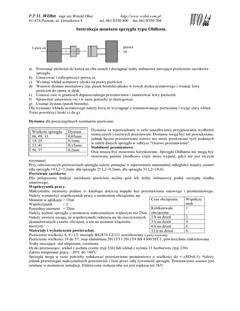 P.P.H. WObit mgr LQ*:LWROG2EHUhttp://www.wobit.com.pl 3R]QDXO*UXV]NRZDWHOfax 061/8350 704 ,QVWUXNFMDPRQWD*XVSU] JáDW\SX2OGKDP /HZDR prawa R a) 3U]HVXQüSLHUFLHGRNRFDQDREXRVLDFKLGRFLJQüUXE\LPEXVRZHPRFXMFHSLHUFLHQLH]DFLVNRZH VSU] JáD b) 8PRFRZDüL]DEH]SLHF]\üSUDZR c) :FLVQüZNáDGDFHWDWRZ\G\VNQDSUDZ\SLHUFLH d) :VWDZLüG\VWDQVPRQWD*RZ\QSSDVHNEULVWROXSáDVNRZURZHNG\VNXDFHWDWRZHJRLZVXQüOHZ\ SLHUFLHGRRSRUXZG\VN e) 8VWDZLüRVLHZJUDQLFDFKGRSXV]F]DOQHJRSU]HVWDZLHQLDL]DPRFRZDüOHZ\SLHUFLH f) 6SUDZG]LüXVWDZLHQLHRVLLZUD]LHSRWU]HE\MHVNRU\JRZDü g) 8VXQüG\VWDQVSDVHNbristolu). 'ODZ\PLDQ\ZNáDGXDFHWDWRZHJRQDOH*\OHZRZ\FLJQü]ZPRQWRZDQHJRSLHUFLHQLDLZ\MüVWDU\ZNáDG 7HUD]SRZWyU]\üNURNLFGRJ Dystanse GODSRV]F]HJyOQ\FKUR]PLDUyZSLHUFLHQL :LHONRüVSU] JáD 06, 09, 13 19, 25 33, 41 50, 57 Dystans 0,05mm 0,1mm 0,15mm 0,2mm Dystanse VD ZSURZDG]DQH Z FHOX XPR*OLZLHQLD SU]\MPRZDQLD Z\GáX*H WHUPLF]Q\FKLRVLRZ\FKSU]HVWDZLH'\VWDQVHPRJE\üWH*SRZL NV]DQH MHGQDNáF]QHSU]HVWDZLHQLDRVLRZHQLHPR*HSU]HNUDF]DüW\FK SRGDQ\FK ZWDEHOLGDQ\FKVSU] JáDZUXEU\FH2VLRZHSU]HVWDZLHQLH 6WDELOQRüSURPLHQLRZD. 2VLHPXV]E\üVWRVRZQLHáR*\VNRZDQH6SU] JáD2OGKDPDQLHPRJE\ü VWRVRZDQH SDUDPL URGNRZD F] ü PR*H Z\SDü JG\* QLH MHVW QLF]\P trzymana). Przy RGZLHUFRQ\FKSLHUFLHQLDFKVSU] JáDQDOH*\SDPL WDüR]DSHZQLHQLXPLQLPDOQHMRGOHJáRFLPL G]\RVLDPL GODVSU] JáD/ PPGODVSU] JáD/ PPGODVSU] JáD/ 3LHUFLHQLH]DFLVNRZH. 'OD SROHSV]HQLD IXQNFML ]DFLVNDQLD SLHUFLHQL PR*QD SRG áHE UXE\ LPEXVRZHM SRGDü V]F]\SW URGND smarowego. :VSyáF]\QQLNSUDF\ 0DNV\PDOQH PRPHQW\ SRGDQH Z NDWDORJX GRW\F] QDS GX EH] SU]HVWDZLHQLD RVLRZHJR L SURPLHQLRZHJR 1DOH*\Z\PQR*\üZVSyáF]\QQLNSUDF\]PRPHQWHPREFL*HQLDQS &]DVREFL*HQLD :VSyáF]\ Moment w aplikacji = 1Nm nnik :VSyáF]\QQLN .UyWNRWUZDáH 1 Potrzebny moment = 2Nm REFL]HQLD 1DOH*\Z\EUDüVSU] JáRRPRPHQFLHPDNV\PDOQ\PZL NV]\PQL*1P 2 1DOH*\]ZUyFLüXZDJ *HZVSyáF]\QQLNLRGQRV]VL GRU]HF]\ZLVW\FK KQDG]LH KQDG]LH 4 VNXPXORZDQ\FKF]DVyZREFL*HDQLHQDPRPHQWZáF]HQLD maszyny. KQDG]LH 6 0DWHULDá\LZ\NRF]HQLHSRZLHU]FKQL KQDG]LH 8 3LHUFLHQLHZLHONRFLLPRVLG]%6&=szorstkowany i pasywowany 3LHUFLHQLHZLHONRFLGRVWRSDOXPLQLXP7,7%6)&SRZLHU]FKQLDelaksolowana UXE\PRFXMFHVWDOXOHSV]RQDF]HUQLRQD '\VNLSU]HQRV]FHZNáDG]DFHWDWXF]DUQ\W\SOXEZNáDG]Q\ORQXEH]EDUZQ\W\S Zakres temperatur pracy: -20oC do +60oC 6SU] JáD PRJ Z UD]LH SRWU]HE\ UHGXNRZDü SU]HVWDZLHQLH SURPLHQLRZH R ZLHONRFL GR IL'[ 1DOH*\ MHGQDNSU]HVWU]HJDüPDNV\PDOQ\FKSU]HVWDZLHLOX]XSU]H]FDá*\ZRWQRüVSU] JáD3U]HVWDZLHQLHRVLRZHMHVW XVWDODQHZPRPHQFLHLQVWDODFML(OHNWU\F]QDL]RODFMDREXRVLMHVWZL NV]DQL*N9