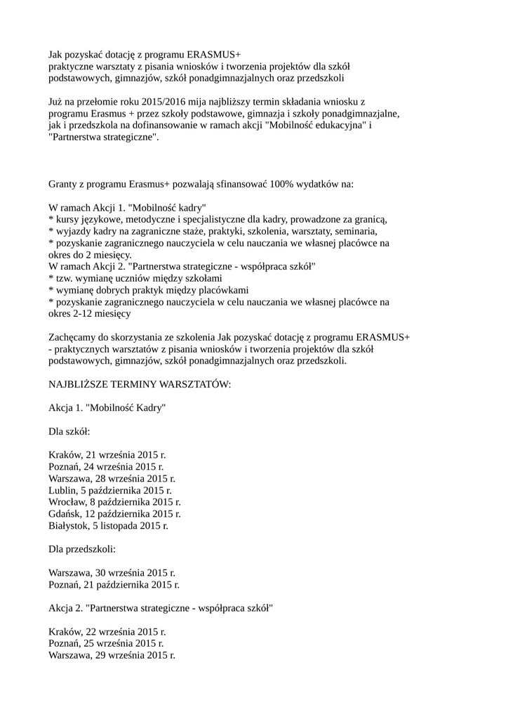 Jak pozyskać dotację z programu ERASMUS+ praktyczne warsztaty z pisania wniosków i tworzenia projektów dla szkół podstawowych, gimnazjów, szkół ponadgimnazjalnych oraz przedszkoli Już na przełomie roku 2015/2016 mija najbliższy termin składania wniosku z programu Erasmus + przez szkoły podstawowe, gimnazja i szkoły ponadgimnazjalne, jak i przedszkola na dofinansowanie w ramach akcji "Mobilność edukacyjna" i "Partnerstwa strategiczne". Granty z programu Erasmus+ pozwalają sfinansować 100% wydatków na: W ramach Akcji 1. "Mobilność kadry" * kursy językowe, metodyczne i specjalistyczne dla kadry, prowadzone za granicą, * wyjazdy kadry na zagraniczne staże, praktyki, szkolenia, warsztaty, seminaria, * pozyskanie zagranicznego nauczyciela w celu nauczania we własnej placówce na okres do 2 miesięcy. W ramach Akcji 2. "Partnerstwa strategiczne - współpraca szkół" * tzw. wymianę uczniów między szkołami * wymianę dobrych praktyk między placówkami * pozyskanie zagranicznego nauczyciela w celu nauczania we własnej placówce na okres 2-12 miesięcy Zachęcamy do skorzystania ze szkolenia Jak pozyskać dotację z programu ERASMUS+ - praktycznych warsztatów z pisania wniosków i tworzenia projektów dla szkół podstawowych, gimnazjów, szkół ponadgimnazjalnych oraz przedszkoli. NAJBLIŻSZE TERMINY WARSZTATÓW: Akcja 1. "Mobilność Kadry" Dla szkół: Kraków, 21 września 2015 r. Poznań, 24 września 2015 r. Warszawa, 28 września 2015 r. Lublin, 5 października 2015 r. Wrocław, 8 października 2015 r. Gdańsk, 12 października 2015 r. Białystok, 5 listopada 2015 r. Dla przedszkoli: Warszawa, 30 września 2015 r. Poznań, 21 października 2015 r. Akcja 2. "Partnerstwa strategiczne - współpraca szkół" Kraków, 22 września 2015 r. Poznań, 25 września 2015 r. Warszawa, 29 września 2015 r. Lublin, 6 października 2015 r. Wrocław, 9 października 2015 r. Gdańsk, 13 października 2015 r. Białystok, 6 listopada 2015 r. Na szkoleniu dowiedzą się Państwo: * jakich formalności należy dopełnić, żeby złożyć wniosek w najbliższym terminie – przełom 2015/2016 r. dla akcji: "Mobilność kadry", "Partnerstwa strategiczne", * jak napisać wniosek, żeby mieć gwarancję pozyskania środków – ekspert napisze z Państwem przykładowy wniosek z wykorzystaniem formularza ERASMUS+ oraz wyjaśni wszystkie zawiłości formalne, * w jaki sposób pozyskać partnera projektu oraz jakie kryteria musi spełniać partner, * jak krok po kroku stworzyć projekt wykorzystania grantu z akcji "Mobilność kadry", "Partnerstwa strategiczne - współpraca szkół", * jak sfinansować koszty zarządzania projektem (np. osób dedykowanych do pisania wniosków, rozliczania i raportowania realizacji projektu) z przyznanych środków, * jak wygospodarować z budżetu projektu ERASMUS+ dodatkowe fundusze na cele własne placówki np. związane z doposażeniem. Szczegółowe informacje dotyczące szkolenia znajdują się na stronie:<http://www.szkolenia-erasmus.org> . Organizator szkolenia: Agencja Pracy Twórczej.
