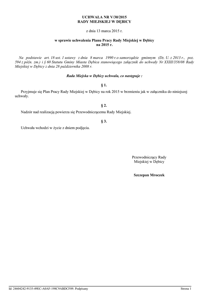 UCHWAŁA NR V/30/2015 RADY MIEJSKIEJ W DĘBICY z dnia 13 marca 2015 r. w sprawie uchwalenia Planu Pracy Rady Miejskiej w Dębicy na 2015 r. Na podstawie art. 18 ust. 1 ustawy z dnia 8 marca 1990 r.o samorządzie gminnym (Dz. U. z 2013 r., poz. 594 z późn. zm.) i § 60 Statutu Gminy Miasta Dębica stanowiącego załącznik do uchwały Nr XXIII/358/08 Rady Miejskiej w Dębicy z dnia 28 października 2008 r. Rada Miejska w Dębicy uchwala, co następuje : § 1. Przyjmuje się Plan Pracy Rady Miejskiej w Dębicy na rok 2015 w brzmieniu jak w załączniku do niniejszej uchwały. § 2. Nadzór nad realizacją powierza się Przewodniczącemu Rady Miejskiej. § 3. Uchwała wchodzi w życie z dniem podjęcia. Przewodniczący Rady Miejskiej w Dębicy Szczepan Mroczek Id: 24604242-9135-49EC-A0AF-198C9ABDCF09. Podpisany Strona 1 Załącznik do Uchwały Nr V/30/2015 Rady Miejskiej w Dębicy z dnia 13 marca 2015 r. Plan Pracy Rady Miejskiej w Dębicy na 2015 r. Lp. Temat Termin realizacji Odpowiedzialny za realizację Komisja Prawno – Organizacyjna 1. Podsumowanie wyborów do Rad Osiedlowych czerwiec 2. PRZERWA lipiec, sierpień 3. Analiza dróg pod względem bezpieczeństwa - określenie miejsc najbardziej niebezpiecznych dla ruchu kołowego i pieszego wrzesień Komisja Infrastruktury 4. Analiza wyników nauczania w szkołach, oraz naboru do klas pierwszych oraz przygotowania do remontów. wrzesień Komisja Oświaty 5. Analiza wykonania budżetu Miasta Dębica za I półrocze 2015 r. październik Komisja Budżetu, Handlu i Usług 6. Analiza funkcjonowania pomocy społecznej z uwzględnieniem świetlic środowiskowych październik Komisja Rodziny i Polityki Społecznej 7. Zestawienie nieodpłatnych rezerwacji obiektów sportowych dla klubów sportowych i stowarzyszeń listopad Komisja Sportu 8. Analiza funkcjonowania Miejskiego Ośrodka Kultury ze szczególnym uwzględnieniem działalności merytoryczno – finansowej Domu Kultury i Kina „Kosmos” grudzień Komisja Kultury Id: 24604242-9135-49EC-A0AF-198C9ABDCF09. Podpisany Strona 1 Id: 24604242-9135-49EC-A0AF-198C9ABDCF09. Podpisany Strona 2
