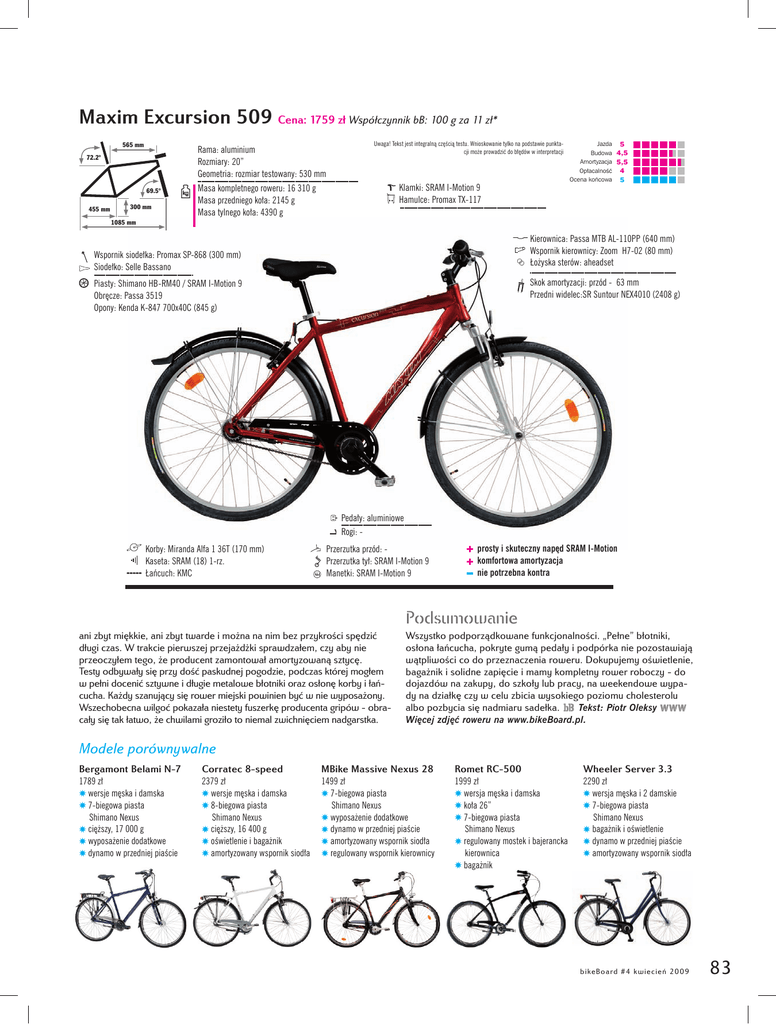 Maxim Excursion 509 Cena: 1759 zł Współczynnik bB: 100 g za 11 zł* 565 mm Rama: aluminium Rozmiary: 20” Geometria: rozmiar testowany: 530 mm 72.2° 69.5° 455 mm 300 mm Uwaga! Tekst jest integralną częścią testu. Wnioskowanie tylko na podstawie punktacji może prowadzić do błędów w interpretacji Klamki: SRAM I-Motion 9 Hamulce: Promax TX-117 Masa kompletnego roweru: 16 310 g Masa przedniego koła: 2145 g Masa tylnego koła: 4390 g Jazda 5 Budowa 4,5 Amortyzacja 5,5 Opłacalność 4 Ocena końcowa 5 1085 mm Kierownica: Passa MTB AL-110PP (640 mm) Wspornik kierownicy: Zoom H7-02 (80 mm) Łożyska sterów: aheadset Wspornik siodełka: Promax SP-868 (300 mm) Siodełko: Selle Bassano Skok amortyzacji: przód - 63 mm Przedni widelec:SR Suntour NEX4010 (2408 g) Piasty: Shimano HB-RM40 / SRAM I-Motion 9 Obręcze: Passa 3519 Opony: Kenda K-847 700x40C (845 g) Pedały: aluminiowe Rogi: Korby: Miranda Alfa 1 36T (170 mm) Kaseta: SRAM (18) 1-rz. Łańcuch: KMC Przerzutka przód: Przerzutka tył: SRAM I-Motion 9 Manetki: SRAM I-Motion 9 prosty i skuteczny napęd SRAM I-Motion komfortowa amortyzacja nie potrzebna kontra Podsumowanie ani zbyt miękkie, ani zbyt twarde i można na nim bez przykrości spędzić długi czas. W trakcie pierwszej przejażdżki sprawdzałem, czy aby nie przeoczyłem tego, że producent zamontował amortyzowaną sztycę. Testy odbywały się przy dość paskudnej pogodzie, podczas której mogłem w pełni docenić sztywne i długie metalowe błotniki oraz osłonę korby i łańcucha. Każdy szanujący się rower miejski powinien być w nie wyposażony. Wszechobecna wilgoć pokazała niestety fuszerkę producenta gripów - obracały się tak łatwo, że chwilami groziło to niemal zwichnięciem nadgarstka. Wszystko podporządkowane funkcjonalności. „Pełne” błotniki, osłona łańcucha, pokryte gumą pedały i podpórka nie pozostawiają wątpliwości co do przeznaczenia roweru. Dokupujemy oświetlenie, bagażnik i solidne zapięcie i mamy kompletny rower roboczy - do dojazdów na zakupy, do szkoły lub pracy, na weekendowe wypady na działkę czy w celu zbicia wysokiego poziomu cholesterolu albo pozbycia się nadmiaru sadełka. Tekst: Piotr Oleksy Więcej zdjęć roweru na www.bikeBoard.pl. Modele porównywalne Bergamont Belami N-7 1789 zł wersje męska i damska 7-biegowa piasta Shimano Nexus cięższy, 17 000 g wyposażenie dodatkowe dynamo w przedniej piaście Corratec 8-speed 2379 zł wersje męska i damska 8-biegowa piasta Shimano Nexus cięższy, 16 400 g oświetlenie i bagażnik amortyzowany wspornik siodła MBike Massive Nexus 28 1499 zł 7-biegowa piasta Shimano Nexus wyposażenie dodatkowe dynamo w przedniej piaście amortyzowany wspornik siodła regulowany wspornik kierownicy Romet RC-500 1999 zł wersja męska i damska koła 26” 7-biegowa piasta Shimano Nexus regulowany mostek i bajerancka kierownica bagażnik Wheeler Server 3.3 2290 zł wersja męska i 2 damskie 7-biegowa piasta Shimano Nexus bagażnik i oświetlenie dynamo w przedniej piaście amortyzowany wspornik siodła bi ke Boa r d # 4 kwi ec i eń 2 0 0 9 83
