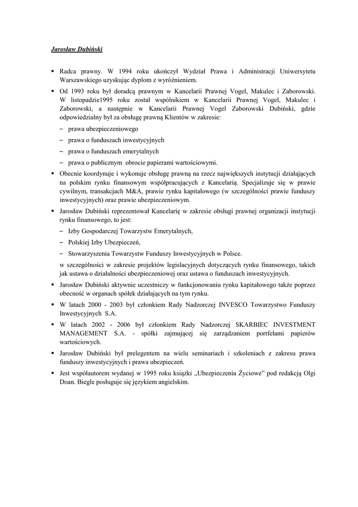 Jarosław Dubiński Radca prawny. W 1994 roku ukończył Wydział Prawa i Administracji Uniwersytetu Warszawskiego uzyskując dyplom z wyróżnieniem. Od 1993 roku był doradcą prawnym w Kancelarii Prawnej Vogel, Makulec i Zaborowski. W listopadzie1995 roku został wspólnikiem w Kancelarii Prawnej Vogel, Makulec i Zaborowski, a następnie w Kancelarii Prawnej Vogel Zaborowski Dubiński, gdzie odpowiedzialny był za obsługę prawną Klientów w zakresie: – prawa ubezpieczeniowego – prawa o funduszach inwestycyjnych – prawa o funduszach emerytalnych – prawa o publicznym obrocie papierami wartościowymi. Obecnie koordynuje i wykonuje obsługę prawną na rzecz największych instytucji działających na polskim rynku finansowym współpracujących z Kancelarią. Specjalizuje się w prawie cywilnym, transakcjach M&A, prawie rynku kapitałowego (w szczególności prawie funduszy inwestycyjnych) oraz prawie ubezpieczeniowym. Jarosław Dubiński reprezentował Kancelarię w zakresie obsługi prawnej organizacji instytucji rynku finansowego, to jest: – Izby Gospodarczej Towarzystw Emerytalnych, – Polskiej Izby Ubezpieczeń, – Stowarzyszenia Towarzystw Funduszy Inwestycyjnych w Polsce. w szczególności w zakresie projektów legislacyjnych dotyczących rynku finansowego, takich jak ustawa o działalności ubezpieczeniowej oraz ustawa o funduszach inwestycyjnych. Jarosław Dubiński aktywnie uczestniczy w funkcjonowaniu rynku kapitałowego także poprzez obecność w organach spółek działających na tym rynku. W latach 2000 - 2003 był członkiem Rady Nadzorczej INVESCO Towarzystwo Funduszy Inwestycyjnych S.A. W latach 2002 - 2006 był członkiem Rady Nadzorczej SKARBIEC INVESTMENT MANAGEMENT S.A. - spółki zajmującej się zarządzaniem portfelami papierów wartościowych. Jarosław Dubiński był prelegentem na wielu seminariach i szkoleniach z zakresu prawa funduszy inwestycyjnych i prawa ubezpieczeń. Jest współautorem wydanej w 1995 roku książki „Ubezpieczenia Życiowe” pod redakcją Olgi Doan. Biegle posługuje się językiem angielskim.