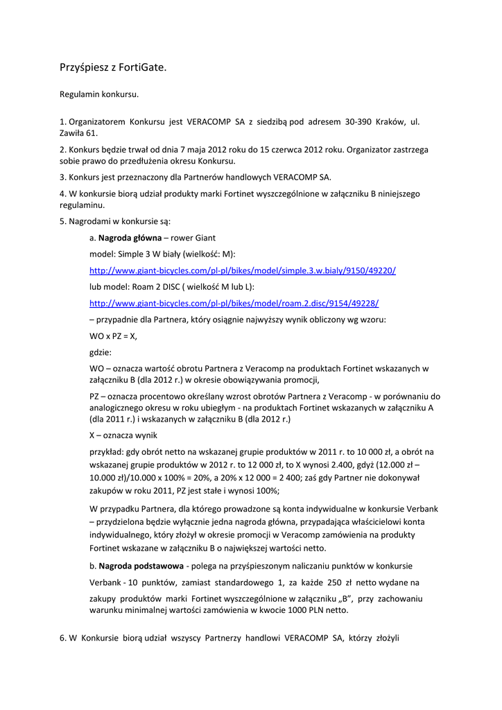 Przyśpiesz z FortiGate. Regulamin konkursu. 1. Organizatorem Konkursu jest VERACOMP SA z siedzibą pod adresem 30-390 Kraków, ul. Zawiła 61. 2. Konkurs będzie trwał od dnia 7 maja 2012 roku do 15 czerwca 2012 roku. Organizator zastrzega sobie prawo do przedłużenia okresu Konkursu. 3. Konkurs jest przeznaczony dla Partnerów handlowych VERACOMP SA. 4. W konkursie biorą udział produkty marki Fortinet wyszczególnione w załączniku B niniejszego regulaminu. 5. Nagrodami w konkursie są: a. Nagroda główna – rower Giant model: Simple 3 W biały (wielkość: M): http://www.giant-bicycles.com/pl-pl/bikes/model/simple.3.w.bialy/9150/49220/ lub model: Roam 2 DISC ( wielkość M lub L): http://www.giant-bicycles.com/pl-pl/bikes/model/roam.2.disc/9154/49228/ – przypadnie dla Partnera, który osiągnie najwyższy wynik obliczony wg wzoru: WO x PZ = X, gdzie: WO – oznacza wartość obrotu Partnera z Veracomp na produktach Fortinet wskazanych w załączniku B (dla 2012 r.) w okresie obowiązywania promocji, PZ – oznacza procentowo określany wzrost obrotów Partnera z Veracomp - w porównaniu do analogicznego okresu w roku ubiegłym - na produktach Fortinet wskazanych w załączniku A (dla 2011 r.) i wskazanych w załączniku B (dla 2012 r.) X – oznacza wynik przykład: gdy obrót netto na wskazanej grupie produktów w 2011 r. to 10 000 zł, a obrót na wskazanej grupie produktów w 2012 r. to 12 000 zł, to X wynosi 2.400, gdyż (12.000 zł – 10.000 zł)/10.000 x 100% = 20%, a 20% x 12 000 = 2 400; zaś gdy Partner nie dokonywał zakupów w roku 2011, PZ jest stałe i wynosi 100%; W przypadku Partnera, dla którego prowadzone są konta indywidualne w konkursie Verbank – przydzielona będzie wyłącznie jedna nagroda główna, przypadająca właścicielowi konta indywidualnego, który złożył w okresie promocji w Veracomp zamówienia na produkty Fortinet wskazane w załączniku B o największej wartości netto. b. Nagroda podstawowa - polega na przyśpieszonym naliczaniu punktów w konkursie Verbank - 10 punktów, zamiast standardowego 1, za każde 250 zł netto wydane na zakupy produktów marki Fortinet wyszczególnione w załączniku „B”, przy zachowaniu warunku minimalnej wartości zamówienia w kwocie 1000 PLN netto. 6. W Konkursie biorą udział wszyscy Partnerzy handlowi VERACOMP SA, którzy złożyli zamówienie i zakupili sprzęt oferowany przez VERACOMP SA w okresie trwania Konkursu, co będzie potwierdzone fakturą VAT z wystawienia VERACOMP SA. 7. W konkursie nie biorą udziału zakupy w cenach specjalnych. 8. Korzyści wynikających z konkursu nie można łączyć z innymi akcjami promocyjnymi produktów Fortinet. 9. Nagroda w postaci przyspieszonego naliczania punktów zostaje przyznana Partnerom zarejestrowanym w konkursie Verbank jedynie za zamówienia złożone poprzez system V-ZAM, a zasady uczestnictwa w konkursie Verbank są określone osobnym regulaminem dostępnym na stronie internetowej http://verbank.veracomp.pl/. 10. Nagroda rzeczowa zostanie wysłana po zakończeniu konkursu. Nagroda w postaci przyspieszonego naliczania punktów zostaje przyznana następnego dnia po zafakturowaniu zamówienia spełniającego warunki konkursu. 11. Organizator zastrzega sobie możliwość zamiany nagrody na inną o podobnej wartości i walorach użytkowych. 12. Nagroda nie może zostać zamieniona na równowartość pieniężną. 13. Do spraw nieuregulowanych niniejszym regulaminem stosuje się odpowiednie przepisy kodeksu cywilnego. Regulamin Konkursu w oryginale jest dostępny do wglądu w siedzibie firmy VERACOMP SA. ZAŁĄCZNIK „A” do regulaminu – produkty Fortinet z oferty Veracomp z 2011 roku, których zakupy będą brane pod uwagę w rywalizacji o nagrodę główną. kod produktu w Veracomp FOR-FG-30B FOR-FG-30B-BDL FOR-FG-30B-BDL-900-24 FOR-FG-30B-BDL-900-36 FOR-FG-30B-BDL-950-12 FOR-FG-30B-BDL-950-24 FOR-FG-30B-BDL-950-36 FOR-FWF-30B FOR-FWF-30B-BDL FOR-FWF-30B-BDL-900-24 FOR-FWF-30B-BDL-900-36 FOR-FWF-30B-BDL-950-12 FOR-FWF-30B-BDL-950-24 FOR-FWF-30B-BDL-950-36 FOR-FG-50B FOR-FG-50B-BDL FOR-FG-50B-BDL-900-24 FOR-FG-50B-BDL-900-36 FOR-FG-50B-BDL-950-12 FOR-FG-50B-BDL-950-24 FOR-FG-50B-BDL-950-36 FOR-FG-51B FOR-FG-51B-BDL FOR-FG-51B-BDL-900-24 FOR-FG-51B-BDL-900-36 FOR-FG-51B-BDL-950-12 FOR-FG-51B-BDL-950-24 FOR-FG-51B-BDL-950-36 FOR-FWF-50B FOR-FWF-50B-BDL FOR-FWF-50B-BDL-900-24 FOR-FWF-50B-BDL-900-36 FOR-FWF-50B-BDL-950-12 FOR-FWF-50B-BDL-950-24 FOR-FWF-50B-BDL-950-36 FOR-FG-60C FOR-FG-60C-BDL FOR-FG-60C-BDL-900-24 FOR-FG-60C-BDL-900-36 FOR-FG-60C-BDL-950-12 FOR-FG-60C-BDL-950-24 FOR-FG-60C-BDL-950-36 FOR-FWF-60C FOR-FWF-60C-BDL FOR-FWF-60C-BDL-900-24 FOR-FWF-60C-BDL-900-36 FOR-FWF-60C-BDL-950-12 FOR-FWF-60C-BDL-950-24 FOR-FWF-60C-BDL-950-36 FOR-FWF-60CM FOR-FWF-60CM-BDL FOR-FWF-60CM-BDL-900-24 FOR-FWF-60CM-BDL-900-36 FOR-FWF-60CM-BDL-950-12 FOR-FWF-60CM-BDL-950-24 FOR-FWF-60CM-BDL-950-36 FOR-FWF-60CX-ADSL-A FOR-FWF-60CX-ADSL-A-BDL FOR-FWF-60CX-ADSL-A-BDL-900-24 FOR-FWF-60CX-ADSL-A-BDL-900-36 FOR-FWF-60CX-ADSL-A-BDL-950-12 FOR-FWF-60CX-ADSL-A-BDL-950-24 FOR-FWF-60CX-ADSL-A-BDL-950-36 FOR-FG-80C FOR-FG-80C-BDL FOR-FG-80C-BDL-900-24 FOR-FG-80C-BDL-900-36 FOR-FG-80C-BDL-950-12 FOR-FG-80C-BDL-950-24 FOR-FG-80C-BDL-950-36 FOR-FG-80CM FOR-FG-80CM-BDL FOR-FG-80CM-BDL-900-24 FOR-FG-80CM-BDL-900-36 FOR-FG-80CM-BDL-950-12 FOR-FG-80CM-BDL-950-24 FOR-FG-80CM-BDL-950-36 FOR-FWF-80CM FOR-FWF-80CM-BDL FOR-FWF-80CM-BDL-900-24 FOR-FWF-80CM-BDL-900-36 FOR-FWF-80CM-BDL-950-12 FOR-FWF-80CM-BDL-950-24 FOR-FWF-80CM-BDL-950-36 Załącznik „B” do regulaminu – produkty Fortinet aktualnie w ofercie Veracomp, biorące udział w Konkursie Kod produktu w Veracomp FOR-FG-20C FOR-FG-20C-BDL FOR-FWF-20C FOR-FWF-20C-BDL FOR-FG-40C FOR-FG-40C-BDL FOR-FWF-40C FOR-FWF-40C-BDL FOR-FG-50B FOR-FG-50B-BDL FOR-FWF-50B FOR-FWF-50B-BDL FOR-FG-60C FOR-FG-60C-BDL FOR-FWF-60C FOR-FWF-60C-BDL FOR-FWF-60CM FOR-FWF-60CM-BDL FOR-FWF-60CX-ADSLA FOR-FWF-60CX-ADSLA-BDL FOR-FG-80C FOR-FG-80C-BDL
