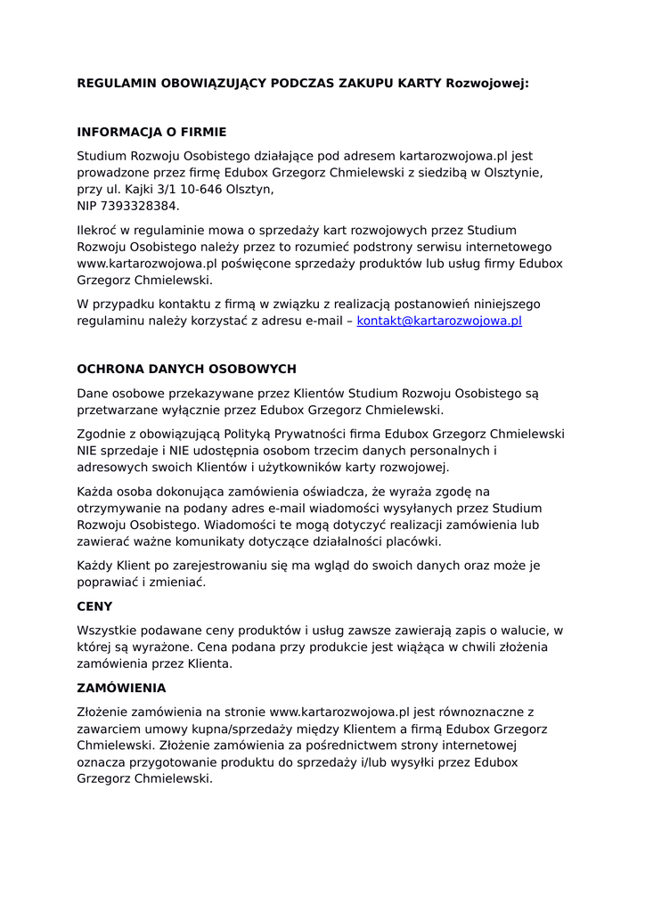 REGULAMIN OBOWIĄZUJĄCY PODCZAS ZAKUPU KARTY Rozwojowej: INFORMACJA O FIRMIE Studium Rozwoju Osobistego działające pod adresem kartarozwojowa.pl jest prowadzone przez firmę Edubox Grzegorz Chmielewski z siedzibą w Olsztynie, przy ul. Kajki 3/1 10-646 Olsztyn, NIP 7393328384. Ilekroć w regulaminie mowa o sprzedaży kart rozwojowych przez Studium Rozwoju Osobistego należy przez to rozumieć podstrony serwisu internetowego www.kartarozwojowa.pl poświęcone sprzedaży produktów lub usług firmy Edubox Grzegorz Chmielewski. W przypadku kontaktu z firmą w związku z realizacją postanowień niniejszego regulaminu należy korzystać z adresu e-mail – [email protected] OCHRONA DANYCH OSOBOWYCH Dane osobowe przekazywane przez Klientów Studium Rozwoju Osobistego są przetwarzane wyłącznie przez Edubox Grzegorz Chmielewski. Zgodnie z obowiązującą Polityką Prywatności firma Edubox Grzegorz Chmielewski NIE sprzedaje i NIE udostępnia osobom trzecim danych personalnych i adresowych swoich Klientów i użytkowników karty rozwojowej. Każda osoba dokonująca zamówienia oświadcza, że wyraża zgodę na otrzymywanie na podany adres e-mail wiadomości wysyłanych przez Studium Rozwoju Osobistego. Wiadomości te mogą dotyczyć realizacji zamówienia lub zawierać ważne komunikaty dotyczące działalności placówki. Każdy Klient po zarejestrowaniu się ma wgląd do swoich danych oraz może je poprawiać i zmieniać. CENY Wszystkie podawane ceny produktów i usług zawsze zawierają zapis o walucie, w której są wyrażone. Cena podana przy produkcie jest wiążąca w chwili złożenia zamówienia przez Klienta. ZAMÓWIENIA Złożenie zamówienia na stronie www.kartarozwojowa.pl jest równoznaczne z zawarciem umowy kupna/sprzedaży między Klientem a firmą Edubox Grzegorz Chmielewski. Złożenie zamówienia za pośrednictwem strony internetowej oznacza przygotowanie produktu do sprzedaży i/lub wysyłki przez Edubox Grzegorz Chmielewski. Złożenie zamówienia na stronie www.kartarozwojowa.pl nie jest równoznaczne z jego przyjęciem. Każde przyjęcie zamówienia powinno być potwierdzone. O przyjęciu zamówienia do realizacji Klient jest informowany drogą mailową. Warunkiem realizacji zamówień płatnych jest wypełnienie wszystkich pól formularza rejestracyjnego i udostępnienie Edubox Grzegorz Chmielewski następujących danych: Imię i nazwisko zamawiającego, Adres zamawiającego oraz adres e-mail, Dane do wystawienia dokumentu sprzedaży (np. NIP, nazwa firmy). Za poprawność wprowadzonych w zamówieniu danych odpowiedzialny jest Klient. W wyjątkowych przypadkach Edubox Grzegorz Chmielewski może odmówić przyjęcia zamówienia, podając jednocześnie przyczynę odmowy. Otrzymanie przez Edubox Grzegorz Chmielewski płatności za zamówione przez Klienta produkty i koszty z tym związane (każdorazowo określone w zamówieniu) jest jednoznaczne z zawarciem umowy kupna/sprzedaży wiążącej obie strony transakcji. Edubox Grzegorz Chmielewski ma prawo anulować zamówienie Klienta, jeśli nie zostanie opłacone w ciągu 7 dni od jego dokonania. PŁATNOŚĆ Aktualnie dostępne metody płatności (np. przelew bankowy, płatności internetowe) są prezentowane każdorazowo Klientowi przed zakończeniem składania zamówienia. PŁATNOŚCI ZA POŚREDNICTWEM SERWISU Przelewy24.pl Płatności za pośrednictwem serwisu przelewy24.pl mogą dokonywać wyłącznie osoby uprawnione do posługiwania się danym instrumentem, w oparciu o który następuje realizacja płatności, w szczególności daną kartą płatniczą może posługiwać się wyłącznie jej uprawniony posiadacz. Wykryte przez firmę przypadki nadużyć będą zgłaszane bezpośrednio do właściwych wydziałów Policji. Edubox Grzegorz Chmielewski poprzez stronę www.kartarozwojowa.pl udostępnia swoim Klientom odpowiedni formularz transakcji. Dane z formularza są automatycznie przekazywane do serwisu płatności internetowych Przelewy24.pl. Serwis umożliwia realizację płatności za pomocą szybkiego przelewu internetowego. Decydując się na tę opcję płatności, klient zostanie automatycznie przekierowany do systemu Przelewy24.pl. Realizując płatność za pomocą przelewu internetowego, po wybraniu swojego banku, należy zalogować się za pomocą danych dostępowych do bankowości internetowej oraz potwierdzić płatność. Serwis Przelewy24.pl posiada Certyfikat Wiarygodności Biznesowej oraz opiera się na szyfrowaniu SSL, gwarantując wysoki poziom bezpieczeństwa zawieranych transakcji. DOSTAWA Warunkiem dostawy produktu jest zaksięgowanie przez Edubox Grzegorz Chmielewski płatności (w przypadku przelewu bankowego w dni robocze – najczęściej do 24 godzin od zlecenia przelewu) lub uzyskanie informacji o dokonaniu płatności od pośrednika płatności internetowych (w przypadku płatności z serwisu przelewy24.pl w dni robocze – najczęściej do kliku minut od dokonania płatności, w wyjątkowych sytuacjach do 24 godzin). Zakupiony produkt można odebrać osobiście w siedzibie Studium Rozwoju Osobistego przy ul. Kopernika 12/3 w Olsztynie lub może on być wysłany w ciągu 7 dni od złożenia zamówienia (zwykle 1-2 dni) za pośrednictwem Poczty Polskiej na adres wskazany przez Klienta podczas składania zamówienia. Edubox Grzegorz Chmielewski ma obowiązek dostarczenia produktu bez wad. DOKUMENT SPRZEDAŻY Klient Studium Rozwoju Osobistego dokonując zakupu wyraża zgodę na udostępnienie mu faktury w formie elektronicznej. ZWROT PRODUKTÓW Klient może odstąpić od umowy kupna/sprzedaży bez podania przyczyn w terminie do 90 dni kalendarzowych od daty zakupu chyba, że oferta zaprezentowana na stronie www.kartarozwojowa.pl dopuszcza dłuższy termin. W przypadku decyzji o zwrocie produktu warto niezwłocznie skontaktować się z Edubox Grzegorz Chmielewski drogą mailową lub telefoniczną w celu sprawnego przeprowadzenia procedury zwrotu zakupionych produktów. Jeżeli Klient dopeł