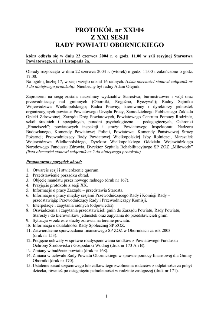 PROTOKÓŁ nr XXI/04 Z XXI SESJI RADY POWIATU OBORNICKIEGO która odbyła się w dniu 22 czerwca 2004 r. o godz. 11.00 w sali sesyjnej Starostwa Powiatowego, ul. 11 Listopada 2a. Obrady rozpoczęto w dniu 22 czerwca 2004 r. (wtorek) o godz. 11:00 i zakończono o godz. 17.00. Na ogólną liczbę 17, w sesji wzięło udział 16 radnych. (Lista obecności stanowi załącznik nr 1 do niniejszego protokołu). Nieobecny był radny Adam Olejnik. Zaproszeni na sesję zostali: naczelnicy wydziałów Starostwa; burmistrzowie i wójt oraz przewodniczący rad gminnych (Oborniki, Rogoźno, Ryczywół); Radny Sejmiku Województwa Wielkopolskiego; Radca Prawny; kierownicy i dyrektorzy jednostek organizacyjnych powiatu: Powiatowego Urzędu Pracy, Samodzielnego Publicznego Zakładu Opieki Zdrowotnej, Zarządu Dróg Powiatowych, Powiatowego Centrum Pomocy Rodzinie, szkół średnich i specjalnych, poradni psychologiczno – pedagogicznych, Ochronki „Franciszek”; powiatowych inspekcji i straży: Powiatowego Inspektoratu Nadzoru Budowlanego, Komendy Powiatowej Policji, Powiatowej Komendy Państwowej Straży Pożarnej; Przewodniczący Rady Powiatowej Wielkopolskiej Izby Rolniczej, Marszałek Województwa Wielkopolskiego, Dyrektor Wielkopolskiego Oddziału Wojewódzkiego Narodowego Funduszu Zdrowia, Dyrektor Szpitala Rehabilitacyjnego SP ZOZ „Miłowody” (lista obecności stanowi załącznik nr 2 do niniejszego protokołu). Proponowany porządek obrad: 1. 2. 3. 4. 5. 6. Otwarcie sesji i stwierdzenie quorum. Przedstawienie porządku obrad. Objęcie mandatu przez nowego radnego (druk nr 167). Przyjęcie protokołu z sesji XX. Informacje o pracy Zarządu – przedstawia Starosta. Informacje o pracy między sesjami Przewodniczącego Rady i Komisji Rady – przedstawiają: Przewodniczący Rady i Przewodniczący Komisji. 7. Interpelacje i zapytania radnych (odpowiedzi). 8. Oświadczenia i zapytania przedstawicieli gmin do Zarządu Powiatu, Rady Powiatu, Starosty i do kierowników jednostek oraz zapytania do przedstawicieli gmin. 9. Sytuacja w zakresie służby zdrowia na terenie powiatu. 10. Informacja o działalności Rady Społecznej SP ZOZ. 11. Zatwierdzenie sprawozdania finansowego SP ZOZ w Obornikach za rok 2003 (druk nr 153). 12. Podjęcie uchwały w sprawie rozdysponowania środków z Powiatowego Funduszu Ochrony Środowiska i Gospodarki Wodnej (druk nr 173 A i B). 13. Zmiany w budżecie powiatu (druk nr 168). 14. Zmiana w uchwale Rady Powiatu Obornickiego w sprawie pomocy finansowej dla Gminy Oborniki (druk nr 170). 15. Ustalenie zasad częściowego lub całkowitego zwolnienia rodziców z odpłatności za pobyt dziecka, również po osiągnięciu pełnoletności w rodzinie zastępczej (druk nr 171). 1 16. Podjęcie uchwały w sprawie rozpatrzenia skargi na działalność Zarządu Dróg Powiatowych w Rogoźnie (druk nr 172). 17. Oświadczenie w sprawie Domu Pomocy Społecznej w budowie w Rogoźnie. 18. Wolne głosy i wnioski. 19. Zamknięcie sesji. Ad. 1/ Otwarcie sesji i stwierdzenie quorum. Przewodniczący Okpisz powitał przybyłych na XXI sesję Rady Powiatu Obornickiego w tym szczególnie gości. Stwierdził, że na ogólną liczbę (w tym momencie) 16 radnych, w sesji bierze udział 15 radnych (dojdzie nowy radny), co stanowi, że wymóg art. 13 ustawy o samorządzie powiatowym został spełniony i Rada Powiatu Obornickiego władna jest do podejmowania prawomocnych uchwał. Poinformował, że protokołowanie posiedzenia Rady prowadzone jest przez pracownika Starostwa panią Aleksandrę Kupczyk. Ad. 2/ Przyjęcie porządku obrad. Przewodniczący Rady Andrzej Okpisz powiedział, że życie jest tak dynamiczne i szybkie, że są nowe projekty uchwał i w związku z tym zaproponował nowy porządek obrad. Starosta Obornicki Antoni Żuromski poprosił o rozszerzenie porządku obrad o punkt: „Wyrażenie opinii w sprawie Domu Pomocy Społecznej”. Był wczoraj na spotkaniu i problem ten jest nabrzmiały. Radny Zdzisław Hinz zaproponował przesunięcie kolejności punktów i przesuniecie pkt 8 do pkt 3, żeby nowy radny mógł już uczestniczyć w dyskusji od wcześniejszych punktów porządku obrad. Przewodniczący przesunął pkt 8 do pkt 3 i powiedział, że nigdy nikomu nie zabronił zadawać pytań. Odczytał nowy porządek obrad. Rada Powiatu Obornickiego w obecności 15 radnych, jednogłośnie przyjęła proponowany rozszerzony porządek obrad. Ad. 3/ Objęcie mandatu przez nowego radnego (druk nr 167). Przewodniczący Okpisz odczytał rotę ślubowania: „Uroczyście ślubuję rzetelnie i sumiennie wykonywać obowiązki wobec Narodu Polskiego, strzec suwerenności i interesów Państwa Polskiego, czynić wszystko dla pomyślności Ojczyzny, wspólnoty samorządowej powiatu i dobra obywateli, przestrzegać Konstytucji i innych praw Rzeczypospolitej Polskiej”. Andrzej Szuberski odpowiedział: „ślubuję”. Uchwała nr XXI/126/04 w sprawie wstąpienia w skład Rady Powiatu Obornickiego na miejsce Pani Elżbiety Chlebda – Pana Andrzeja Szuberskiego została przyjęta przez Radę Powiatu Obornickiego w obecności 17 radnych, jednogłośnie (uchwała stanowi załącznik do niniejszego protokołu). Ad. 4/ Przyjęcie protokołu z sesji XX. 2 Przewodniczący Okpisz odczytał skrót protokołu z poprzedniej XX Sesji Rady Powiatu Obornickiego (załącznik nr 3 do niniejszego protokołu). Protokół z XX Sesji Rady Powiatu Obornickiego został przyjęty przez Radę Powiatu w obecności 17 radnych, jednogłośnie. Ad. 5/ Informacje o pracy Zarządu – przedstawia Starosta. Sekretarz Powiatu Piotr Sitek odczytał informację o pracy Zarządu Powiatu Obornickiego w czasie od ostatniej sesji (załącznik nr 4 do niniejszego protokołu). Starosta Obornicki Antoni Żuromski zdał sprawozdanie ze swoich prac (załącznik nr 5 do niniejszego protokołu). Dodał, że brał również udział w dzisiejszym posiedzeniu Zarządu. Radny Gruszczyński zadał pytanie w sprawie rewaloryzacji płac pracowników 