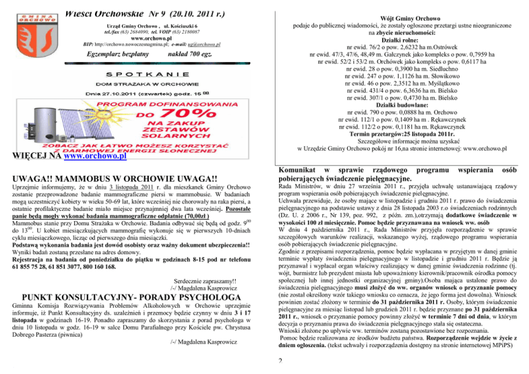 Wieści Orchowskie Nr 9 (20.10. 2011 r.) Wójt Gminy Orchowo podaje do publicznej wiadomości, że zostały ogłoszone przetargi ustne nieograniczone na zbycie nieruchomości: Działki rolne: nr ewid. 76/2 o pow. 2,6232 ha m.Ostrówek nr ewid. 47/3, 47/6, 48,49 m. Gałczynek jako kompleks o pow. 0,7959 ha nr ewid. 52/2 i 53/2 m. Orchówek jako kompleks o pow. 0,6117 ha nr ewid. 28 o pow. 0,3900 ha m. Siedluchno nr ewid. 247 o pow. 1,1126 ha m. Słowikowo nr ewid. 46 o pow. 2,3512 ha m. Myślątkowo nr ewid. 431/4 o pow. 6,3636 ha m. Bielsko nr ewid. 307/1 o pow. 0,4730 ha m. Bielsko Działki budowlane: nr ewid. 790 o pow. 0,0888 ha m. Orchowo nr ewid. 112/1 o pow. 0,1409 ha m . Rękawczynek nr ewid. 112/2 o pow. 0,1181 ha m. Rękawczynek Termin przetargów:25 listopada 2011r. Szczegółowe informacje można uzyskać w Urzędzie Gminy Orchowo pokój nr 16,na stronie internetowej: www.orchowo.pl Urząd Gminy Orchowo , ul. Kościuszki 6 tel./fax (63) 2684090, tel. VOIP (63) 2180087 www.orchowo.pl BIP: http://orchowo.nowoczesnagmina.pl; e-mail: [email protected] Egzemplarz bezpłatny nakład 700 egz. WIĘCEJ NA www.orchowo.pl UWAGA!! MAMMOBUS W ORCHOWIE UWAGA!! Uprzejmie informujemy, że w dniu 3 listopada 2011 r. dla mieszkanek Gminy Orchowo zostanie przeprowadzone badanie mammograficzne piersi w mammobusie. W badaniach mogą uczestniczyć kobiety w wieku 50-69 lat, które wcześniej nie chorowały na raka piersi, a ostatnie profilaktyczne badanie miało miejsce przynajmniej dwa lata wcześniej. Pozostałe panie będą mogły wykonać badania mammograficzne odpłatnie (70,00zł ) Mammobus stanie przy Domu Strażaka w Orchowie. Badania odbywać się będą od godz. 900 do 1300. U kobiet miesiączkujących mammografię wykonuje się w pierwszych 10-dniach cyklu miesiączkowego, licząc od pierwszego dnia miesiączki. Podstawą wykonania badania jest dowód osobisty oraz ważny dokument ubezpieczenia!! Wyniki badań zostaną przesłane na adres domowy. Rejestracja na badania od poniedziałku do piątku w godzinach 8-15 pod nr telefonu 61 855 75 28, 61 851 3077, 800 160 168. Serdecznie zapraszamy!! /-/ Magdalena Kasprowicz PUNKT KONSULTACYJNY- PORADY PSYCHOLOGA Gminna Komisja Rozwiązywania Problemów Alkoholowych w Orchowie uprzejmie informuje, iż Punkt Konsultacyjny ds. uzależnień i przemocy będzie czynny w dniu 3 i 17 listopada w godzinach 16-19. Ponadto zapraszamy do skorzystania z porad psychologa w dniu 10 listopada w godz. 16-19 w salce Domu Parafialnego przy Kościele pw. Chrystusa Dobrego Pasterza (piwnica) /-/ Magdalena Kasprowicz Komunikat w sprawie rządowego programu pobierających świadczenie pielęgnacyjne. wspierania osób Rada Ministrów, w dniu 27 września 2011 r., przyjęła uchwałę ustanawiającą rządowy program wspierania osób pobierających świadczenie pielęgnacyjne. Uchwała przewiduje, że osoby mające w listopadzie i grudniu 2011 r. prawo do świadczenia pielęgnacyjnego na podstawie ustawy z dnia 28 listopada 2003 r.o świadczeniach rodzinnych (Dz. U. z 2006 r., Nr 139, poz. 992, z późn. zm.),otrzymają dodatkowe świadczenie w wysokości 100 zł miesięcznie. Pomoc będzie przyznawana na wniosek ww. osób W dniu 4 października 2011 r., Rada Ministrów przyjęła rozporządzenie w sprawie szczegółowych warunków realizacji, wskazanego wyżej, rządowego programu wspierania osób pobierających świadczenie pielęgnacyjne. Zgodnie z przepisami rozporządzenia, pomoc będzie wypłacana w przyjętym w danej gminie terminie wypłaty świadczenia pielęgnacyjnego w listopadzie i grudniu 2011 r. Będzie ją przyznawał i wypłacał organ właściwy realizujący w danej gminie świadczenia rodzinne (tj. wójt, burmistrz lub prezydent miasta lub upoważniony kierownik/pracownik ośrodka pomocy społecznej lub innej jednostki organizacyjnej gminy).Osoba mająca ustalone prawo do świadczenia pielęgnacyjnego musi złożyć do ww. organów wniosek o przyznanie pomocy (nie został określony wzór takiego wniosku co oznacza, że jego forma jest dowolna). Wniosek powinien zostać złożony w terminie do 31 października 2011 r. Osoby, którym świadczenie pielęgnacyjne za miesiąc listopad lub grudzień 2011 r. będzie przyznane po 31 października 2011 r., wniosek o przyznanie pomocy powinny złożyć w terminie 7 dni od dnia, w którym decyzja o przyznaniu prawa do świadczenia pielęgnacyjnego stała się ostateczna. Wnioski złożone po upływie ww. terminów zostaną pozostawione bez rozpoznania. Pomoc będzie realizowana ze środków budżetu państwa. Rozporządzenie wejdzie w życie z dniem ogłoszenia. (tekst uchwały i rozporządzenia dostępny na stronie internetowej MPiPS) 2 UTYLIZACJA SPRZĘTU RTV I AGD Gmina Orchowo informuje iż na terenie urzędu znajduje się oznakowany garaż do darmowej zbiórki sprzętu elektrycznego i elektronicznego ( RTV i AGD). Zbiórka sprzętu jest prowadzona w dni robocze Urzędu Gminy od poniedziałku do piątku w godzinach pracy od 730 do 1530 Co można oddać: - lodówki, zamrażarki, pralki, zmywarki, piece elektryczne - odkurzacze, czajniki elektryczne, miksery, radia, suszarki do włosów - telewizory, video, monitory, komputery, drukarki, telefony, baterie - sprzęt oświetleniowy, świetlówki, lampy sodowe, żarówki energooszczędne - wiertarki, wkrętarki, kosiarki, piły, spawarki - i wiele innych urządzeń elektrycznych Klucz do punktu składowania sprzętu RTV i AGD dostępny w pokoju nr 6 lub w sekretariacie Urzędu Gminy tel. 632684090 wew. 29 UWAGA PRZEDSIĘBIORCY!!!! Wójt Gminy Orchowo w związku z powstaniem od dnia 1 lipca 2011r CEiDG (Centralnej Ewidencji Działalności Gospodarczej) wzywa wszystkich tych przedsiębiorców, którzy posługują się PKD 2004 lub w ogóle nie posiadają określenia działalności za pomocą kodów PKD o aktualizację wpisu do dnia 07.11.2011r. Aktualizacji podlegają także wpisy, które nie posiadają określenia działalności w postaci 5 – znakowej wg PKD 200