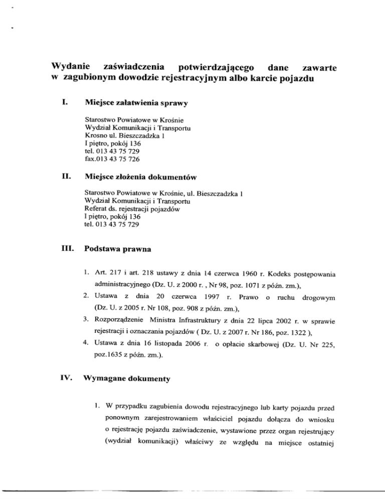 Wydanie zaświadczenia potwierdzającego dane zawarte w zagubionym dowodzie rejestracyjnym albo karcie pojazdu I. Miejsce załatwienia sprawy Starostwo Powiatowe w Krośnie Komunikacji i Transportu Krosno ul. Bieszczadzka 1 I piętro, pokój 136 tel. 013 43 75 729 fax.013 43 75 726 Wydział Il. Miejsce złożenia dokumentów Starostwo Powiatowe w Krośnie, ul. Bieszczadzka 1 Wydział Komunikacji i Transportu Referat ds. rejestracji pojazdów I piętro, pokój 136 tel. 013 43 75 729 III. Podstaw a prawna 1. Art. 217 i art. 218 ustawy z dnia 14 czerwca 1960 r. Kodeks postępowania administrac:Y.jnego (Dz. U. z 2000 r., Nr 98, poz. 1071 z późn. zm.), 2. Ustawa z dnia 20 czerwca 1997 r. Prawo o ruchu drogowym (Dz. U. z 2005 r. Nr 108, poz. 908 z późn. zm.), 3. Rozporządzenie Ministra Infrastruktury z dnia 22 lipca 2002 r. w sprawie rejestracji i oznaczania pojazdów (Dz. U. z 2007 r. Nr 186, poz. 1322 ), 4. Ustawa z dnia 16 listopada 2006 r. o opłacie skarbowej (Dz. U. Nr 225, poz.1635 z późn. zm.). IV. Wymag ane dokumenty 1. W przypadku zagubienia dowodu rejestracyjnego lub karty pojazdu przed ponownym zarejestrowaniem właściciel pojazdu dołącza do wniosku o rejestrację (wydział pojazdu zaświadczenie, komunikacji) właściwy wystawione przez organ ze względu rejestrujący na miejsce ostatniej rejestracji, potwierdzające dane zawarte w zagubionym dokumencie, niezbędne do rejestracji. 2. W celu uzyskania zaświadczenia właściciel pojazdu składa wniosek, do dołącza: którego 1) dowód własności pojazdu, 2) stosowne oświadczenie złożone pod odpowiedzialnością kamą za składanie fałszywych zeznań. 3. W przypadku, gdy dane właściciela pojazdu, są niezgodne z danymi właściciela zawartymi w zagubionym dowodzie rejestracyjnym lub karcie pojazdu, organ rejestrujący wydaje zaświadczenie po zgłoszeniu zbycia pojazdu przez właściciela, na którego wystawione były zagubione dokumenty. 4. W celu uzyskania zaświadczenia innego niż wyżej wym1emone, potwierdzającego fakt albo stan prawny wynikające z ewidencji pojazdów prowadzonej przez organ rejestrujący zaświadczenia winna wskazać osoba ubiegająca się o wydanie we wniosku swój interes prawny w urzędowym potwierdzeniu określonych faktów lub stanu prawnego. V. Opiaty Wydanie zaświadczenia podlega opłacie skarbowej w wysokości 17 zł. Opłatę skarbową należy wnosić na rzecz: Gminy Krosno Numer rachunku: 61864210832002830605660001 VI. Termin załatwienia sprawy Zaświadczenie wydawane jest bez zbędnej zwłoki, me później jednak niż w terminie 7 dni. VII. Tryb odwoławczy Odmowa wydania zaświadczenia ubiegającą się o nie następuje bądź zaświadczenia o treści żądanej w drodze postanowienia, na które przez służy osobę stronie zażalenie. Zażalenie się wnosi pośrednictwem do Samorządowego Starosty Kolegium Krośnieńskiego Odwoławczego w w terminie 7 dni od dnia Krośnie, za doręczenia postanowienia stronie. VIII. Uwagi Sprawę można załatwić osobiście strony może być Pełnomocnictwo osoba fizyczna albo przez pełnomocnika. Pełnomocnikiem posiadająca zdolność do czynności prawnych. powinno być udzielone na piśmie. Złożenie pełnomocnictwa podlega opłacie skarbowej w wysokości 17,00 Opłatę skarbową należy wnosić zł. na rzecz: Gminy Krosno Numer rachunku: 61864210832002830605660001 Zwolnione od opłaty wstępnemu, zstępnemu Starosta Krośnieński skarbowej są pełnomocnictwa udzielane - małżonkowi, lub rodzeństwu. przed wydaniem zaświadczenia może przeprowadzić w koniecznym zakresie postępowanie wyjaśniające. W razie braku kompletu dokumentów uzupełnienia wezwama. wnioskujący zostanie wezwany do wniosku o niezbędne dokumenty w terminie 7 dni od dnia doręczenia