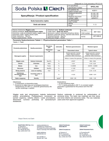 Załącznik nr 2 do procedury PO-ZJ-01 Nr specyfikacji Specyfikacja / Product specification Soda bezwodna ciężka Soda ash dense Nazwa chemiczna: Węglan sodu Nazwa handlowa: Soda kalcynowana ciężka, Synonimy: soda amoniakalna ciężka, węglan sodu bezwodny ciężki, węglan disodu ciężki, Wzór chemiczny : Na2CO3 Masa cząsteczkowa/: 105,99 SP/ZLJ/02 Specification number Nr wydania/ rok Edition number/ year Zastępuje dokument nr/ wyd. Replaces document number / editio Nr egzemplarza Copy number Strona Page Chemical name : Sodium carbonate Trade name : Soda ash dense, Synonyms: sodium carbonate anhydrous dense, disodium carbonate dense, calcined soda dense Chemical formula : Na2CO3 Molecular Weight : 105,99 4/2011 JS_001_SC JS_002_SC JS_003_SC wydanie 3 1/3 Nr CAS / 497-19-8 CAS number Nr EC 207-838-8 Parametry fizykochemiczne Tabela 1. / Physicochemical parameters Table 1. : Tabela 1./ Table Parametry jakościowe Wymagania ogólne Quality parameters General requirements Wyrażane jako Jednostka Expressed as Unit Guaranteed values Typical values - Drobne granulki o barwie białej z dopuszczalnym odcieniem lekko kremowym Drobne granulki o barwie białej z dopuszczalnym odcieniem lekko kremowym White or creamy fine granules White or creamy fine granules - Wartości gwarantowane Wartości typowe Węglan sodu Sodium Carbonate Na2CO3 % ≥ 99.5* 99,6 - 99,8 Chlorki Chlorides NaCl % ≤ 0,4 0,10 - 0,25 Żelazo Iron Fe2O3 % ≤ 0,0040 0,0010 – 0,0020 Siarczany Sulfates Na2SO4 % ≤ 0,02 < 0,02 Straty prażenia Loss on roasting H2O % ≤ 0,5 ** 0,10 – 0,18 Substancje nierozpuszczalne w H2O Insoluble matter in H2O % ≤ 0,02 0,006 – 0,01 Ciężar nasypowy Density kg/dm 0,95- 1,05 0,95 – 1,02 3 Objaśnienia: * - w przeliczeniu na bezwodną masę **- Suszenie do stałej masy we wzrastającej stopniowo temperaturze (70–300 °C ); parametr gwarantowany dla wyrobu wysłanego z zakładu. Explanations: *- on the anhydrous mass **-70 °C raising gradually to 300 °C, to constant weight; parameter is guaranteed for the product sent from the factory. Węglan sodu jest otrzymywany metodą karbonizacji solanki amoniakalnej. Podstawowymi surowcami są kamień wapienny, solanka (NaCl) i woda amoniakalna. Stosowane surowce pochodzą od sprawdzonych dostawców. Sodium carbonate is produced by carbonization of ammonia brine. The basic raw materials are lime stone and brine (NaCl) and ammonia water. The raw materials used come from approved suppliers. Załącznik nr 2 do procedury PO-ZJ-01 Nr specyfikacji SP/ZLJ/02 Specification number Nr wydania/ rok Edition number/ year Zastępuje dokument nr/ wyd. Replaces document number / editio Nr egzemplarza Copy number Strona Page Specyfikacja / Product specification Soda bezwodna ciężka Soda ash dense 4/2011 JS_001_SC JS_002_SC JS_003_SC wydanie 3 2/3 Analiza sitowa /Sieves analysis : (100g, 10 min, ampl. 2,5) Tabela 2./ Table 2. Parametry granulometryczne / Granulometric parameters Soda ciężka Soda ash dense Wymiar oczka sita Wartość gwarantowana Sieve mesh size typowa Value Zakres wartości typowych Range of typical values Specifications Typical mm % % % > 1,6 ≤1 0 0,0 - 0,5 > 1,0 ≤ 17 7 3 - 12 < 0,1 ≤5 1 0,2 - 3,8 Opakowanie: Packaging: - worki 25 i 30 kg na paletach - worki typu big bag 300-1000 kg - luzem - bags 25 and 30 kg on pallets - big bags 300-1000 kg - bulk Transport i przechowywanie: Węglan sodu należy przewozić czystymi, krytymi środkami transportu, zgodnie z obowiązującymi przepisami prawa. Ładunek powinien być rozłożony równomiernie w sposób zabezpieczający przed przemieszczaniem się opakowań oraz ich wzajemnym uszkodzeniem. Transport and storage: Sodium carbonate should be transported in clean, indoor means of transport, in accordance with applicable law. The load should be evenly distributed in a manner preventing movement of packages and their mutual damage. Uwaga: Soda jest substancją higroskopijną; produkt należy chronić przed zawilgoceniem i/lub zamoczeniem! Note: Soda is a hygroscopic substance; product should be protected against moisture and/or from getting wet. Produkt należy przechowywać w czystych pomieszczeniach o wilgotności 30-70 %, w szczelnie zamkniętych opakowaniach lub silosach magazynowych. Product should be stored in clean storage of moisture 3070 % in tightly closed or storage silos. Opakowania jednostkowe- worki lub big- bagi powinny być ułożone na paletach. Palety należy składować nie więcej niż w 2 warstwach. Package- bags or big bags should be storage on palettes. Palettes should be stored no more than 2 layers. W czasie przechowywania i transportu ciężki węglan sodu może tworzyć miękkie, łatwo rozkruszające się zbrylenia. During storage and transport of sodium carbonate dense may create soft, easily disintegrating lumps. Załącznik nr 2 do procedury PO-ZJ-01 Nr specyfikacji Specyfikacja / Product specification Soda bezwodna ciężka Soda ash dense Specification number Nr wydania/ rok Edition number/ year Zastępuje dokument nr/ wyd. Replaces document number / editio Nr egzemplarza Copy number Strona Page SP/ZLJ/02 4/2011 JS_001_SC JS_002_SC JS_003_SC wydanie 3 3/3 Informacje zawarte w niniejszym dokumencie stanowią ofertę handlową, są one oparte na naszej wiedzy i doświadczeniu. Możliwości zastosowania naszego produktu są liczne i poza naszą kontrolą. Kupujący ponosi wyłączną odpowiedzialność za kontrolę warunków, w których nasz produkt jest przechowywany i wykorzystywany na jego terytorium. The information contained in this document is an offer of trade. They are based on our knowledge and experience. As the potential uses of our product are many and outside of our control, the buyer bears sole responsibility for monitoring of storage and usage conditions in their territory. Termin ważności 1 rok od daty produkcji: Po upływie terminu ważności należy zbadać powtórnie parametry produktu, jeżeli one są zgodne z wymaganiami produkt mo