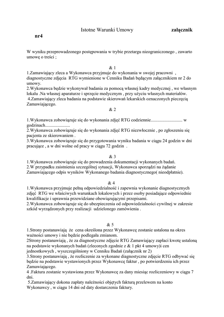Istotne Warunki Umowy załącznik nr4 W wyniku przeprowadzonego postępowania w trybie przetargu nieograniczonego , zawarto umowę o treści ; &1 1.Zamawiający zleca a Wykonawca przyjmuje do wykonania w swojej pracowni , diagnostyczne zdjęcia RTG wymienione w Cenniku Badań będącym załącznikiem nr 2 do umowy. 2.Wykonawca będzie wykonywał badania za pomocą własnej kadry medycznej , we własnym lokalu .Na własnej aparaturze i sprzęcie medycznym , przy uŜyciu własnych materiałów. 4.Zamawiający zleca badania na podstawie skierowań lekarskich oznaczonych pieczęcią Zamawiającego. &2 1.Wykonawca zobowiązuje się do wykonania zdjęć RTG codziennie............................ w godzinach...................... 2.Wykonawca zobowiązuje się do wykonania zdjęć RTG niezwłocznie , po zgłoszeniu się pacjenta ze skierowaniem . 3.Wykonawca zobowiązuje się do przygotowania wyniku badania w ciągu 24 godzin w dni pracujące , a w dni wolne od pracy w ciągu 72 godzin . &3 1.Wykonawca zobowiązuje się do prowadzenia dokumentacji wykonanych badań. 2.W przypadku zaistnienia szczególnej sytuacji, Wykonawca sporządzi na Ŝądanie Zamawiającego odpis wyników Wykonanego badania diagnostycznego( nieodpłatnie). &4 1.Wykonawca przyjmuje pełną odpowiedzialność i zapewnia wykonanie diagnostycznych zdjęć RTG we właściwych warunkach lokalowych i przez osoby posiadające odpowiednie kwalifikacje i uprawnia przewidziane obowiązującymi przepisami. 2.Wykonawca zobowiązuje się do ubezpieczenia od odpowiedzialności cywilnej w zakresie szkód wyrządzonych przy realizacji udzielonego zamówienia . &5 1.Strony postanawiają Ŝe cena określona przez Wykonawcę zostanie ustalona na okres waŜności umowy i nie będzie podlegała zmianom. 2Strony postanawiają , Ŝe za diagnostyczne zdjęcie RTG Zamawiający zapłaci kwotę ustaloną na podstawie wykonanych badań (zleconych zgodnie z & 1 pkt 4 umowy)i cen jednostkowych , wyszczególniony w Cenniku Badań (załącznik nr 2) 3.Strony postanawiają , Ŝe rozliczenie za wykonane diagnostyczne zdjęcie RTG odbywać się będzie na podstawie wystawionych przez Wykonawcę faktur , po potwierdzeniu ich przez Zamawiającego. 4 .Faktura zostanie wystawiona przez Wykonawcę za dany miesiąc rozliczeniowy w ciągu 7 dni. 5.Zamawiający dokona zapłaty naleŜności objętych fakturą przelewem na konto Wykonawcy , w ciągu 14 dni od daty dostarczenia faktury. &6 Umowa zostaje zawarta na okres 1 roku od daty podpisania umowy . &7 1. Zmiana postanowień niniejszej umowy wymaga formy pisemnej , pod rygorem niewaŜności . 2. Niedopuszczalne są takie zmiany postanowień zawartej umowy oraz wprowadzenie do nie nowych postanowień niekorzystnych dla Zamawiającego ,jeŜeli przy ich uwzględnieniu naleŜałoby zmienić treść oferty , na podstawie której dokonano wyrobu Wykonawcy , chyba Ŝe konieczność wprowadzenia takich zmian wynika z okoliczności ,których nie moŜna było przewidzieć w chwili zawarcia umowy. &8 Wykonawca wyraŜa zgodę do przeprowadzenia przez Narodowy Fundusz Zdrowia kontroli na zasadach określonych w ustawie zawartej z NFZ a Zamawiającym. Wykonawca zobowiązuje się dokonania rejestru w systemie SZOI jako podwykonawca umowy Zamawiającego z NFZ. &9 W sprawach spornych strony mogą zwrócić się do sądu powszechnego . & 10 1.Umowę sporządzono w dwóch jednobrzmiących egzemplarzach , po jednym dla kaŜdej ze stron . 2.Załączniki do umowy: a) załącznik nr 2 –cennik badań ZAMAWIAJĄCY WYKONAWCA
