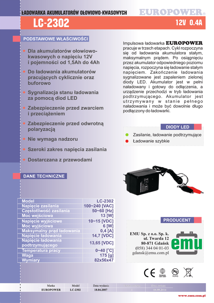 lADOWARKA AKUMULATORÓW OlOWIOWO-KWASOWYCH LC-2302 Dla akumulatorów ołowiowokwasowych o napięciu 12V i pojemności od 1,5Ah do 4Ah Do ładowania akumulatorów pracujących cyklicznie oraz buforowo Sygnalizacja stanu ładowania za pomocą diod LED Zabezpieczenie przed zwarciem i przeciążeniem EUROPOWER R 12V 0.4A Impulsowa ładowarka EUROPOWER pracuje w trzech etapach. Cykl rozpoczyna się od ładowania akumulatora stałym, maksymalnym prądem. Po osiągnięciu przez akumulator odpowiedniego poziomu napięcia, rozpoczyna się ładowanie stałym napięciem. Zakończenie ładowania sygnalizowane jest zapaleniem zielonej diody LED. Akumulator jest w pełni naładowany i gotowy do odłączenia, a urządzenie przechodzi w tryb ładowania podtrzymującego. Akumulator jest utrzymywany w stanie pełnego naładowania i może być dowolnie długo podłączony do ładowarki. Zabezpieczenie przed odwrotną polaryzacją Nie wymaga nadzoru Zasilanie, ładowanie podtrzymujące Ładowanie szybkie Szeroki zakres napięcia zasilania Dostarczana z przewodami Model LC-2302 Napięcie zasilania 100~240 [VAC] 50~60 [Hz] Częstotliwość zasilania 13 [W] Moc wejściowa Napięcie wyjściowe 10~15 [VDC] Moc wyjściowa 6 [W] 0,4 [A] Maksymalny prąd ładowania 14,7 [VDC] Napięcie ładowania Napięcie ładowania 13,65 [VDC] podtrzymującego o 0~40 [ C] Temperatura pracy 175 [g] Waga 82x56x47 Wymiary EMU Sp. z o.o. Sp. k. ul. Twarda 12 80-871 Gdańsk (058) 344 04 01-03 [email protected] Pb Q RoHS www.emu.com.pl
