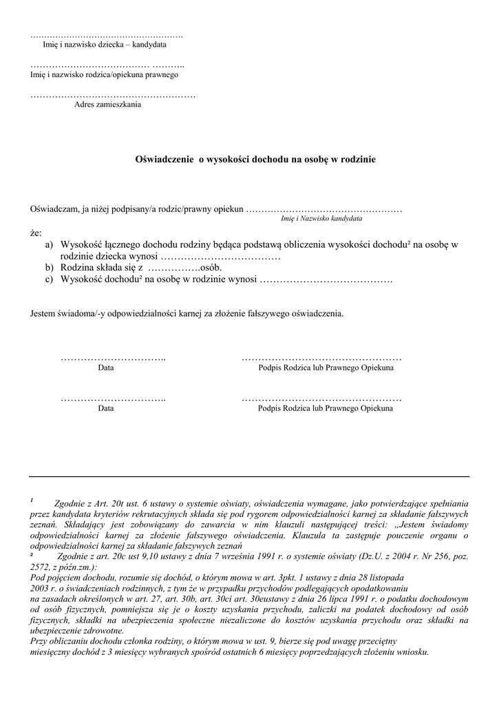 ………………………………………………. Imię i nazwisko dziecka – kandydata ………………………………… ……….. Imię i nazwisko rodzica/opiekuna prawnego ……………………………………………… Adres zamieszkania Oświadczenie o wysokości dochodu na osobę w rodzinie Oświadczam, ja niżej podpisany/a rodzic/prawny opiekun …………………………………………… Imię i Nazwisko kandydata że: a) Wysokość łącznego dochodu rodziny będąca podstawą obliczenia wysokości dochodu² na osobę w rodzinie dziecka wynosi ……………………………… b) Rodzina składa się z …………….osób. c) Wysokość dochodu² na osobę w rodzinie wynosi …………………………………. Jestem świadoma/-y odpowiedzialności karnej za złożenie fałszywego oświadczenia. ………………………….. Data ………………………….. Data ………………………………………… Podpis Rodzica lub Prawnego Opiekuna ………………………………………… Podpis Rodzica lub Prawnego Opiekuna Zgodnie z Art. 20t ust. 6 ustawy o systemie oświaty, oświadczenia wymagane, jako potwierdzające spełniania przez kandydata kryteriów rekrutacyjnych składa się pod rygorem odpowiedzialności karnej za składanie fałszywych zeznań. Składający jest zobowiązany do zawarcia w nim klauzuli następującej treści: „Jestem świadomy odpowiedzialności karnej za złożenie fałszywego oświadczenia. Klauzula ta zastępuje pouczenie organu o odpowiedzialności karnej za składanie fałszywych zeznań ² Zgodnie z art. 20c ust 9,10 ustawy z dnia 7 września 1991 r. o systemie oświaty (Dz.U. z 2004 r. Nr 256, poz. 2572, z późn.zm.): Pod pojęciem dochodu, rozumie się dochód, o którym mowa w art. 3pkt. 1 ustawy z dnia 28 listopada 2003 r. o świadczeniach rodzinnych, z tym że w przypadku przychodów podlegających opodatkowaniu na zasadach określonych w art. 27, art. 30b, art. 30ci art. 30eustawy z dnia 26 lipca 1991 r. o podatku dochodowym od osób fizycznych, pomniejsza się je o koszty uzyskania przychodu, zaliczki na podatek dochodowy od osób fizycznych, składki na ubezpieczenia społeczne niezaliczone do kosztów uzyskania przychodu oraz składki na ubezpieczenie zdrowotne. Przy obliczaniu dochodu członka rodziny, o którym mowa w ust. 9, bierze się pod uwagę przeciętny miesięczny dochód z 3 miesięcy wybranych spośród ostatnich 6 miesięcy poprzedzających złożeniu wniosku. 1
