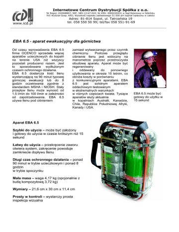 Internetowe Centrum Dystrybucji Spółka z o.o. Nr Regon 192068807; NIP: 585-13-67-424; Nr KRS: 0000220431 w Sąd Rejonowy w Gdańsku XVI Wydział Gosp. KRS; Wysokość kapitału zakładowego 51 000 pln kapitał wpłacony w całości www.icd.pl Adres: 81-814 Sopot, ul. Tatrzańska 19 tel. 058 550 50 99; tel/fax 058 551-91-69 EBA 6.5 - aparat ewakuacyjny dla górnictwa Od czasu wprowadzenia EBA 6.5 firma OCENCO sprzedała więcej aparatów ucieczkowych do kopalń na terenie USA niż wszyscy pozostali producenci razem. Jest to spowodowane wydłużonym czasem ochronnego działania. EBA 6.5 dostarcza ilość tlenu wystarczającą na 90 minut typowej górniczej ewakuacji lub do 8 godzin oczekiwania zgodnie z standardem MSHA i NIOSH. Stały przepływ tlenu może wynosić od 1,5 l/min do 100 l/min w zależności od zapotrzebowania. EBA 6.5 używa tlenu pod ciśnieniem zamiast wytwarzanego przez czynnik chemiczny. Podczas przeglądu ciśnienie tlenu jest widoczny na manometrze poprzez przeźroczysta obudowę aparatu. Aparat może być regenerowany i oddawany do ponownego użytkowania w okresie 15 letnim, co obniża koszty w porównaniu z konkurencyjnymi aparatami. EBA 6.5 jest solidnym aparatem oddechowym testowanym w ekstremalnych warunkach w różnych częściach świata. Tysiące aparatów służy aktualnie w kopalniach Australii, Kanadzie, Chile, Republice Południowej Afryki, Kanady i USA. Aparat EBA 6.5 Szybki do użycia – może być założony i gotowy do użycia w czasie krótszym niż 15 sekund Łatwy do użycia – przekręcenie zaworu otwiera system, zakręcenie powoduje zamkniecie dopływu tlenu Długi czas ochronnego działania – ponad 90 minut w trybie ucieczkowym i ponad 8 godzin w trybie spoczynku Mała masa – waga 4,17 kg (opcjonalnie z butlą kompozytową 3,72 kg) Wymiary – 21,6 cm x 30 cm x 11,4 cm Prosty w kontroli – wystarczy prosta inspekcja wizualna EBA 6.5 może być gotowy do użytku w 15 sekund Certyfikaty Numer certyfikatu Czas ochronnego działania CE 1742 TC-13F-104 GME 14/6/14/3 90 minut 60 Minut 90 Minut QMDA-6693 60 Minut 1889 100 Minut MDA BA 2742 100 Minut INSPEC zgodnie z EN13794 MSHA/NIOSH Republic of South Africa Australia - Queensland - New South Wales Czas ochronnego działania 90 minut Czas ochronnego działania w spoczynku 8 godzin Czas aktywacji Około 15 sekund Waga 4,17 kg cylinder aluminiowy 3,72 kg cylinder kompozytowy Waga bez obudowy 3,63 kg cylinder aluminiowy 3,17 kg cylinder kompozytowy Wymiary 21,6 cm x 30 cm x 11,4 cm Temperatura przechowywania -120C do +600C Pojemność tlenu w litrach 157 Możliwość regeneracji Tak Żywotność aparatu wg normy NIOSH 15 lat System podawania tlenu Sprężony tlen Zawór otwarcia i zamknięcia Przepływ stały/przepływ regulowany Ciśnienie w cylindrze 207 bar Środek do separacji CO2 Wodorotlenek litu Kontrola Optyczna EBA 6.5 - aparat ewakuacyjny o obiegu zamkniętym EBA 6.5 Zasada działania Tlen z worka oddechowego jest wdychany przez tubę zakończoną ustnikiem. Powietrze zużyte jest wydychane przez ustnik prosto do separatora dwutlenku węgla. Następnie przechodzi do worka oddechowego gdzie jest mieszane z tlenem z cylindra.