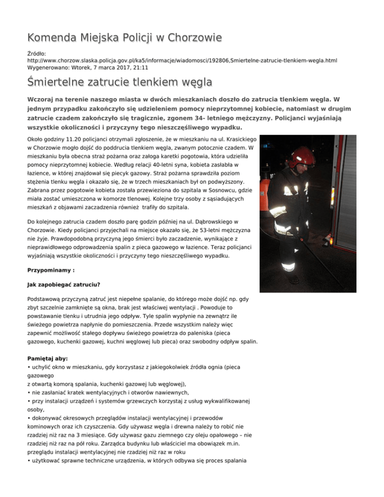 Komenda Miejska Policji w Chorzowie Źródło: http://www.chorzow.slaska.policja.gov.pl/ka5/informacje/wiadomosci/192806,Smiertelne-zatrucie-tlenkiem-wegla.html Wygenerowano: Wtorek, 7 marca 2017, 21:11 Śmiertelne zatrucie tlenkiem węgla Wczoraj na terenie naszego miasta w dwóch mieszkaniach doszło do zatrucia tlenkiem węgla. W jednym przypadku zakończyło się udzieleniem pomocy nieprzytomnej kobiecie, natomiast w drugim zatrucie czadem zakończyło się tragicznie, zgonem 34- letniego mężczyzny. Policjanci wyjaśniają wszystkie okoliczności i przyczyny tego nieszczęśliwego wypadku. Około godziny 11.20 policjanci otrzymali zgłoszenie, że w mieszkaniu na ul. Krasickiego w Chorzowie mogło dojść do poddrucia tlenkiem węgla, zwanym potocznie czadem. W mieszkaniu była obecna straż pożarna oraz załoga karetki pogotowia, która udzieliła pomocy nieprzytomnej kobiecie. Według relacji 40-letni syna, kobieta zasłabła w łazience, w której znajdował się piecyk gazowy. Straż pożarna sprawdziła poziom stężenia tlenku węgla i okazało się, że w trzech mieszkaniach był on podwyższony. Zabrana przez pogotowie kobieta została przewieziona do szpitala w Sosnowcu, gdzie miała zostać umieszczona w komorze tlenowej. Kolejne trzy osoby z sąsiadujących mieszkań z objawami zaczadzenia również trafiły do szpitala. Do kolejnego zatrucia czadem doszło parę godzin później na ul. Dąbrowskiego w Chorzowie. Kiedy policjanci przyjechali na miejsce okazało się, że 53-letni mężczyzna nie żyje. Prawdopodobną przyczyną jego śmierci było zaczadzenie, wynikające z nieprawidłowego odprowadzenia spalin z pieca gazowego w łazience. Teraz policjanci wyjaśniają wszystkie okoliczności i przyczyny tego nieszczęśliwego wypadku. Przypominamy : Jak zapobiegać zatruciu? Podstawową przyczyną zatruć jest niepełne spalanie, do którego może dojść np. gdy zbyt szczelnie zamknięte są okna, brak jest właściwej wentylacji . Powoduje to powstawanie tlenku i utrudnia jego odpływ. Tyle spalin wypłynie na zewnątrz ile świeżego powietrza napłynie do pomieszczenia. Przede wszystkim należy więc zapewnić możliwość stałego dopływu świeżego powietrza do paleniska (pieca gazowego, kuchenki gazowej, kuchni węglowej lub pieca) oraz swobodny odpływ spalin. Pamiętaj aby: • uchylić okno w mieszkaniu, gdy korzystasz z jakiegokolwiek źródła ognia (pieca gazowego z otwartą komorą spalania, kuchenki gazowej lub węglowej), • nie zasłaniać kratek wentylacyjnych i otworów nawiewnych, • przy instalacji urządzeń i systemów grzewczych korzystaj z usług wykwalifikowanej osoby, • dokonywać okresowych przeglądów instalacji wentylacyjnej i przewodów kominowych oraz ich czyszczenia. Gdy używasz węgla i drewna należy to robić nie rzadziej niż raz na 3 miesiące. Gdy używasz gazu ziemnego czy oleju opałowego – nie rzadziej niż raz na pół roku. Zarządca budynku lub właściciel ma obowiązek m.in. przeglądu instalacji wentylacyjnej nie rzadziej niż raz w roku • użytkować sprawne techniczne urządzenia, w których odbywa się proces spalania zgodnie z instrukcją producenta: kontrolować stan techniczny urządzeń grzewczych, • stosować urządzenia posiadające stosowne dopuszczenia w zakresie wprowadzenia do obrotu; w sytuacjach wątpliwych należy żądać okazania wystawionej przez producenta lub importera urządzenia tzw. deklaracji zgodności, tj. dokumentu zawierającego informacje o specyfikacji technicznej oraz przeznaczeniu i zakresie stosowania danego urządzenia, • w przypadku wymiany okien na nowe, sprawdzić poprawność działania wentylacji, ponieważ nowe okna są najczęściej o wiele bardziej szczelne w stosunku do wcześniej stosowanych w budynku i mogą pogarszać wentylację, • systematycznie sprawdzać ciąg powietrza, np. poprzez przykładanie kartki papieru do otworu, bądź kratki wentylacyjnej; jeśli nic nie zakłóca wentylacji, kartka powinna przywrzeć do wyżej wspomnianego otworu lub kratki, • często wietrzyć pomieszczenie, w których odbywa się proces spalania (kuchnie, łazienki wyposażone w termy gazowe), a najlepiej zapewnić, nawet niewielkie, rozszczelnienie okien. • rozmieścić czujniki tlenku węgla w części domu, w której sypia twoja rodzina. Dla zwiększenia bezpieczeństwa, dodatkowe czujniki warto umieścić w każdym pomieszczeniu, • nie spalaj węgla drzewnego w domu, garażu, na zamkniętej werandzie itp., jeżeli pomieszczenia te nie mają odpowiedniej wentylacji, • nie zostawiaj samochodu w garażu na zapalonym silniku, nawet jeżeli drzwi do garażu pozostają otwarte • nie bagatelizuj objawów duszności, bólów i zawrotów głowy, nudności, wymiotów, oszołomienia, osłabienia, przyspieszenia czynności serca i oddychania, gdyż mogą być sygnałem, że ulegasz zatruciu czadem; w takiej sytuacji należy natychmiast przewietrzyć pomieszczenie, w którym się znajdujemy i zasięgnąć porady lekarskiej. Jakie są objawy zatrucia tlenkiem węgla? - ból głowy, - zawroty głowy, - ogólne zmęczenie, - duszność, - trudnościami z oddychaniem, oddech przyspieszony, nieregularny - senność, - nudności. Osłabienie i znużenie, które czuje zaczadzony, oraz zaburzenia orientacji i zdolności oceny zagrożenia powodują, że jest on całkowicie bierny (nie ucieka z miejsca nagromadzenia trucizny), traci przytomność i – jeśli nikt nie przyjdzie mu z pomocą – umiera. Jak pomóc przy zatruciu tlenkiem węgla? • należy natychmiast zapewnić dopływ świeżego, czystego powietrza, • jak najszybciej wynieść osobę poszkodowaną w bezpieczne miejsce, na świeże powietrze, • rozluźnić poszkodowanemu ubranie – rozpiąć pasek, guziki, ale nie rozbierać go, gdyż nie można doprowadzić do jego przemarznięcia • wezwać służby ratownicze (pogotowie ratunkowe – tel. 999, straż pożarna – tel. 998 lub 112), Jeśli po wyniesieniu na 