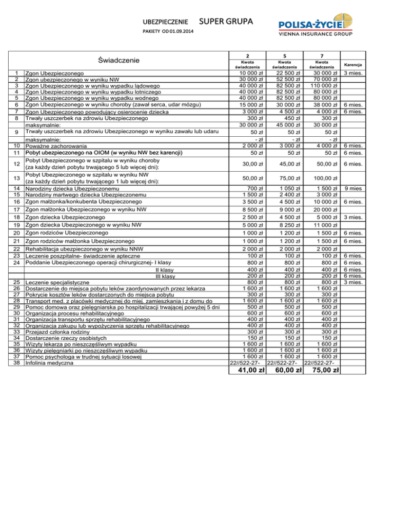 UBEZPIECZENIE SUPER GRUPA PAKIETY OD 01.09.2014 Świadczenie 1 2 3 4 5 6 7 8 9 Zgon Ubezpieczonego Zgon ubezpieczonego w wyniku NW Zgon Ubezpieczonego w wyniku wypadku lądowego Zgon Ubezpieczonego w wyniku wypadku lotniczego Zgon Ubezpieczonego w wyniku wypadku wodnego Zgon Ubezpieczonego w wyniku choroby (zawał serca, udar mózgu) Zgon Ubezpieczonego powodujący osierocenie dziecka Trwały uszczerbek na zdrowiu Ubezpieczonego maksymalnie: Trwały uszczerbek na zdrowiu Ubezpieczonego w wyniku zawału lub udaru mózgu maksymalnie: 10 Poważne zachorowania 11 Pobyt ubezpieczonego na OIOM (w wyniku NW bez karencji) Pobyt Ubezpieczonego w szpitalu w wyniku choroby 12 (za każdy dzień pobytu trwającego 5 lub więcej dni): Pobyt Ubezpieczonego w szpitalu w wyniku NW 13 (za każdy dzień pobytu trwającego 1 lub więcej dni): 14 Narodziny dziecka Ubezpieczonemu 15 Narodziny martwego dziecka Ubezpieczonemu 16 Zgon małżonka/konkubenta Ubezpieczonego 17 Zgon małżonka Ubezpieczonego w wyniku NW świadczenia łącznie ze świadczeniem nr 14) Zgon dziecka Ubezpieczonego 18 (wysokość 19 Zgon dziecka Ubezpieczonego w wyniku NW 20 Zgon rodziców Ubezpieczonego 21 22 23 24 25 26 27 28 29 30 31 32 33 34 35 36 37 38 Zgon rodziców małżonka Ubezpieczonego Rehabilitacja ubezpieczonego w wyniku NNW Leczenie poszpitalne- świadczenie apteczne Poddanie Ubezpieczonego operacji chirurgicznej- I klasy II klasy III klasy Leczenie specjalistyczne Dostarczenie do miejsca pobytu leków zaordynowanych przez lekarza Pokrycie kosztów leków dostarczonych do miejsca pobytu Transport med. z placówki medycznej do miej. zamieszkania i z domu do Pomoc domowa oraz pielęgniarska po hospitalizacji trwającej powyżej 5 dni Organizacja procesu rehabilitacyjnego Organizacja transportu sprzętu rehabilitacyjnego Organizacja zakupu lub wypożyczenia sprzętu rehabilitacyjnego Przejazd członka rodziny Dostarczenie rzeczy osobistych Wizyty lekarza po nieszczęśliwym wypadku Wizyty pielęgniarki po nieszczęśliwym wypadku Pomoc psychologa w trudnej sytuacji losowej Infolinia medyczna 2 5 7 Kwota świadczenia Kwota świadczenia Kwota świadczenia Karencja 10 000 zł 30 000 zł 40 000 zł 40 000 zł 40 000 zł 15 000 zł 3 000 zł 300 zł 30 000 zł 50 zł - zł 2 000 zł 50 zł 22 500 zł 52 500 zł 82 500 zł 82 500 zł 82 500 zł 30 000 zł 4 500 zł 450 zł 45 000 zł 50 zł - zł 3 000 zł 50 zł 30 000 zł 70 000 zł 110 000 zł 80 000 zł 80 000 zł 38 000 zł 4 000 zł 300 zł 30 000 zł 50 zł - zł 4 000 zł 50 zł 3 mies. 30,00 zł 45,00 zł 50,00 zł 6 mies. 50,00 zł 75,00 zł 100,00 zł 700 zł 1 500 zł 3 500 zł 8 500 zł 2 500 zł 5 000 zł 1 000 zł 1 050 zł 2 400 zł 4 500 zł 9 000 zł 4 500 zł 8 250 zł 1 200 zł 1 500 zł 3 000 zł 10 000 zł 20 000 zł 5 000 zł 11 000 zł 1 500 zł 1 000 zł 1 200 zł 1 500 zł 2 000 zł 2 000 zł 2 000 zł 100 zł 100 zł 100 zł 800 zł 800 zł 800 zł 400 zł 400 zł 400 zł 200 zł 200 zł 200 zł 800 zł 800 zł 800 zł 1 600 zł 1 600 zł 1 600 zł 300 zł 300 zł 300 zł 1 600 zł 1 600 zł 1 600 zł 500 zł 500 zł 500 zł 600 zł 600 zł 600 zł 400 zł 400 zł 400 zł 400 zł 400 zł 400 zł 300 zł 300 zł 300 zł 150 zł 150 zł 150 zł 1 600 zł 1 600 zł 1 600 zł 1 600 zł 1 600 zł 1 600 zł 1 600 zł 1 600 zł 1 600 zł 22//522-27- 22//522-27- 22//522-27- 41,00 zł 60,00 zł 75,00 zł 6 mies. 6 mies. 6 mies. 6 mies. 9 mies 6 mies. 3 mies. 6 mies. 6 mies. 6 mies. 6 mies. 6 mies. 6 mies. 3 mies.