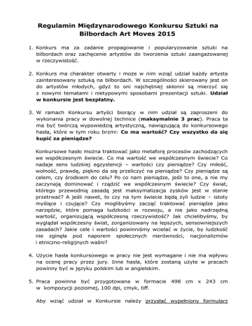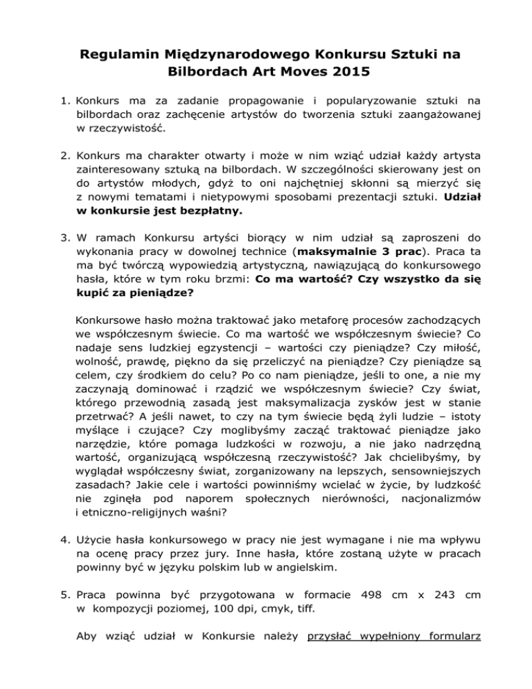 Regulamin Międzynarodowego Konkursu Sztuki na Bilbordach Art Moves 2015 1. Konkurs ma za zadanie propagowanie i popularyzowanie sztuki na bilbordach oraz zachęcenie artystów do tworzenia sztuki zaangażowanej w rzeczywistość. 2. Konkurs ma charakter otwarty i może w nim wziąć udział każdy artysta zainteresowany sztuką na bilbordach. W szczególności skierowany jest on do artystów młodych, gdyż to oni najchętniej skłonni są mierzyć się z nowymi tematami i nietypowymi sposobami prezentacji sztuki. Udział w konkursie jest bezpłatny. 3. W ramach Konkursu artyści biorący w nim udział są zaproszeni do wykonania pracy w dowolnej technice (maksymalnie 3 prac). Praca ta ma być twórczą wypowiedzią artystyczną, nawiązującą do konkursowego hasła, które w tym roku brzmi: Co ma wartość? Czy wszystko da się kupić za pieniądze? Konkursowe hasło można traktować jako metaforę procesów zachodzących we współczesnym świecie. Co ma wartość we współczesnym świecie? Co nadaje sens ludzkiej egzystencji – wartości czy pieniądze? Czy miłość, wolność, prawdę, piękno da się przeliczyć na pieniądze? Czy pieniądze są celem, czy środkiem do celu? Po co nam pieniądze, jeśli to one, a nie my zaczynają dominować i rządzić we współczesnym świecie? Czy świat, którego przewodnią zasadą jest maksymalizacja zysków jest w stanie przetrwać? A jeśli nawet, to czy na tym świecie będą żyli ludzie – istoty myślące i czujące? Czy moglibyśmy zacząć traktować pieniądze jako narzędzie, które pomaga ludzkości w rozwoju, a nie jako nadrzędną wartość, organizującą współczesną rzeczywistość? Jak chcielibyśmy, by wyglądał współczesny świat, zorganizowany na lepszych, sensowniejszych zasadach? Jakie cele i wartości powinniśmy wcielać w życie, by ludzkość nie zginęła pod naporem społecznych nierówności, nacjonalizmów i etniczno-religijnych waśni? 4. Użycie hasła konkursowego w pracy nie jest wymagane i nie ma wpływu na ocenę pracy przez jury. Inne hasła, które zostaną użyte w pracach powinny być w języku polskim lub w angielskim. 5. Praca powinna być przygotowana w formacie 498 cm x 243 cm w kompozycji poziomej, 100 dpi, cmyk, tiff. Aby wziąć udział w Konkursie należy przysłać wypełniony formularz zgłoszeniowy oraz załączyć wglądówkę zgłaszanej pracy o wymiarach 30 cm x 14,6 cm, 72 dpi, jpg. Każdy plik jpg należy nazwać imieniem i nazwiskiem autora. Jeśli zgłasza się więcej niż jedną pracę, to dodatkowo należy wstawić cyfrę od 1 do 3, np. jan_kowalski_1 itd. Uwaga! NIE NALEŻY teraz załączać plików gotowych (ciężkich) prac. Po werdykcie jury, organizatorzy Konkursu skontaktują się z autorami wybranych prac w celu przesłania ich do druku i prezentacji na bilbordach. 6. Oprócz indywidualnych artystów w konkursie mogą brać również udział grupy artystyczne. W wypadku prac, których autorem jest więcej niż jedna osoba, na karcie zgłoszeniowej należy wpisać nazwiska wszystkich autorów pracy, a dane kontaktowe tylko tej osoby, która będzie reprezentować grupę w kontaktach z organizatorami Konkursu. 7. Prace można nadsyłać do dnia 22.07.2015, do godz. 24:00 drogą elektroniczną na adres: artmoves(at)tlen.pl 8. Spośród nadesłanych zgłoszeń jury wybierze 10 najciekawszych prac, które zostaną zaprezentowane na bilbordach w ramach Festiwalu Art Moves 2015 w przestrzeni miejskiej Torunia we wrześniu/październiku 2015. Najlepsza praca wybrana przez jury otrzyma Główną Nagrodę w kwocie 5000 PLN. Laureat zapłaci zryczałtowany podatek od przyznanej nagrody. 9. Wyboru prac dokona międzynarodowe jury, składające się z artystów i kuratorów – autorytetów specjalizujących się w sztuce publicznej. 10. Organizatorzy Konkursu zastrzegają sobie prawo do zaprezentowania na bilbordach również prac, które nie zostały wybrane przez jury. 11. Artysta zgłaszając prace na Konkurs wyraża automatycznie zgodę na nieodpłatną prezentację swojej pracy w ramach Festiwalu oraz wykorzystywanie pracy w materiałach informacyjno-promocyjnych Festiwalu: w prasie, na stronie internetowej, w materiałach własnych Festiwalu itp.