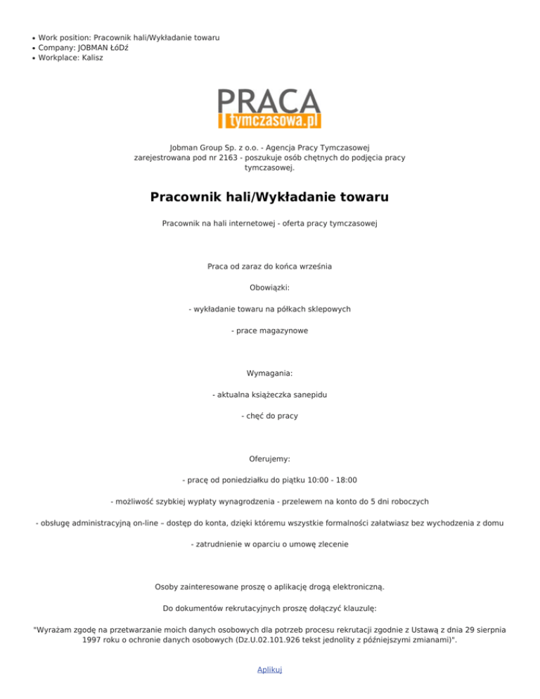 ● ● ● Work position: Pracownik hali/Wykładanie towaru Company: JOBMAN ŁóDź Workplace: Kalisz Jobman Group Sp. z o.o. - Agencja Pracy Tymczasowej zarejestrowana pod nr 2163 - poszukuje osób chętnych do podjęcia pracy tymczasowej. Pracownik hali/Wykładanie towaru Pracownik na hali internetowej - oferta pracy tymczasowej Praca od zaraz do końca września Obowiązki: - wykładanie towaru na półkach sklepowych - prace magazynowe Wymagania: - aktualna książeczka sanepidu - chęć do pracy Oferujemy: - pracę od poniedziałku do piątku 10:00 - 18:00 - możliwość szybkiej wypłaty wynagrodzenia - przelewem na konto do 5 dni roboczych - obsługę administracyjną on-line – dostęp do konta, dzięki któremu wszystkie formalności załatwiasz bez wychodzenia z domu - zatrudnienie w oparciu o umowę zlecenie Osoby zainteresowane proszę o aplikację drogą elektroniczną. Do dokumentów rekrutacyjnych proszę dołączyć klauzulę: "Wyrażam zgodę na przetwarzanie moich danych osobowych dla potrzeb procesu rekrutacji zgodnie z Ustawą z dnia 29 sierpnia 1997 roku o ochronie danych osobowych (Dz.U.02.101.926 tekst jednolity z późniejszymi zmianami)". Aplikuj Dane kontaktowe: JOBMAN ŁóDź Send Save Print Tweet
