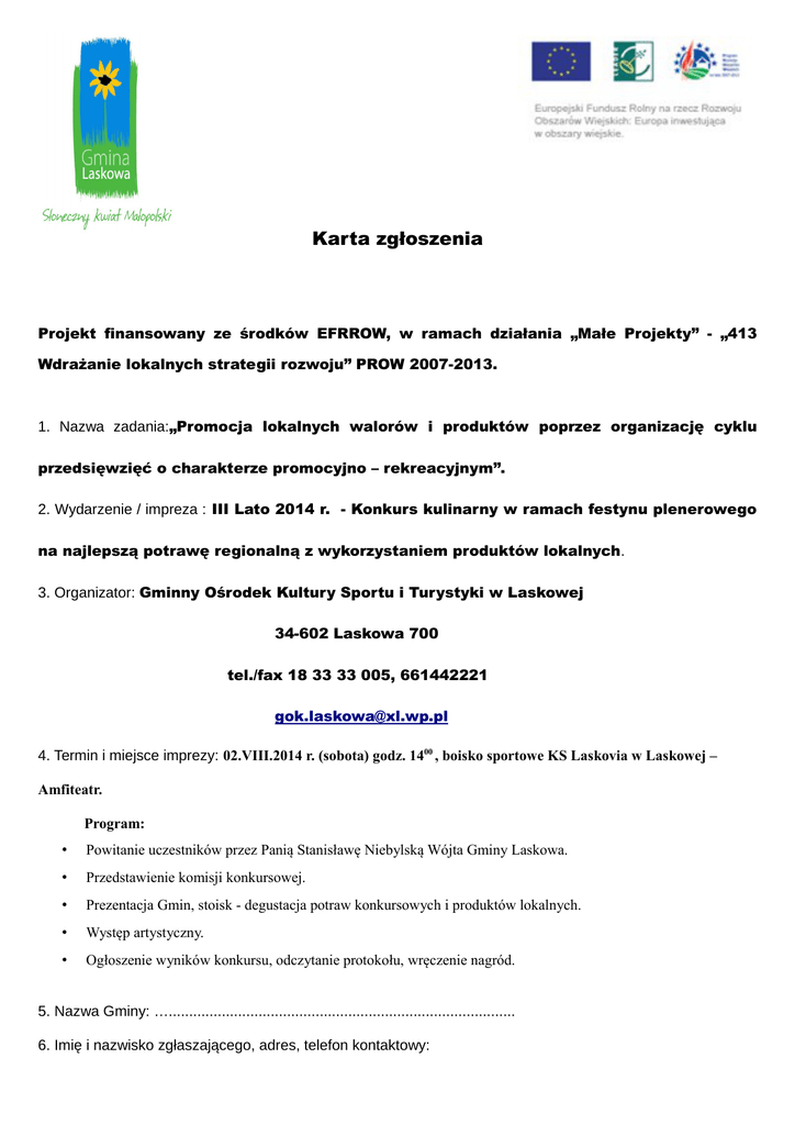 Karta zgłoszenia Projekt finansowany ze środków EFRROW, w ramach działania „Małe Projekty” - „413 Wdrażanie lokalnych strategii rozwoju” PROW 2007-2013. 1. Nazwa zadania:„Promocja lokalnych walorów i produktów poprzez organizację cyklu przedsięwzięć o charakterze promocyjno – rekreacyjnym”. 2. Wydarzenie / impreza : III Lato 2014 r. - Konkurs kulinarny w ramach festynu plenerowego na najlepszą potrawę regionalną z wykorzystaniem produktów lokalnych. 3. Organizator: Gminny Ośrodek Kultury Sportu i Turystyki w Laskowej 34-602 Laskowa 700 tel./fax 18 33 33 005, 661442221 [email protected] 4. Termin i miejsce imprezy: 02.VIII.2014 r. (sobota) godz. 1400 , boisko sportowe KS Laskovia w Laskowej – Amfiteatr. Program: • Powitanie uczestników przez Panią Stanisławę Niebylską Wójta Gminy Laskowa. • Przedstawienie komisji konkursowej. • Prezentacja Gmin, stoisk - degustacja potraw konkursowych i produktów lokalnych. • Występ artystyczny. • Ogłoszenie wyników konkursu, odczytanie protokołu, wręczenie nagród. 5. Nazwa Gminy: …..................................................................................... 6. Imię i nazwisko zgłaszającego, adres, telefon kontaktowy: …............................................................................................................................................................................ .. 7. Nazwa wystawcy, producenta, przedsiębiorstwa, gospodarstwa: …............................................................................................................................................................................ . 8. Nazwa potrawy: …............................................................................................................................................................................ .. 9. Jakie lokalne produkty zawiera potrawa: …............................................................................................................................................................................ ................................................................................................................................................................................ ............................................................................................. 10. Krótki opis wykonania: ................................................................................................................................................................................ ................................................................................................................................................................................ ................................................................................................................................................................................ ................................................................................................................................................................................ ................................................................................................................................................................................ ................................................................................................................................................................................ ................................................................................................................................................................................ ................................................................................................................................................................................ ................................................................................................................................................................................ ................................................................................................................................................................................ ................................................................................................................................................................................ ................................................................................................................................................................................ ...................................................................................................................... 11. Termin przesłania zgłoszenia: do dnia 24.VII.2014 r. …......................................................... …..................................................................... Miejscowość, data Pieczątka, podpis zgłaszającego