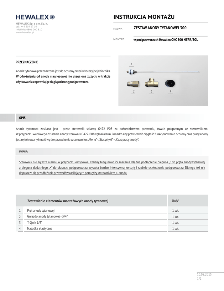 INSTRUKCJA MONTAŻU HEWALEX Sp. z o.o. Sp. k. tel.: +48 214 17 10 infolinia: 0801 000 810 www.hewalex.pl NAZWA ZESTAW ANODY TYTANOWEJ 300 MONTAŻ w podgrzewaczach Hewalex OKC 300 NTRR/SOL PRZEZNACZENIE 1 Anoda tytanowa przeznaczona jest do ochrony przeciwkorozyjnej zbiornika. W odróżnieniu od anody magnezowej nie ulega ona zużyciu w trakcie użytkowania zapewniając ciągłą ochronę podgrzewacza. 2 3 4 OPIS Anoda tytanowa zasilana jest przez sterownik solarny G422 P08 za pośrednictwem przewodu, trwale połączonym ze sterownikiem. W przypadku wadliwego działania anody sterownik G422-P08 zgłosi alarm. Ponadto aby potwierdzić ciągłość funkcjonowanie ochrony czas pracy anody jest rejestrowany i możliwy do sprawdzenia w serowniku: „Menu” -„Statystyki” –„Czas pracy anody”. UWAGA: Sterownik nie zgłasza alarmu w przypadku omyłkowej zmiany biegunowości zasilania. Błędne podłączenie bieguna „-” do pręta anody tytanowej a bieguna dodatniego „+” do płaszcza podgrzewacza, wywoła bardzo intensywną korozję i szybkie uszkodzenia podgrzewacza. Dlatego też nie dopuszcza się przedłużania przewodów zasilających pomiędzy sterownikiem, a anodą. Zestawienie elementów montażowych anody tytanowej ilość 1 Pręt anody tytanowej 1 szt. 2 Gniazdo anody tytanowej - 3/4” 1 szt. 3 Trójnik 3/4” 1 szt. 4 Nasadka elastyczna 1 szt. 10.08.2015 1/2 1 Kolejne czynności montażu anody tytanowej: A Przed przystąpieniem do montażu anody należy zdjąć znajdujący się na niej biały papier ochronny. Nie usunięcie papieru może powodować obniżenie skuteczności ochronnego działania anody i zgłaszania alarmu przez sterownik. C Do złącza elektrycznego anody podłączyć płaską końcówkę znajdującą się na końcu przewodu zasilającego wychodzącego ze sterownika. E Odkręcić nakrętkę znajdująca się na śrubie połączonej z płaszczem podgrzewacza i zamontować na niej drugą końcówkę przewodu elektrycznego. Po zamontowaniu nakrętkę z powrotem dokręcić. B W króciec cyrkulacji wkręcić gniazdo anody tytanowej 3/4” (2), a następnie wkręcić w niego anodę tytanową (1) dokręcając do wyczucia lekkiego oporu. Zbyt mocne dokręcanie może spowodować uszkodzenie sześciokąta teflonowej oprawy pręta anody. D Z góry zbiornika zdemontować czarną plastikową pokrywę oraz wyjąć znajdującą się pod nim styropianową wkładkę izolacyjną F Założyć zdemontowane wcześniej elementy z podgrzewacza oraz nałożyć nasadkę elastyczną na końcówkę anody. Należy zwrócić szczególną uwagę aby nie uszkodzić przewodu elektrycznego. 10.08.2015 2/2 cd. Kolejne czynności montażu anody tytanowej : G UWAGA: Jeżeli montaż anody tytanowej zostanie wykonany niezgodnie z zaleceniami producenta, w wyniku którego podgrzewacz ulegnie awarii spowodowanej korozją, reklamacja taka nie zostanie uwzględniona. Wszelkie zmiany w przewodach zasilających jak np. ich przedłużanie jest niedozwolone i skutkować będzie utratą gwarancji. Uwaga: W przypadku potrzeby wykorzystania króćca do cyrkulacji, należy pomiędzy anodę tytanową, a gniazdo anody tytanowej 3/4” wstawić trójnik 3/4” (3) zgodnie z poniższym zdjęciem. Reszta czynności montażowych pozostaje taka jak w opisie powyżej. 10.08.2015 3/2