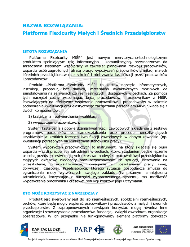 NAZWA ROZWIĄZANIA: Platforma Flexicurity Małych i Średnich Przedsiębiorstw ISTOTA ROZWIĄZANIA Platforma Flexicurity MiŚP” jest nowym merytoryczno-technologicznym produktem spełniającym rolę informacyjno - komunikacyjną, przeznaczonym do zarządzania systemem współpracy w zakresie: planowania rozwoju pracowników, wsparcia osób zagrożonych utratą pracy, wypożyczeń pracowników z mikro, małych i średnich przedsiębiorstw oraz szkoleń i zdobywania kwalifikacji przez pracowników i pracodawców. Produkt ,,Platforma Flexicurity MiŚP” to zestaw narzędzi informatycznych, instrukcji, procedur, baz danych, materiałów dydaktycznych możliwych do zainstalowania na serwerach izb rzemieślniczych i dostępnych w cechach. Za pomocą tych narzędzi cechy wspomagać będą pracodawców i pracowników z MiŚP. Pozwalających na efektywne wspieranie pracowników i pracodawców w zakresie podnoszenia kwalifikacji oraz elastycznego zarządzania personelem MiŚP. Składa się z dwóch komponentów: 1) kształcenia i potwierdzania kwalifikacji, 2) wypożyczeń pracowniczych. System kształcenia i potwierdzania kwalifikacji zawodowych składa się z zestawu programów, poradników do samokształcenia oraz procedur umożliwiających uzyskiwanie w krótkich formach kwalifikacji zawodowych w danym zawodzie (np. kwalifikacji potrzebnych na konkretnym stanowisku pracy). System wypożyczeń pracowniczych to instrument, na który składają się biura wsparcia – czyli pracownicy zatrudnieni w cechach, których zadaniem będzie łączenie ze sobą przedsiębiorstw mających okresowe nadwyżki pracowników i przedsiębiorstw mających okresowe niedobory oraz rozpoznawanie ich sytuacji, kierowanie na przeszkolenie, przekwalifikowanie, pomaganie w poszukiwaniu pracy innej, dorywczej, czasowej. Przedsiębiorca, którego sytuacja gospodarcza zmusza do ograniczenia mocy wytwórczych swojego zakładu (tym samym zmniejszenia zatrudnienia), korzystając z narzędzi wypracowanego systemu, ma możliwość wypożyczenia pracownika i czasowej redukcji kosztów jego utrzymania. KTO MOŻE KORZYSTAĆ Z NARZĘDZIA ? Produkt jest skierowany jest do izb rzemieślniczych, spółdzielni rzemieślniczych, cechów, które będą mogły wspierać pracowników i pracodawców z małych i średnich przedsiębiorstw. Z zaproponowanych rozwiązań korzystać mogą również inne organizacje i stowarzyszenia pracodawców, fundacje, związki zawodowe, organizacje pozarządowe. W ich przypadku nie funkcjonowałby element platformy dotyczący Projekt współfinansowany ze środków Unii Europejskiej w ramach Europejskiego Funduszu Społecznego egzaminów sprawdzających, gdyż komisje egzaminacyjne funkcjonować mogą wyłącznie w izbach rzemieślniczych. KORZYŚCI Z ZASTOSOWANIA NARZĘDZIA: 1. Efektywne uzyskiwanie pracodawców kwalifikacji dostosowanych do potrzeb Umiejętności kształtowane są na części praktycznej kursu. Uczestnik zdobywa je w procesie pracy, na rzeczywistych stanowiskach pracy, pod kierunkiem instruktora praktycznej nauki zawodu. Przewidziane w proponowanym systemie kształcenia i potwierdzania kwalifikacji składowych kursy są krótkie, oparte na indywidualnych programach i dostosowane do potrzeb osób dorosłych (pracowników małych średnich przedsiębiorstw, w szczególności zakładów rzemieślniczych). 2. Wzrost poziomu kwalifikacji pracowników z małych i średnich przedsiębiorstw Pracownicy będą uzyskiwać lub podwyższać kwalifikacje, zmniejszy się zagrożenie utratą pracy, wzrosną ich szanse na utrzymanie zatrudnienia. Pracodawcy podniosą kwalifikacje swoich pracowników, pozyskają pracowników o odpowiednich kwalifikacjach. 3. Utrzymanie wykwalifikowanych dekoniunktury pracowników w okresie Zamiast zwalniania dobrych pracowników w okresie dekoniunktury pracodawca może skorzystać z czasowego wypożyczenia innemu pracodawcy. W takim przypadku: – nie traci dobrych pracowników, – podnosi swoją wiarygodność firmy w oczach innych pracowników, – nie traci rezerw finansowych na utrzymywanie przerostu zatrudnienia – spadają koszty produkcji i usług, – pracownik u wypożyczającego poznaje inne technologie i organizację pracy przez co może wykorzystać tę wiedzę w celu usprawnienia pracy w zakładzie macierzystym. 4. Szybki sposób pozyskania wykwalifikowanego wykonania czasowego zlecenia pracownika do Zamiast poszukiwania pracownika w tradycyjny sposób, sprawdzania jego kwalifikacji i przeszkolenia pracodawca może wypożyczyć pracownika od innego pracodawcy. W takim przypadku pracodawca otrzymuje pracownika: – wykwalifikowanego, – z dobrymi referencjami, godnego zaufania, – przyzwyczajonego do pracy w rzemiośle, – znającego proces technologiczny jaki stosowany jest poprzedniego pracodawcy (może wykorzystać tę wiedzę w usprawnieniu produkcji u wypożyczającego). Projekt współfinansowany ze środków Unii Europejskiej w ramach Europejskiego Funduszu Społecznego 5. Poprawa efektywności małych i średnich przedsiębiorstw Wdrożenie systemu wypożyczeń pracowniczych wpłynie na ustabilizowanie rynku pracy oraz poprawi efektywność małych i średnich przedsiębiorstw w regionie. Na stabilnym rynku fluktuacja kadr będzie ograniczona, a przedsiębiorcy będą mogli podjąć działania związane z rozwojem swojej działalności. Poprzez utrzymanie doświadczonych pracowników zakładom łatwiej będzie utrzymać odpowiednią jakość świadczonych usług i wytwarzanych produktów. JAK POSŁUGIWAĆ SIĘ NARZĘDZIEM? Produkt projektu Platforma Flexicurity zawiera narzędzie informatyczne: pomagające na kojarzenie osób poszukujących pracę z pracodawcami, przechowujące poradniki wspierające osoby, które chcą się dokształcać; wskazuje pracodawców chcących wypożyczyć pracowników ze swojej firmy lub do swojej firmy; pomaga znaleźć pracodawcę, który jest w stanie zorganizować kształcenie praktyczne udostępnia mistrzom - i