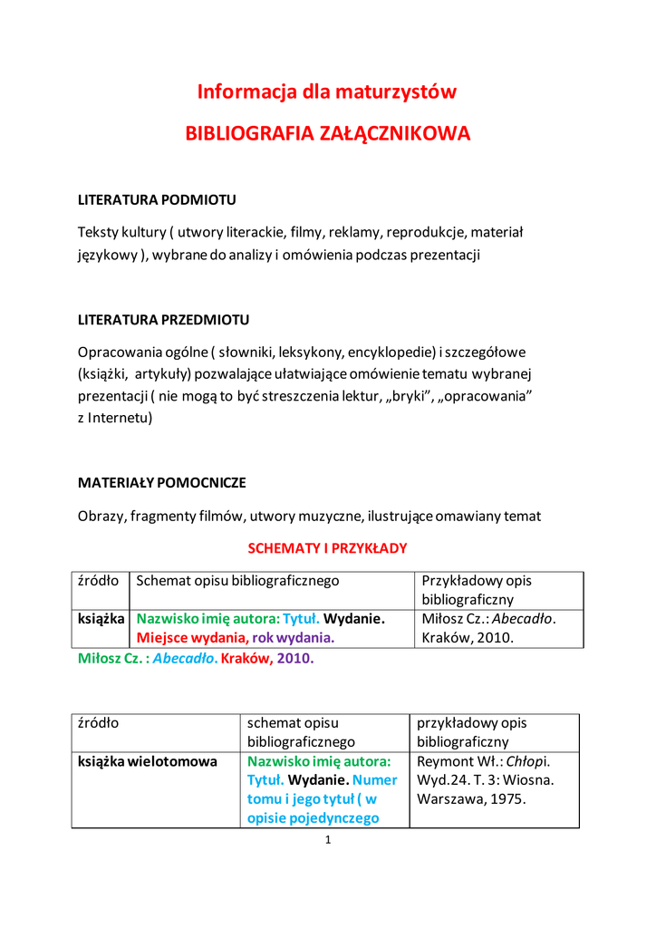 Informacja dla maturzystów BIBLIOGRAFIA ZAŁĄCZNIKOWA