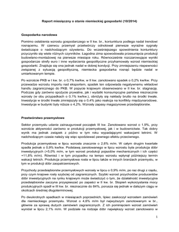 Raport miesięczny o stanie niemieckiej gospodarki (10/2014) Gospodarka narodowa Pomimo osłabienia wzrostu gospodarczego w II kw. br., koniunktura podlega nadal trendowi rosnącemu. W czerwcu przemysł przetwórczy odnotował pierwsze wyraźne sygnały świadczące o nadchodzącym ożywieniu. Do wcześniejszego spowolnienia koniunktury przyczyniło się wiele różnych czynników. Łagodna zima spowodowała przesunięcia produkcji budowlano-montażowej na pierwsze miesiące roku. Równocześnie rozczarowujące wyniki gospodarcze strefy euro i inne wydarzenia geopolityczne przyhamowały wzrost niemieckiej gospodarki. Znajduje się ona jednak nadal w dobrej kondycji. Przy zmniejszeniu niepewności związanej z sytuacją geopolityczną, niemiecka gospodarka rosnąć będzie nadal w umiarkowanym tempie. Po wzroście PKB w I kw. br. o 0,7% kw/kw, w II kw. zanotowano spadek o 0,2% kw/kw. Przy przewadze wzrostu importu nad eksportem, spadek ten odpowiada negatywnemu wkładowi handlu zagranicznego do PKB. W popycie krajowym obserwowano w II kw. br. stagnację. Podczas gdy zarówno spożycie prywatne, jak i wydatki konsumpcyjne państwa nieznacznie wzrosły (w obu przypadkach o 0,1% kw/kw.), obniżyły się nakłady brutto na środki trwałe. Inwestycje w środki trwałe zmniejszyły się o 0,4% jako reakcja na konflikty międzynarodowe. Inwestycje w budynki były niższe o 4,2%. Wzrosły zapasy magazynowe przedsiębiorstw. Przetwórstwo przemysłowe Sektor przemysłu udanie zainaugurował początek III kw. Zanotowano wzrost o 1,9%, przy wzroście aktywności zarówno w produkcji przemysłowej, jak i w budownictwie. Tak dobry wynik ma jednak związek z późno w tym roku wypadającymi wakacjami letnimi. W nadchodzącym czasie należy się więc spodziewać pewnego efektu przeciwnego. Produkcja przemysłowa w lipcu wzrosła znacznie o 2,6% m/m. W całym drugim kwartale spadła jednak o 0,9% kw/kw. Podstawą zanotowanego w lipcu wzrostu była produkcja dóbr inwestycyjnych (+5,0% m/m, w tym wzrost produkcji pojazdów mechanicznych i ich części +11,8% m/m). Również i w tym przypadku na tempo wzrostu wpłynął późniejszy termin wakacji letnich. Produkcja przemysłowa rosła w lipcu także w innych branżach przemysłu, w tym w produkcji dóbr zaopatrzeniowych. Przychody przedsiębiorstw przemysłowych wzrosły w lipcu o 0,9% m/m, po raz drugi z rzędu, przy czym krajowe rosły szybciej od zagranicznych. Szybki wzrost przychodów producentów dóbr inwestycyjnych na rynku krajowym może świadczyć o tym, że działalność inwestycyjna przedsiębiorstw zaczyna przyspieszać po zapaści w II kw. br. Stopień wykorzystania mocy produkcyjnych spadł w III kw. br. nieznacznie do 84%, porusza się jednak w dalszym ciągu w okolicach średniej długoterminowej. Po dwukrotnych spadkach w miesiącach poprzednich, lipiec zaskoczył wzrostem zamówień dla niemieckiego przemysłu. Wzrost o 4,6% m/m był najwyższym zanotowanym w br., głównie za sprawą dużych zamówień zagranicznych. Z ich pominięciem wzrost zamówień wyniósł w lipcu 2,1% m/m. W podziale na rodzaje dóbr największy wzrost zanotowano w 1 grupie dóbr inwestycyjnych (+8,5%). Najszybciej rosły zamówienia z krajów trzecich (+9,8% m/m), zamówienia krajowe wzrosły w lipcu o 1,7% m/m. Wraz z coraz niższą dynamiką koniunktury w II kw. pogarszały się odczyty wskaźników wyprzedzających. Odczyt wskaźnika ZEW, bazującego na ocenach specjalistów z dziedziny finansów, spadł w sierpniu br. po raz 7 z rzędu. Pogorszyły się także nastroje przedsiębiorstw mierzone wskaźnikiem Ifo, publikowanym przez monachijski instytut badań nad gospodarką. Spadki nastrojów związane są ze wzrostem ryzyk związanych z sytuacją geopolityczną. Przemysł znajduje się jednak w dobrej kondycji i przy zmniejszeniu się ryzyk zewnętrznych ponownie uwidocznią się tendencje wzrostowe. Produkcja budowlano-montażowa wzrosła w lipcu o 1,7% m/m, po wzroście w czerwcu wynoszącym 1,0%. Tym samym produkcja kształtowała się na poziomie nieco wyższym niż w słabym II kw. br., jednak zdecydowanie niżej niż w I kw. Perspektywy dla budownictwa są w dalszym ciągu korzystne. Zamówienia zostały w II kw. br. co prawda ograniczone, jednak wcześniejszy wysoki ich poziom sprawił, że portfele zamówień przedsiębiorstw są dobrze wypełnione. Utrzymujące się korzystne warunki finansowania inwestycji ożywiają koniunkturę w budownictwie mieszkaniowym. Rozwija się także budownictwo drogowe i podziemne, opierające się głównie na zamówieniach sektora publicznego. W ostatnim czasie zwolniły natomiast inwestycje budowlane sektora przedsiębiorstw. Tabela 1. Dynamika produkcji przemysłu i zamówień Przemysł Zmiana wolumenu w stosunku do okresu poprzedzającego w %, wyrównana sezonowo Produkcja Łącznie Dobra zaopatrzeniowe Dobra inwestycyjne Dobra konsumpcyjne Obroty Łączne Rynek wewnętrzny Rynki zagraniczne Zamówienia Łączne Rynek wewnętrzny Rynki zagraniczne Dobra zaopatrzeniowe Dobra inwestycyjne Dobra konsumpcyjne I kw II kw 0,9 -1,0 0,9 -1,6 1,1 -0,8 0,9 -0,3 MAJ -1,6 -2,3 -0,3 -3,3 CZE 0,1 0,5 -0,9 1,7 LIP 2,8 0,7 5,5 0,2 1,5 1,7 1,3 -0,9 -1,1 -0,8 -1,8 -3,1 -0,5 1,5 1,7 1,2 0,9 1,3 0,6 0,0 1,9 -1,3 0,3 -0,2 0,4 -0,4 -1,0 0,1 -1,0 -0,2 1,6 -1,7 -2,5 -1,2 -3,4 -0,7 -1,2 -2,8 -1,5 -3,5 2,1 -6,0 -0,6 4,6 1,7 6,9 0,3 8,5 -2,9 Źródło: Federalne Ministerstwo Gospodarki, Schlaglichter der Wirtschaftspolitik, Monatsbericht 10/2014 2 Spożycie prywatne Po wyraźnym wzroście konsumpcji prywatnej o 0,8% kw/kw. w I kw. 2014 roku, II kw. przyniósł kolejny wzrost o 0,1% kw/kw. W porównaniu do roku 2013 wyniki z II kw. były lepsze o 1,0%. Warunki ramowe rozwoju konsumpcji prywatnej są w dalszym ciągu korzystne. Jednocześnie zarówno w handlu detalicznym, jak i u konsumentów widoczna jest niepewność związana z trwającymi konfliktami geopolitycznymi. Przychody w handlu detalicznym zmniejszyły się w lipcu o 1,1%, 