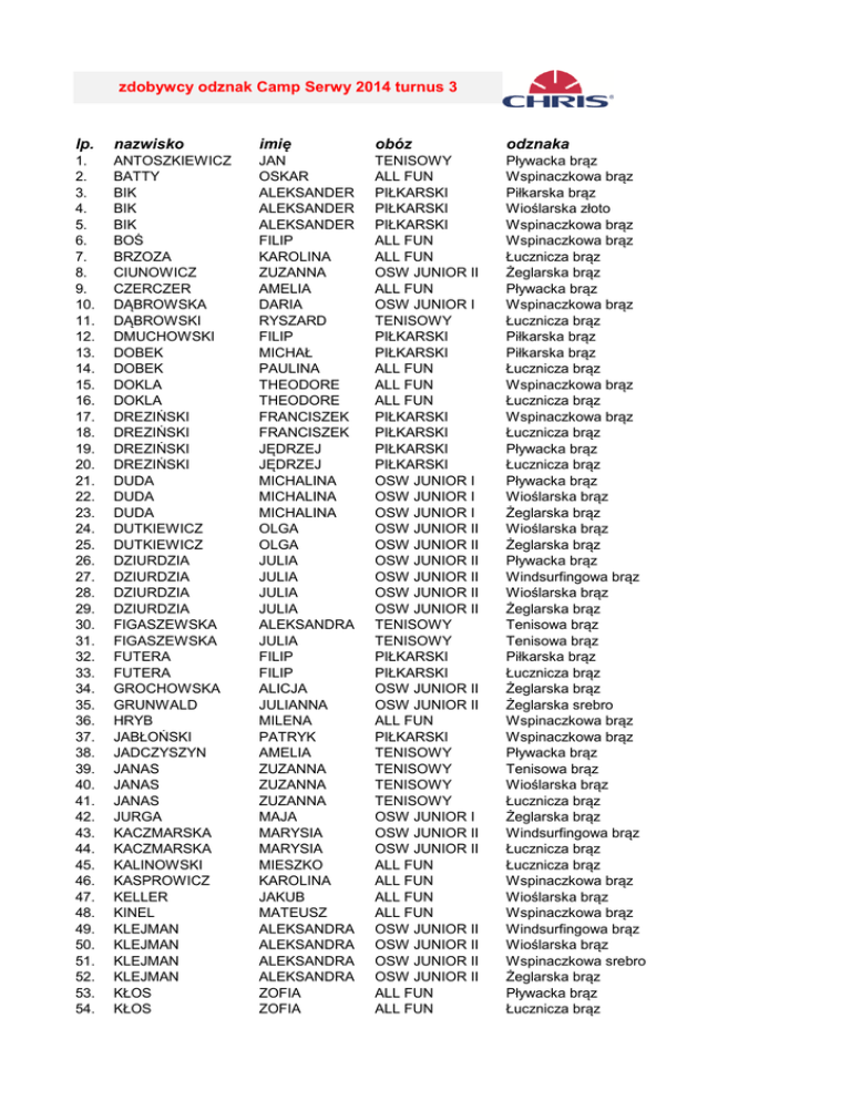 zdobywcy odznak Camp Serwy 2014 turnus 3 lp. nazwisko imię obóz odznaka 1. 2. 3. 4. 5. 6. 7. 8. 9. 10. 11. 12. 13. 14. 15. 16. 17. 18. 19. 20. 21. 22. 23. 24. 25. 26. 27. 28. 29. 30. 31. 32. 33. 34. 35. 36. 37. 38. 39. 40. 41. 42. 43. 44. 45. 46. 47. 48. 49. 50. 51. 52. 53. 54. ANTOSZKIEWICZ BATTY BIK BIK BIK BOŚ BRZOZA CIUNOWICZ CZERCZER DĄBROWSKA DĄBROWSKI DMUCHOWSKI DOBEK DOBEK DOKLA DOKLA DREZIŃSKI DREZIŃSKI DREZIŃSKI DREZIŃSKI DUDA DUDA DUDA DUTKIEWICZ DUTKIEWICZ DZIURDZIA DZIURDZIA DZIURDZIA DZIURDZIA FIGASZEWSKA FIGASZEWSKA FUTERA FUTERA GROCHOWSKA GRUNWALD HRYB JABŁOŃSKI JADCZYSZYN JANAS JANAS JANAS JURGA KACZMARSKA KACZMARSKA KALINOWSKI KASPROWICZ KELLER KINEL KLEJMAN KLEJMAN KLEJMAN KLEJMAN KŁOS KŁOS JAN OSKAR ALEKSANDER ALEKSANDER ALEKSANDER FILIP KAROLINA ZUZANNA AMELIA DARIA RYSZARD FILIP MICHAŁ PAULINA THEODORE THEODORE FRANCISZEK FRANCISZEK JĘDRZEJ JĘDRZEJ MICHALINA MICHALINA MICHALINA OLGA OLGA JULIA JULIA JULIA JULIA ALEKSANDRA JULIA FILIP FILIP ALICJA JULIANNA MILENA PATRYK AMELIA ZUZANNA ZUZANNA ZUZANNA MAJA MARYSIA MARYSIA MIESZKO KAROLINA JAKUB MATEUSZ ALEKSANDRA ALEKSANDRA ALEKSANDRA ALEKSANDRA ZOFIA ZOFIA TENISOWY ALL FUN PIŁKARSKI PIŁKARSKI PIŁKARSKI ALL FUN ALL FUN OSW JUNIOR II ALL FUN OSW JUNIOR I TENISOWY PIŁKARSKI PIŁKARSKI ALL FUN ALL FUN ALL FUN PIŁKARSKI PIŁKARSKI PIŁKARSKI PIŁKARSKI OSW JUNIOR I OSW JUNIOR I OSW JUNIOR I OSW JUNIOR II OSW JUNIOR II OSW JUNIOR II OSW JUNIOR II OSW JUNIOR II OSW JUNIOR II TENISOWY TENISOWY PIŁKARSKI PIŁKARSKI OSW JUNIOR II OSW JUNIOR II ALL FUN PIŁKARSKI TENISOWY TENISOWY TENISOWY TENISOWY OSW JUNIOR I OSW JUNIOR II OSW JUNIOR II ALL FUN ALL FUN ALL FUN ALL FUN OSW JUNIOR II OSW JUNIOR II OSW JUNIOR II OSW JUNIOR II ALL FUN ALL FUN Pływacka brąz Wspinaczkowa brąz Piłkarska brąz Wioślarska złoto Wspinaczkowa brąz Wspinaczkowa brąz Łucznicza brąz Żeglarska brąz Pływacka brąz Wspinaczkowa brąz Łucznicza brąz Piłkarska brąz Piłkarska brąz Łucznicza brąz Wspinaczkowa brąz Łucznicza brąz Wspinaczkowa brąz Łucznicza brąz Pływacka brąz Łucznicza brąz Pływacka brąz Wioślarska brąz Żeglarska brąz Wioślarska brąz Żeglarska brąz Pływacka brąz Windsurfingowa brąz Wioślarska brąz Żeglarska brąz Tenisowa brąz Tenisowa brąz Piłkarska brąz Łucznicza brąz Żeglarska brąz Żeglarska srebro Wspinaczkowa brąz Wspinaczkowa brąz Pływacka brąz Tenisowa brąz Wioślarska brąz Łucznicza brąz Żeglarska brąz Windsurfingowa brąz Łucznicza brąz Łucznicza brąz Wspinaczkowa brąz Wioślarska brąz Wspinaczkowa brąz Windsurfingowa brąz Wioślarska brąz Wspinaczkowa srebro Żeglarska brąz Pływacka brąz Łucznicza brąz 55. 56. 57. 58. 59. 60. 61. 62. 63. 64. 65. 66. 67. 68. 69. 70. 71. 72. 73. 74. 75. 76. 77. 78. 79. 80. 81. 82. 83. 84. 85. 86. 87. 88. 89. 90. 91. 92. 93. 94. 95. 96. 97. 98. 99. 100. 101. 102. 103. 104. 105. 106. 107. 108. 109. 110. 111. 112. 113. KOWALSKA KOWALSKI KOWALSKI KOZŁOWSKI KRYSIK KUDELA KUDELA KUDELA KUŚMIERCZYK KUŚMIERCZYK LATECKA LIZON LIZON ŁUKASZEWSKI MAC MACIEJCZYK MACIOCH MARCHEWKA MATEJKO MIERZEJEWSKA MIERZEJEWSKA MIERZEJEWSKA MISIECKA MISIECKA MISIECKA MISIECKA OLEKSY OMELANIUK ORGANA ORGANA PARZUCHOWSKA PASSOWICZ PIETRUSZKA PIETRUSZKA PLUTA PNIEWSKA PNIEWSKI PNIEWSKI POMIANOWSKA PRUŚ PRZEDMOJSKA PULAWSKI PYCH RADZIMIŃSKA RADZISZEWSKI REGUCKA REGUCKA REGUCKA REGUCKA REGUCKI ROMANIUK ROMANOWSKI ROSIAK ROSIAK ROZWADOWSKI RYMASZEWSKI RZEPKO SAJEWSKA SAWICKA WIKTORIA MIKOLAJ MIKOLAJ JAKUB FRANCISZEK KAMILA KAMILA KAMILA BARTOSZ BARTOSZ JULIA ADA ADA ŁUKASZ ANTONI MARCEL MICHAŁ MICHAŁ SZYMON JULIA JULIA JULIA NADIA NADIA NADIA NADIA IGOR DAWID ZUZANNA ZUZANNA NATALIA STANISŁAW JAN JAN SŁAWOMIR ALICJA MAKSYMILIAN MAKSYMILIAN ZUZANNA KRZYSZTOF ANNA JULIAN JAKUB MARIA JULIUSZ LORETTA LORETTA LORETTA LORETTA FABIAN JAN WIKTOR ANTONI ANTONI IGOR MICHAŁ ANDRZEJ POLA LIDIA ALL FUN OSW JUNIOR II OSW JUNIOR II TENISOWY PIŁKARSKI TENISOWY TENISOWY TENISOWY ALL FUN ALL FUN ALL FUN TENISOWY TENISOWY PIŁKARSKI OSW MŁODZIEŻ OSW JUNIOR II OSW MŁODZIEŻ PIŁKARSKI OSW JUNIOR I OSW JUNIOR II OSW JUNIOR II OSW JUNIOR II OSW JUNIOR II OSW JUNIOR II OSW JUNIOR II OSW JUNIOR II PIŁKARSKI OSW JUNIOR II OSW JUNIOR II OSW JUNIOR II OSW JUNIOR I OSW JUNIOR I OSW JUNIOR II OSW JUNIOR II ALL FUN OSW JUNIOR II OSW JUNIOR I OSW JUNIOR I OSW JUNIOR I OSW MŁODZIEŻ ALL FUN OSW JUNIOR I PIŁKARSKI OSW JUNIOR II ALL FUN OSW JUNIOR II OSW JUNIOR II OSW JUNIOR II OSW JUNIOR II TENISOWY TENISOWY PIŁKARSKI OSW JUNIOR II OSW JUNIOR II OSW JUNIOR II PIŁKARSKI PIŁKARSKI PIŁKARSKI OSW JUNIOR I Wspinaczkowa brąz Windsurfingowa brąz Wspinaczkowa brąz Tenisowa brąz Piłkarska brąz Pływacka brąz Tenisowa brąz Łucznicza brąz Pływacka brąz Łucznicza brąz Pływacka brąz Tenisowa brąz Łucznicza brąz Piłkarska srebro Żeglarska złoto Wioślarska brąz Windsurfingowa srebro Łucznicza brąz Żeglarska brąz Windsurfingowa brąz Wioślarska brąz Żeglarska brąz Wioślarska brąz Wspinaczkowa brąz Żeglarska srebro Łucznicza brąz Pływacka brąz Windsurfingowa brąz Windsurfingowa brąz Wspinaczkowa brąz Żeglarska brąz Żeglarska brąz Windsurfingowa srebro Żeglarska złoto Łucznicza brąz Windsurfingowa brąz Pływacka brąz Żeglarska brąz Łucznicza brąz Wioślarska srebro Wioślarska brąz Żeglarska brąz Piłkarska brąz Windsurfingowa brąz Pływacka brąz Pływacka srebro Windsurfingowa srebro Wspinaczkowa brąz Łucznicza brąz Łucznicza brąz Łucznicza brąz Piłkarska brąz Wspinaczkowa brąz Żeglarska brąz Żeglarska brąz Piłkarska brąz Piłkarska srebro Piłkarska brąz Pływacka brąz 114. 115. 116. 117. 118. 119. 120. 121. 122. 123. 124. 125. 126. 127. 128. 129. 130. 131. 132. 133. 134. 135. 136. 137. 138. 139. SKIPIETROW SKOCZEŃ SKOCZEŃ SKOCZEŃ SŁAWIŃSKI SMOTRYŚ SMOTRYŚ STEFANO SZABELEWSKA SZABELEWSKA SZTACHELSKI SZULCZYK SZULCZYK SZULCZYK SZULCZYK WASIUKIEWICZ WASIUKIEWICZ WASIUKIEWICZ WASI