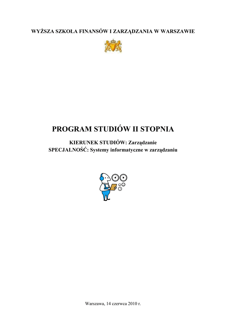 WYśSZA SZKOŁA FINANSÓW I ZARZĄDZANIA W WARSZAWIE PROGRAM STUDIÓW II STOPNIA KIERUNEK STUDIÓW: Zarządzanie SPECJALNOŚĆ: Systemy informatyczne w zarządzaniu Warszawa, 14 czerwca 2010 r. PROGRAM STUDIÓW II stopnia - KIERUNEK STUDIÓW: Zarządzanie SPECJALNOŚĆ: Systemy informatyczne w zarządzaniu SPIS TREŚCI A. UWAGI WSTĘPNE ............................................................................................................ 3 B. KWALIFIKACJE ABSOLWENTA.................................................................................. 3 C. PLAN STUDIÓW................................................................................................................ 4 D. HARMONOGRAM ZAJĘĆ - STUDIA NIESTACJONARNE...................................... 5 E. PRZEDMIOTY PODSTAWOWE..................................................................................... 6 1. ETYKA W ZARZĄDZANIU...................................................................................................... 6 2. MAKROEKONOMIA .............................................................................................................. 6 3. KONCEPCJE ZARZĄDZANIA .................................................................................................. 6 4. PRAWO CYWILNE ................................................................................................................. 6 5. STATYSTYKA MATEMATYCZNA ........................................................................................... 7 F. PRZEDMIOTY KIERUNKOWE ...................................................................................... 7 6. PODSTAWY NEGOCJACJI ...................................................................................................... 7 7. PRZEDSIĘBIORCZOŚĆ ........................................................................................................... 7 8. PRAWO HANDLOWE ............................................................................................................. 7 9. RACHUNKOWOŚĆ ZARZĄDCZA ............................................................................................ 7 10. ZARZĄDZANIE PROCESAMI ................................................................................................ 8 11. ZARZĄDZANIE STRATEGICZNE ........................................................................................... 8 G. PRZEDMIOTY SPECJALNOŚCIOWE .......................................................................... 8 12. DZIEDZINOWE SYSTEMY INFORMATYCZNE ........................................................................ 8 13. KOMPUTEROWE WSPOMAGANIE DECYZJI MENEDśERA ...................................................... 9 14. SYMULACJA KOMPUTEROWA W ZARZĄDZANIU................................................................ 11 15. ZARZĄDZANIE BEZPIECZEŃSTWEM INFORMACJI .............................................................. 12 16. ZARZĄDZANIE PROJEKTAMI ............................................................................................. 12 17. ZINTEGROWANE SYSTEMY ZARZĄDZANIA ....................................................................... 13 H. SEMINARIUM MAGISTERSKIE, PRACA DYPLOMOWA I EGZAMIN DYPLOMOWY ...................................................................................................................... 15 18. SEMINARIUM MAGISTERSKIE ........................................................................................... 15 19. PRACA DYPLOMOWA ....................................................................................................... 15 20. EGZAMINY DYPLOMOWE ................................................................................................. 16 I. UWAGI KOŃCOWE ......................................................................................................... 16 2 PROGRAM STUDIÓW II stopnia - KIERUNEK STUDIÓW: Zarządzanie SPECJALNOŚĆ: Systemy informatyczne w zarządzaniu A. UWAGI WSTĘPNE Efektywny system informatyczny moŜe i powinien wspomagać praktycznie kaŜdy element firmy, wspomagając wszystkie realizowane procesy, w tym działania administracyjne i zarządcze. Systemy informatyczne w zarządzaniu to podstawa sukcesu we współczesnym biznesie. Studia adresowane są przede wszystkim dla absolwentów studiów kierunku „Informatyka” i trwają 4 semestry. Absolwent będzie posiadał podstawową wiedzę z informatyki oraz wiedzę specjalistyczną dotyczącą jej zastosowań. Po ukończeniu studiów i zdaniu egzaminu dyplomowego student otrzymuje tytuł zawodowy magistra w specjalności „Systemy informatyczne w zarządzaniu” na kierunku „Zarządzanie”. Pierwszy cykl w formie studiów niestacjonarnych rozpocznie się 1 października 2010 r. B. KWALIFIKACJE ABSOLWENTA Absolwent studiów magisterskich na kierunku "Zarządzanie” powinien1: posiadać wiedzę teoretyczną i praktyczną z zakresu nauk o zarządzaniu i nauk pokrewnych dotyczącą istoty, prawidłowości i problemów funkcjonowania organizacji (przedsiębiorstw, struktur bezpieczeństwa państwa, instytucji publicznych) oraz sposobów skutecznego i efektywnego rozwiązywania tych problemów; posiadać umiejętności: krytycznej analizy, interpretacji i oceny zjawisk i procesów zarządzania w róŜnej skali, oceny wpływu otoczenia na te zjawiska (procesy) oraz przygotowania i podejmowania decyzji zarządczych, zwłaszcza strategicznych; posiadać umiejętności organizowania pracy zespołowej i kierowania zespołami oraz skutecznego komunikowania się, negocjowania i przekonywania; być przygotowany do pracy na stanowiskach: specjalistycznych w systemie zarządzania, menedŜerów średniego i wyŜszego szczebla, doradców i konsultantów w organizacjach o charakterze gospodarczym lub publicznym, a takŜe do prowadzenia własnej działalności; być przygotowany do podejmowania wyzwań badawczych oraz kontynuacji edukacji na studiach trzeciego stopnia (doktoranck