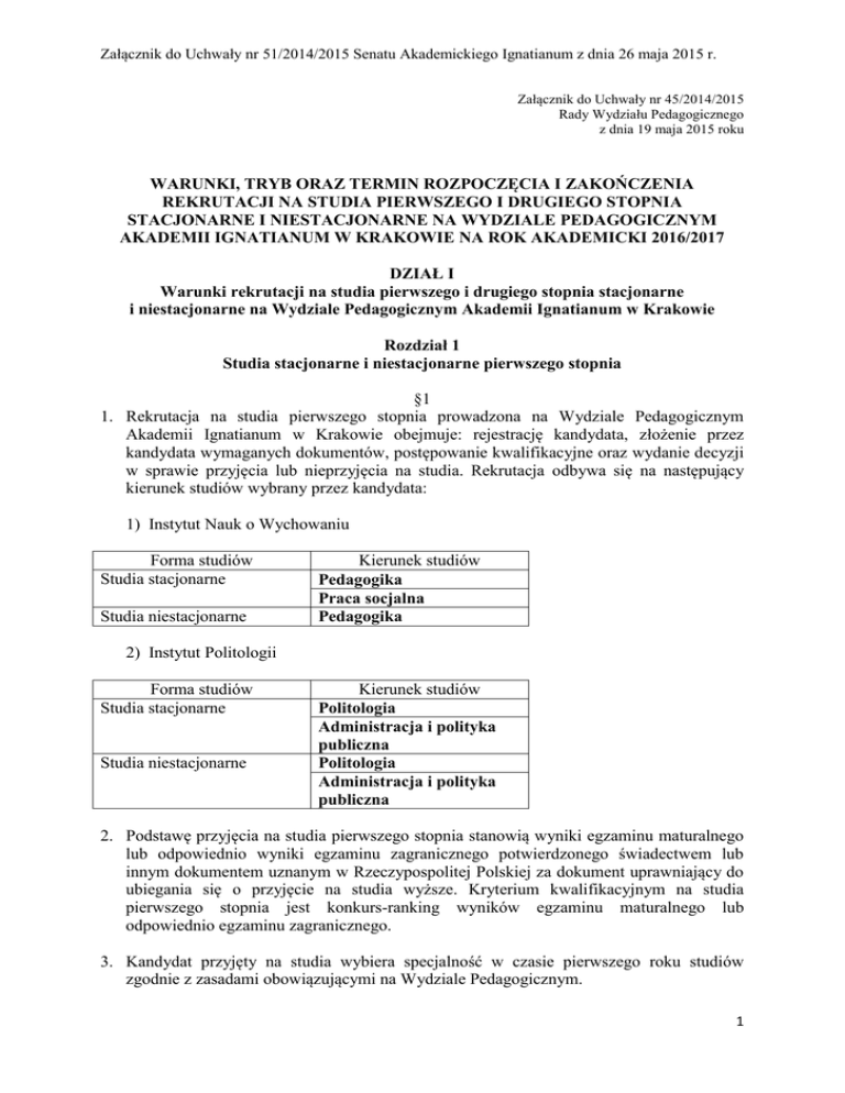 Załącznik do Uchwały nr 51/2014/2015 Senatu Akademickiego Ignatianum z dnia 26 maja 2015 r. Załącznik do Uchwały nr 45/2014/2015 Rady Wydziału Pedagogicznego z dnia 19 maja 2015 roku WARUNKI, TRYB ORAZ TERMIN ROZPOCZĘCIA I ZAKOŃCZENIA REKRUTACJI NA STUDIA PIERWSZEGO I DRUGIEGO STOPNIA STACJONARNE I NIESTACJONARNE NA WYDZIALE PEDAGOGICZNYM AKADEMII IGNATIANUM W KRAKOWIE NA ROK AKADEMICKI 2016/2017 DZIAŁ I Warunki rekrutacji na studia pierwszego i drugiego stopnia stacjonarne i niestacjonarne na Wydziale Pedagogicznym Akademii Ignatianum w Krakowie Rozdział 1 Studia stacjonarne i niestacjonarne pierwszego stopnia §1 1. Rekrutacja na studia pierwszego stopnia prowadzona na Wydziale Pedagogicznym Akademii Ignatianum w Krakowie obejmuje: rejestrację kandydata, złożenie przez kandydata wymaganych dokumentów, postępowanie kwalifikacyjne oraz wydanie decyzji w sprawie przyjęcia lub nieprzyjęcia na studia. Rekrutacja odbywa się na następujący kierunek studiów wybrany przez kandydata: 1) Instytut Nauk o Wychowaniu Forma studiów Studia stacjonarne Studia niestacjonarne Kierunek studiów Pedagogika Praca socjalna Pedagogika 2) Instytut Politologii Forma studiów Studia stacjonarne Studia niestacjonarne Kierunek studiów Politologia Administracja i polityka publiczna Politologia Administracja i polityka publiczna 2. Podstawę przyjęcia na studia pierwszego stopnia stanowią wyniki egzaminu maturalnego lub odpowiednio wyniki egzaminu zagranicznego potwierdzonego świadectwem lub innym dokumentem uznanym w Rzeczypospolitej Polskiej za dokument uprawniający do ubiegania się o przyjęcie na studia wyższe. Kryterium kwalifikacyjnym na studia pierwszego stopnia jest konkurs-ranking wyników egzaminu maturalnego lub odpowiednio egzaminu zagranicznego. 3. Kandydat przyjęty na studia wybiera specjalność w czasie pierwszego roku studiów zgodnie z zasadami obowiązującymi na Wydziale Pedagogicznym. 1 Załącznik do Uchwały nr 51/2014/2015 Senatu Akademickiego Ignatianum z dnia 26 maja 2015 r. 4. Studia stacjonarne i niestacjonarne pierwszego stopnia prowadzone będą w następujących specjalnościach: 1) Instytut Nauk o Wychowaniu studia stacjonarne kierunek studiów specjalność studiów studia niestacjonarne kierunek studiów Edukacja i opieka pozaszkolna z animacją środowiskową Pedagogika Praca socjalna Pedagogika resocjalizacyjna z profilaktyką społeczną Wychowanie przedszkolne i edukacja wczesnoszkolna Praca socjalna z dzieckiem i rodziną Aktywizacja, poradnictwo i wsparcie osób starszych i niepełnosprawnych Praca socjalna z migrantami i uchodźcami Pedagogika specjalność studiów Edukacja i opieka pozaszkolna z animacją środowiskową Pedagogika resocjalizacyjna z profilaktyką społeczną Wychowanie przedszkolne i edukacja wczesnoszkolna 2) Instytut Politologii studia stacjonarne kierunek studiów Politologia specjalność studiów Bezpieczeństwo publiczne Zarządzanie informacją i media Public relations i marketing polityczny International Politics and Communication Administracja publiczna i służby państwowe Administracja samorządowa i fundusze europejskie Administracja Analityk i koordynator polityk i polityka publicznych w administracji publiczna Administration and Public Policy in the European Union studia niestacjonarne kierunek studiów specjalność studiów Bezpieczeństwo publiczne Zarządzanie informacją i media Politologia Public relations i marketing polityczny International Politics and Communication Administracja publiczna i służby państwowe Administracja samorządowa i fundusze europejskie Administracja Analityk i koordynator i polityka polityk publicznych w publiczna administracji Administration and Public Policy in the European Union 5. W postępowaniu kwalifikacyjnym na każdy kierunek studiów brane są pod uwagę trzy przedmioty z części pisemnej: 2 Załącznik do Uchwały nr 51/2014/2015 Senatu Akademickiego Ignatianum z dnia 26 maja 2015 r. 1) W przypadku kandydatów zdających egzamin maturalny po raz pierwszy w roku 2016 w technikum i od roku 2015 w liceum ogólnokształcącym uwzględniane są wyłącznie wyniki uzyskane w części pisemnej z trzech przedmiotów według następującego porządku: Przedmiot trzeci – do wyboru spośród Przedmiot pierwszy Przedmiot drugi obowiązkowy – obowiązkowy – obowiązkowy – dodatkowy - poziom poziom poziom podstawowy poziom podstawowy rozszerzony podstawowy współczynnik współczynnik współczynnik współczynnik przeliczeniowy 0,1 przeliczeniowy 0,1 przeliczeniowy 0,1 przeliczeniowy 0,15 Biologia Chemia Filozofia Fizyka Geografia Historia Historia muzyki Historia sztuki Informatyka Język łaciński i Język obcy kultura antyczna Język polski Matematyka nowożytny Język mniejszości etnicznej Język mniejszości narodowej Język obcy nowożytny Język polski Język regionalny Matematyka Wiedza o społeczeństwie a) Ustala się następujący współczynnik przeliczeniowy punktów procentowych na punkty rankingowe: poziom podstawowy – współczynnik 0,1 (np. 70% x 0,1 = 7 punktów rankingowych) poziom rozszerzony – współczynnik 0,15 (np. 70% x 0,15 = 10,5 punktów rankingowych). b) W przypadku gdy kandydat zdawał więcej niż jeden przedmiot dodatkowy, wskazuje się ten, z którego uzyskano lepszy wynik rankingowy. 2) W przypadku kandydatów, którzy zdawali egzamin maturalny według tzw. „nowej matury”: w latach 2002-2014 w liceum ogólnokształcącym oraz w latach 2002-2015 w technikum uwzględniane są wyłącznie wyniki uzyskane w części pisemnej (zewnętrznej). 3 Załącznik do Uchwały nr 51/2014/2015 Senatu Akademickiego Ignatianum z dnia 26 maja 2015 r. Przedmiot pierwszy Język polski Przedmiot drugi Przedmiot trzeci – do wyboru spośród Język obcy Biologia (Biologia z higieną i ochroną środowiska) Chemia Filozofia Fizyka i astronomia Geografia Historia Historia muzyki Historia sztuki Informatyka Język kaszubski Język łaciński i kultura 