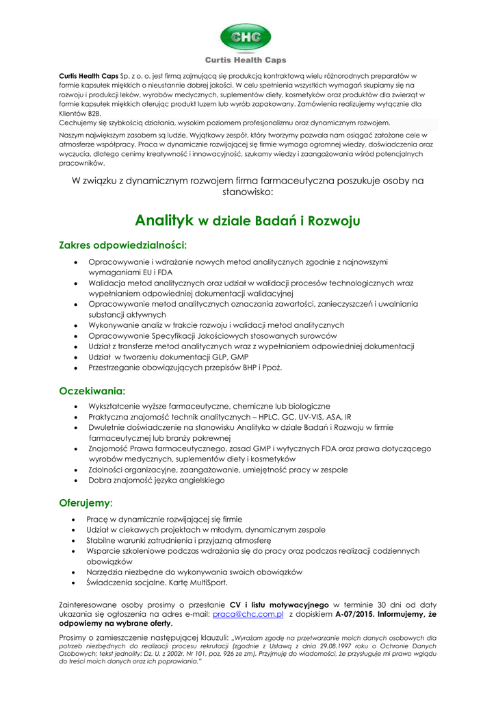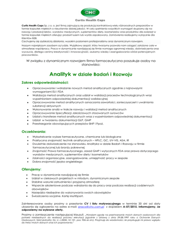 Curtis Health Caps Sp. z o. o. jest firmą zajmującą się produkcją kontraktową wielu różnorodnych preparatów w formie kapsułek miękkich o nieustannie dobrej jakości. W celu spełnienia wszystkich wymagań skupiamy się na rozwoju i produkcji leków, wyrobów medycznych, suplementów diety, kosmetyków oraz produktów dla zwierząt w formie kapsułek miękkich oferując produkt luzem lub wyrób zapakowany. Zamówienia realizujemy wyłącznie dla Klientów B2B. Cechujemy się szybkością działania, wysokim poziomem profesjonalizmu oraz dynamicznym rozwojem. Naszym największym zasobem są ludzie. Wyjątkowy zespół, który tworzymy pozwala nam osiągać założone cele w atmosferze współpracy. Praca w dynamicznie rozwijającej się firmie wymaga ogromnej wiedzy, doświadczenia oraz wyczucia, dlatego cenimy kreatywność i innowacyjność, szukamy wiedzy i zaangażowania wśród potencjalnych pracowników. W związku z dynamicznym rozwojem firma farmaceutyczna poszukuje osoby na stanowisko: Analityk w dziale Badań i Rozwoju Zakres odpowiedzialności: Opracowywanie i wdrażanie nowych metod analitycznych zgodnie z najnowszymi wymaganiami EU i FDA Walidacja metod analitycznych oraz udział w walidacji procesów technologicznych wraz wypełnianiem odpowiedniej dokumentacji walidacyjnej Opracowywanie metod analitycznych oznaczania zawartości, zanieczyszczeń i uwalniania substancji aktywnych Wykonywanie analiz w trakcie rozwoju i walidacji metod analitycznych Opracowywanie Specyfikacji Jakościowych stosowanych surowców Udział z transferze metod analitycznych wraz z wypełnianiem odpowiedniej dokumentacji Udział w tworzeniu dokumentacji GLP, GMP Przestrzeganie obowiązujących przepisów BHP i Ppoż. Oczekiwania: Wykształcenie wyższe farmaceutyczne, chemiczne lub biologiczne Praktyczna znajomość technik analitycznych – HPLC, GC, UV-VIS, ASA, IR Dwuletnie doświadczenie na stanowisku Analityka w dziale Badań i Rozwoju w firmie farmaceutycznej lub branży pokrewnej Znajomość Prawa farmaceutycznego, zasad GMP i wytycznych FDA oraz prawa dotyczącego wyrobów medycznych, suplementów diety i kosmetyków Zdolności organizacyjne, zaangażowanie, umiejętność pracy w zespole Dobra znajomość języka angielskiego Oferujemy: Pracę w dynamicznie rozwijającej się firmie Udział w ciekawych projektach w młodym, dynamicznym zespole Stabilne warunki zatrudnienia i przyjazną atmosferę Wsparcie szkoleniowe podczas wdrażania się do pracy oraz podczas realizacji codziennych obowiązków Narzędzia niezbędne do wykonywania swoich obowiązków Świadczenia socjalne. Kartę MultiSport. Zainteresowane osoby prosimy o przesłanie CV i listu motywacyjnego w terminie 30 dni od daty ukazania się ogłoszenia na adres e-mail: [email protected] z dopiskiem A-07/2015. Informujemy, że odpowiemy na wybrane oferty. Prosimy o zamieszczenie następującej klauzuli: „Wyrażam zgodę na przetwarzanie moich danych osobowych dla potrzeb niezbędnych do realizacji procesu rekrutacji (zgodnie z Ustawą z dnia 29.08.1997 roku o Ochronie Danych Osobowych; tekst jednolity: Dz. U. z 2002r. Nr 101, poz. 926 ze zm). Przyjmuję do wiadomości, że przysługuje mi prawo wglądu do treści moich danych oraz ich poprawiania.”
