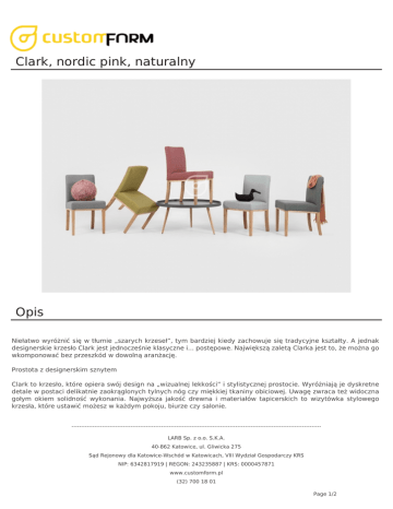 Clark, nordic pink, naturalny Opis Niełatwo wyróżnić się w tłumie „szarych krzeseł”, tym bardziej kiedy zachowuje się tradycyjne kształty. A jednak designerskie krzesło Clark jest jednocześnie klasyczne i... postępowe. Największą zaletą Clarka jest to, że można go wkomponować bez przeszkód w dowolną aranżację. Prostota z designerskim sznytem Clark to krzesło, które opiera swój design na „wizualnej lekkości” i stylistycznej prostocie. Wyróżniają je dyskretne detale w postaci delikatnie zaokrąglonych tylnych nóg czy miękkiej tkaniny obiciowej. Uwagę zwraca też widoczna gołym okiem solidność wykonania. Najwyższa jakość drewna i materiałów tapicerskich to wizytówka stylowego krzesła, które ustawić możesz w każdym pokoju, biurze czy salonie. ----------------------------------------------------------------------------------------------------------------------------------LARB Sp. z o.o. S.K.A. 40-862 Katowice, ul. Gliwicka 275 Sąd Rejonowy dla Katowice-Wschód w Katowicach, VIII Wydział Gospodarczy KRS NIP: 6342817919 | REGON: 243235887 | KRS: 0000457871 www.customform.pl (32) 700 18 01 Page 1/2 Uwaga! Wybierz kolor, który najbardziej Ci odpowiada! Dostępna kolorystyka tapicerki w załącznikach: "Próbnik tkanin - I, II, III grupa cenowa”. Cena uzależniona jest od rodzaju wybranej tkaniny. Drewniane element wykończenia produktu możemy wykonać w kolorach naturalny - jasne drewno, orzech - ciemne drewno, biały oraz czarny. Specyfikacja Wysokość 84/s.47 cm Szerokość 46 cm Głębokość 58 cm Głębokość siedziska 44 cm Wykończenie Siedzisko tkanina: 100% poliester, wypełnienie: pianka wysoko elastyczna tkanina Podstawa drewno Dodatkowe zdjęcia ----------------------------------------------------------------------------------------------------------------------------------LARB Sp. z o.o. S.K.A. 40-862 Katowice, ul. Gliwicka 275 Sąd Rejonowy dla Katowice-Wschód w Katowicach, VIII Wydział Gospodarczy KRS NIP: 6342817919 | REGON: 243235887 | KRS: 0000457871 www.customform.pl (32) 700 18 01 Page 2/2 Powered by TCPDF (www.tcpdf.org)