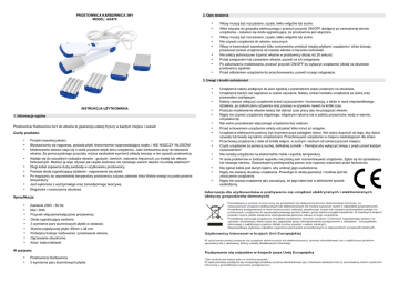 PROSTOWNICA KARBOWNICA 3W1 MODEL: AG470 2. Opis działania • • • • • • • • • Włosy muszą być rozczesane, czyste, lekko wilgotne lub suche. Włóż wtyczkę do gniazdka elektrycznego i przesuń przycisk ON/OFF dostępny po zewnętrznej stronie urządzenia - zaświeci się dioda sygnalizująca, że prostownica jest włączona. Włosy muszą być rozczesane, czyste, lekko wilgotne lub suche. Nie używać urządzenia do włosów sztucznych. Włosy w kosmykach szerokości kilku centymetrów umieścić między płytkami urządzenia i silnie ścisnąć, przesuwać powoli urządzenie od nasady włosów w kierunku końcówek. Nie należy jednorazowo trzymać włosów w prostownicy dłużej niż 20 sekund. Przed związaniem lub czesaniem włosów, pozwól na ich ostygnięcie. Po zakończeniu modelowania, przesuń przycisk ON/OFF by wyłączyć urządzenie (dioda na obudowie prostownicy zgaśnie) Przed odłożeniem urządzenia do przechowywania, pozwól na jego ostygnięcie. 3. Uwagi i środki ostrożności • • • INSTRUKCJA UŻYTKOWANIA 1. Informacje ogólne Prostownica/ Karbownica 3w1 do włosów to gwarancja udanej fryzury w każdym miejscu i czasie! Cechy produktu: • • • • • • • • • Produkt wysokiej jakości. Błyskawicznie się nagrzewa, posiada płytki równomiernie rozprowadzające ciepło, i NIE NISZCZY WŁOSÓW! Modelowanie włosów staje się o wiele prostsze dzięki temu urządzeniu. Jako karbownica służy do falowania włosów. Za pomocą jednego przycisku można swobodnie wymienić wkłady tworząc w ten sposób prostownicę. Nadaje się do wszystkich rodzajów włosów : grubych, cienkich, naturalnie kręconych, po trwałej lub włosów farbowanych. Możesz ją więc używać jak często zechcesz nie narażając swoich włosów na utratę witalności! Długi kabel zapewnia dużą swobodę w użytkowaniu prostownicy. Posiada diodę sygnalizującą działanie - nagrzewanie się płytek. Po nagrzaniu do odpowiedniej temperatury prostownica zużywa zaledwie kilka Watów energii na podtrzymanie temperatury. Jest wykonana z wytrzymałego oraz żaroodpornego tworzywa. Elegancka i nowoczesna obudowa. • • • • • • • • • • • • Urządzenie należy podłączyć do sieci zgodnej z parametrami prądu podanymi na obudowie. Urządzenie bardzo się nagrzewa w czasie używania. Należy unikać kontaktu urządzenia ze skórą oraz przewodem zasilającym. Należy zawsze odłączyć urządzenie przed czyszczeniem i konserwacją, a także w razie nieprawidłowego działania, po zakończeniu używania oraz przerwy w używaniu nawet na krótki czas. Podczas modelowania włosów należy tak dobrać czas pracy aby nie przegrzać włosów. Nigdy nie używać urządzenia wilgotnego, wilgotnymi rękoma lub w pobliżu pryszniców, wody w wannie, umywalce itp. Nie wolno pozostawiać włączonego urządzenia bez nadzoru. Przed schowaniem urządzenia należy odczekać kilka minut aż ostygnie. Urządzenia elektryczne powinny być trzymane poza zasięgiem dzieci. Nie wolno dopuścić do tego, aby dzieci używały lub bawiły się takimi urządzeniami. Przechowywać urządzenie w miejscu niedostępnym dla dzieci. Przechowuj urządzenie z dala od źródła wilgoci, w suchym i wolnym od zanieczyszczeń miejscu. Czyść urządzenie za pomocą suchej, delikatnej szmatki - Pamiętaj aby wyłączyć lampę z prądu przed każdym czyszczeniem! Nie narażaj urządzenia na ekstremalnie niskie i wysokie temperatury. W razie problemów w żadnym wypadku nie próbuj sam rozmontowywać urządzenia. Zgłoś się do sprzedawcy lub naszego serwisu. Gwarantujemy profesjonalną pomoc oraz naprawy wykonane przez fachowców. Nie zginać kabla pod dużym kątem, aby uniknąć jego uszkodzenia. Nigdy nie otwieraj obudowy urządzenia. Powoduje to utratę gwarancji i możliwe jest też zniszczenie urządzenia. Nigdy nie używaj urządzenia gdy zauważysz, że jego kabel jest w jakikolwiek sposób uszkodzony. Specyfikacja: • • • • • • • • • Zasilanie 230V - 50 Hz. Moc: 20W. Przycisk włączania/wyłączania prostownicy. Dioda sygnalizująca zasilanie. 3 wymienne pary aluminiowych płytek w zestawie. Wymiar pojedynczej płytki: 65mm x 48 mm. Podwójna funkcja: karbowanie i prostowanie włosów. Ogrzewanie obustronne. Kolor: biało-niebieski. W zestawie: • • Prostownica/ Karbownica. 3 wymienne pary aluminiowych płytek. Deklaracja zgodności do pobrania pod adresem: http://www.aptel.pl